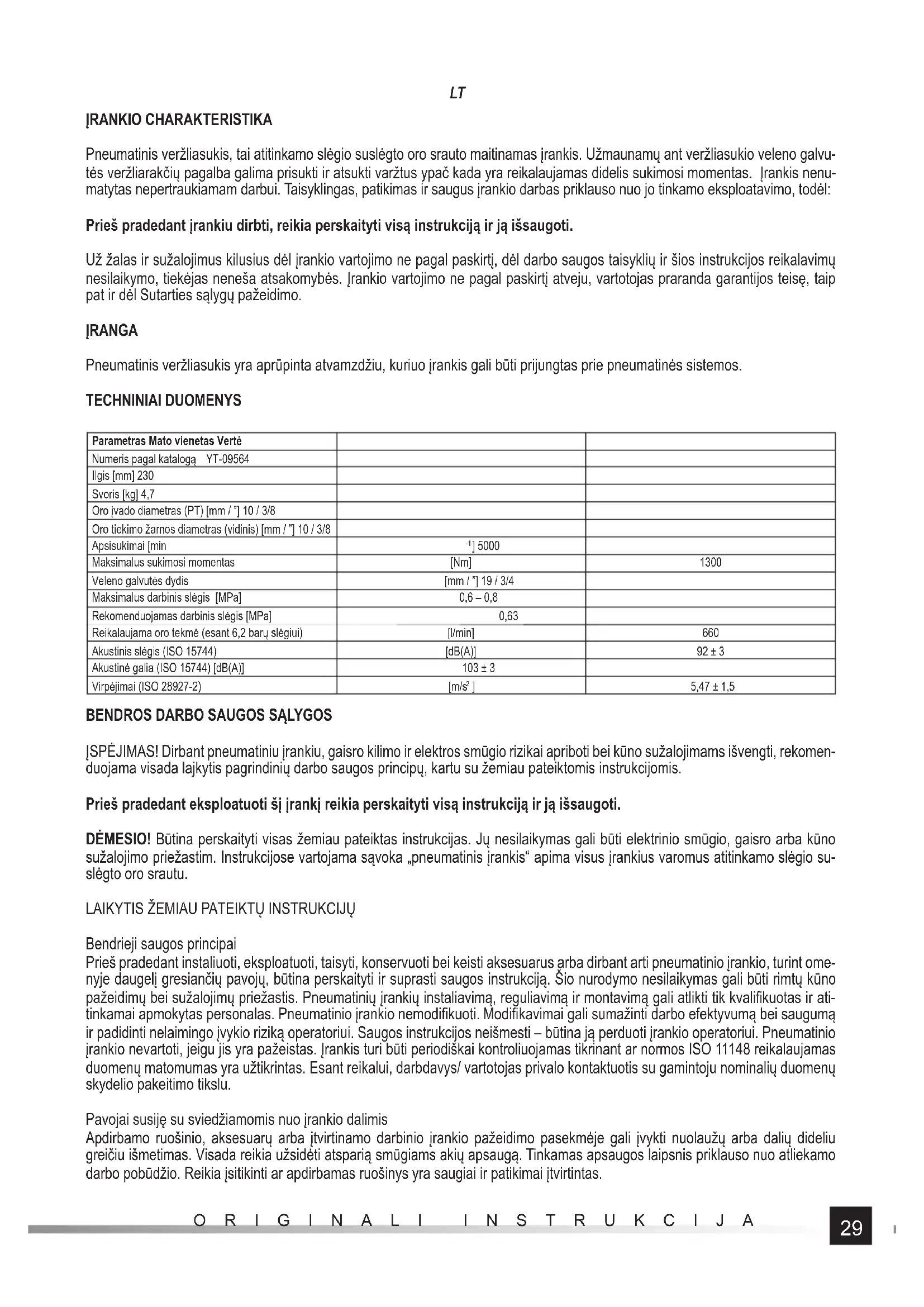 ĮRANKIO CHARAKTERISTIKA Pneumatinis veržliasukis, tai atitinkamo slėgio suslėgto oro srauto maitinamas įrankis. Užmaunamų ant veržliasukio veleno galvu- tės veržliarakčių pagalba galima prisukti ir atsukti varžtus ypač kada yra reikalaujamas didelis sukimosi momentas. Įrankis nenu- matytas nepertraukiamam darbui. Taisyklingas, patikimas ir saugus įrankio darbas priklauso nuo jo tinkamo eksploatavimo, todėl: Prieš pradedant įrankiu dirbti, reikia perskaityti visą instrukciją ir ją išsaugoti. Už žalas ir sužalojimus kilusius dėl įrankio vartojimo ne pagal paskirtį, dėl darbo saugos taisyklių ir šios instrukcijos reikalavimų nesilaikymo, tiekėjas neneša atsakomybės. Įrankio vartojimo ne pagal paskirtį atveju, vartotojas praranda garantijos teisę, taip pat ir dėl Sutarties sąlygų pažeidimo. ĮRANGA Pneumatinis veržliasukis yra aprūpinta atvamzdžiu, kuriuo įrankis gali būti prijungtas prie pneumatinės sistemos. TECHNINIAI DUOMENYS Parametras Mato vienetas Vertė Numeris pagal katalogą YT-09564 Ilgis [mm] 230 Svoris [kg] 4,7 Oro įvado diametras (PT) [mm / ”] 10 / 3/8 Oro tiekimo žarnos diametras (vidinis) [mm / ”] 10 / 3/8 Apsisukimai [min