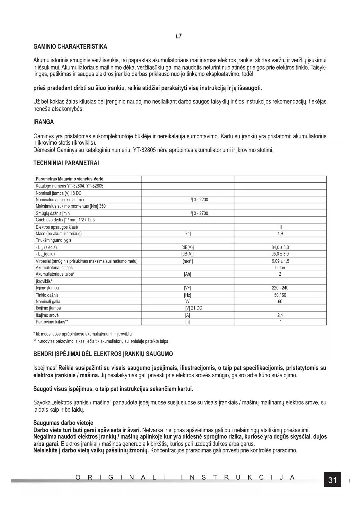- tik modeliuose aprūpintuose akumuliatoriumi ir įkrovikliu ** nurodytas pakrovimo laikas liečia tik akumuliatorių su lentelėje pateikta talpa. BENDRI ĮSPĖJIMAI DĖL ELEKTROS ĮRANKIŲ SAUGUMO Įspėjimas! Reikia susipažinti su visais saugumo įspėjimais, iliustracijomis, o taip pat specifi kacijomis, pristatytomis su elektros įrankiais / mašina. Jų nesilaikymas gali privesti prie elektros srovės smūgio, gaisro arba kūno sužalojimo. Saugoti visus įspėjimus, o taip pat instrukcijas sekančiam kartui. Sąvoka „elektros įrankis / mašina” panaudota įspėjimuose susijusiuose su visais įrankiais / mašinų maitinamų elektros srove, su laidais kaip ir be laidų. Saugumas darbo vietoje Darbo vieta turi būti gerai apšviesta ir švari. Netvarka ir silpnas apšvietimas gali būti nelaimingų atsitikimų priežastimi. Negalima naudoti elektros įrankių / mašinų aplinkoje kur yra didesnė sprogimo rizika, kuriose yra degūs skysčiai, dujos arba garai. Elektros įrankiai / mašinos generuoja kibirkštis, kurios gali uždegti dulkes arba garus. Neleiskite į darbo vietą vaikų pašalinių žmonių. Koncentracijos praradimas gali privesti prie kontrolės praradimo.32 ORIGINALI INSTRUKCIJA