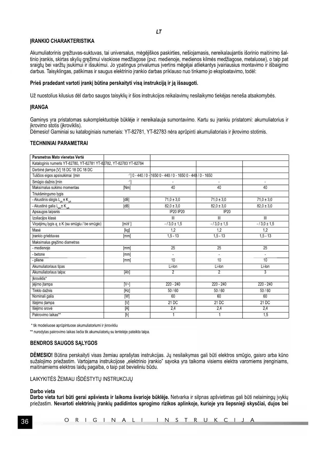 ĮRANKIO CHARAKTERISTIKA Akumuliatorinis gręžtuvas-suktuvas, tai universalus, mėgėjiškos paskirties, nešiojamasis, nereikalaujantis išorinio maitinimo šal- tinio įrankis, skirtas skylių gręžimui visokiose medžiagose (pvz. medienoje, medienos kilmės medžiagose, metaluose), o taip pat sraigtų bei varžtų įsukimui ir išsukimui. Jo ypatingus privalumus įvertins mėgėjai atliekantys įvairiausius montavimo ir išbaigimo darbus. Taisyklingas, patikimas ir saugus elektrinio įrankio darbas priklauso nuo tinkamo jo eksploatavimo, todėl: Prieš pradedant vartoti įrankį būtina perskaityti visą instrukciją ir ją išsaugoti. Už nuostolius kilusius dėl darbo saugos taisyklių ir šios instrukcijos reikalavimų nesilaikymo tiekėjas neneša atsakomybės. ĮRANGA Gaminys yra pristatomas sukomplektuotoje būklėje ir nereikalauja sumontavimo. Kartu su įrankiu pristatomi: akumuliatorius ir įkrovimo stotis (įkroviklis). Dėmesio! Gaminiai su kataloginiais numeriais: YT-82781, YT-82783 nėra aprūpinti akumuliatoriais ir įkrovimo stotimis. TECHNINIAI PARAMETRAI Parametras Mato vienetas Vertė Kataloginis numeris YT-82780, YT-82781 YT-82782, YT-82783 YT-82784 Darbinė įtampa [V] 18 DC 18 DC 18 DC Tuščios eigos apsisukimai [min