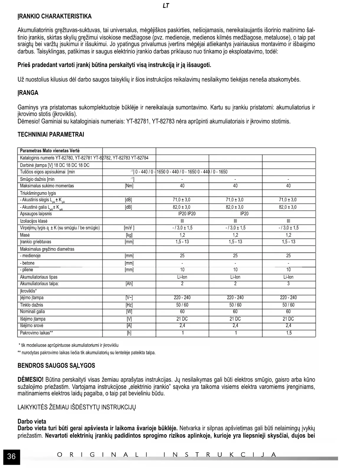 ĮRANKIO CHARAKTERISTIKA Akumuliatorinis gręžtuvas-suktuvas, tai universalus, mėgėjiškos paskirties, nešiojamasis, nereikalaujantis išorinio maitinimo šal- tinio įrankis, skirtas skylių gręžimui visokiose medžiagose (pvz. medienoje, medienos kilmės medžiagose, metaluose), o taip pat sraigtų bei varžtų įsukimui ir išsukimui. Jo ypatingus privalumus įvertins mėgėjai atliekantys įvairiausius montavimo ir išbaigimo darbus. Taisyklingas, patikimas ir saugus elektrinio įrankio darbas priklauso nuo tinkamo jo eksploatavimo, todėl: Prieš pradedant vartoti įrankį būtina perskaityti visą instrukciją ir ją išsaugoti. Už nuostolius kilusius dėl darbo saugos taisyklių ir šios instrukcijos reikalavimų nesilaikymo tiekėjas neneša atsakomybės. ĮRANGA Gaminys yra pristatomas sukomplektuotoje būklėje ir nereikalauja sumontavimo. Kartu su įrankiu pristatomi: akumuliatorius ir įkrovimo stotis (įkroviklis). Dėmesio! Gaminiai su kataloginiais numeriais: YT-82781, YT-82783 nėra aprūpinti akumuliatoriais ir įkrovimo stotimis. TECHNINIAI PARAMETRAI Parametras Mato vienetas Vertė Kataloginis numeris YT-82780, YT-82781 YT-82782, YT-82783 YT-82784 Darbinė įtampa [V] 18 DC 18 DC 18 DC Tuščios eigos apsisukimai [min