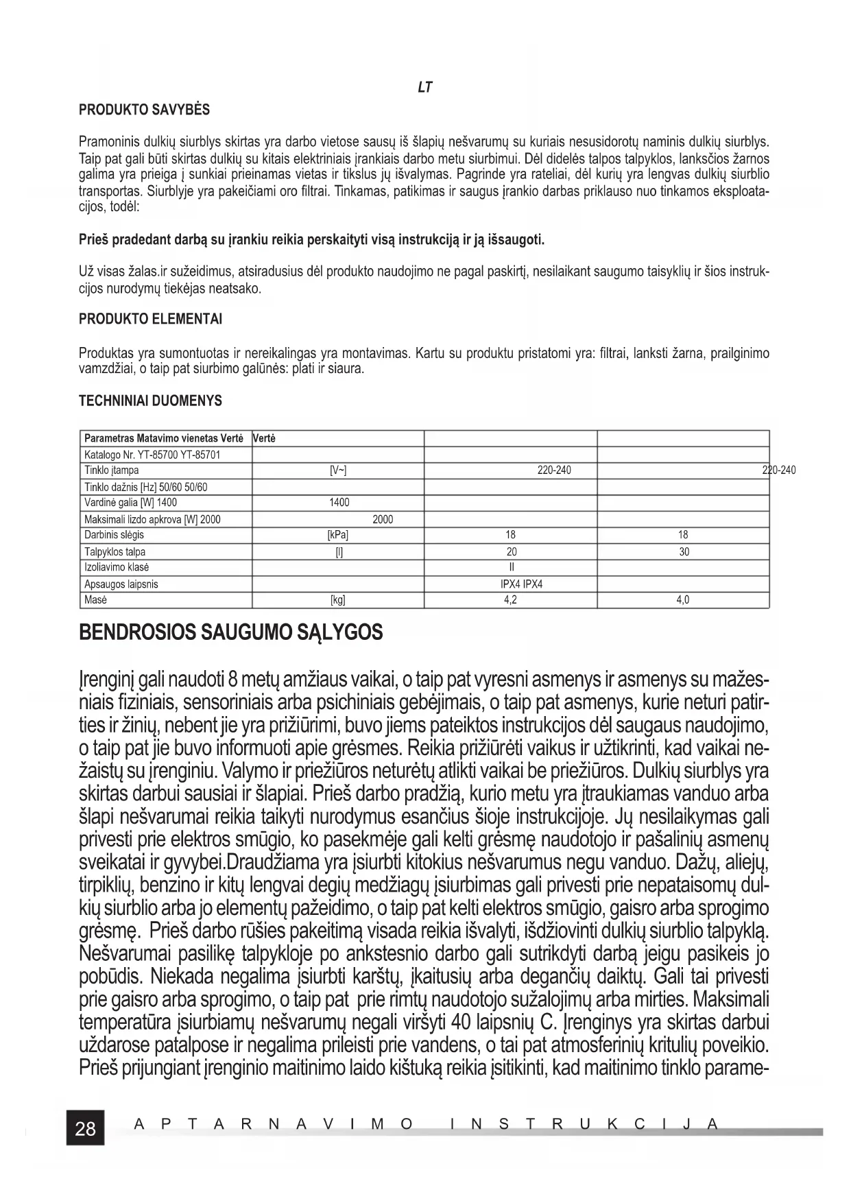 Pramoninis dulkių siurblys skirtas yra darbo vietose sausų iš šlapių nešvarumų su kuriais nesusidorotų naminis dulkių siurblys. Taip pat gali būti skirtas dulkių su kitais elektriniais įrankiais darbo metu siurbimui. Dėl didelės talpos talpyklos, lanksčios žarnos galima yra prieiga į sunkiai prieinamas vietas ir tikslus jų išvalymas. Pagrinde yra rateliai, dėl kurių yra lengvas dulkių siurblio transportas. Siurblyje yra pakeičiami oro fi ltrai. Tinkamas, patikimas ir saugus įrankio darbas priklauso nuo tinkamos eksploata- cijos, todėl: Prieš pradedant darbą su įrankiu reikia perskaityti visą instrukciją ir ją išsaugoti. Už visas žalas.ir sužeidimus, atsiradusius dėl produkto naudojimo ne pagal paskirtį, nesilaikant saugumo taisyklių ir šios instruk- cijos nurodymų tiekėjas neatsako. PRODUKTO ELEMENTAI Produktas yra sumontuotas ir nereikalingas yra montavimas. Kartu su produktu pristatomi yra: fi ltrai, lanksti žarna, prailginimo vamzdžiai, o taip pat siurbimo galūnės: plati ir siaura. TECHNINIAI DUOMENYS Parametras Matavimo vienetas Vertė Vertė Katalogo Nr. YT-85700 YT-85701 Tinklo įtampa [V~] 220-240 220-240 Tinklo dažnis [Hz] 50/60 50/60 Vardinė galia [W] 1400 1400 Maksimali lizdo apkrova [W] 2000 2000 Darbinis slėgis [kPa] 18 18 Talpyklos talpa [l] 20 30 Izoliavimo klasė II Apsaugos laipsnis IPX4 IPX4 Masė [kg] 4,2 4,0