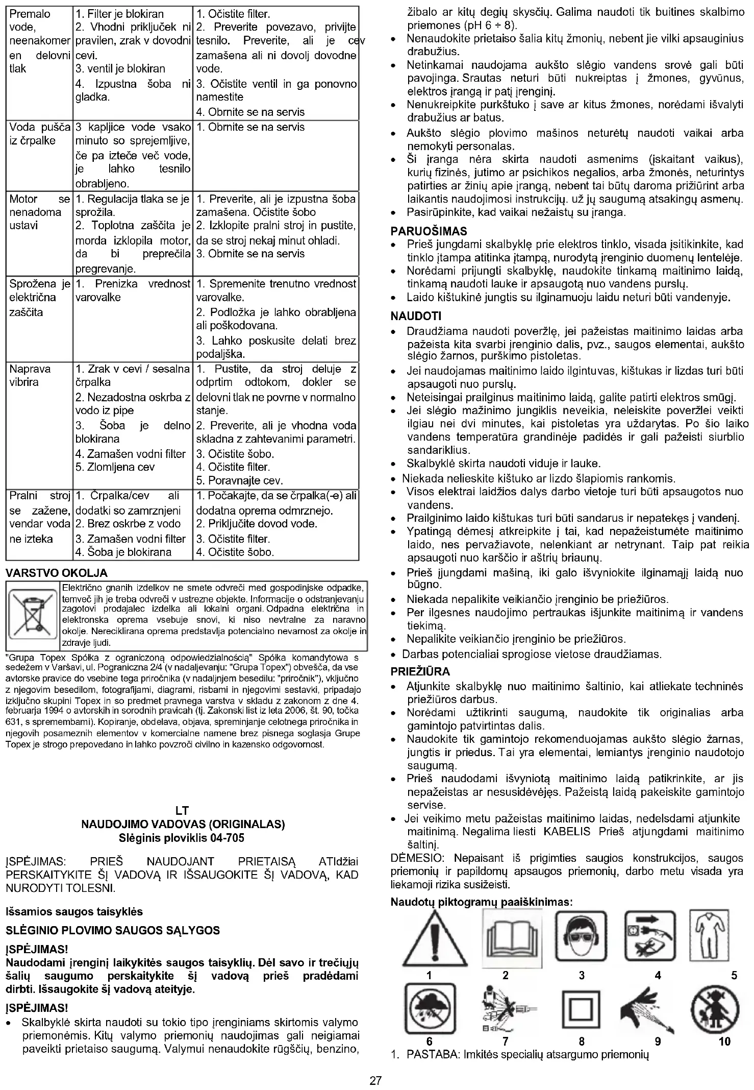 ĮSPĖJIMAS! Naudodami įrenginį laikykitės saugos taisyklių. Dėl savo ir trečiųjų šalių saugumo perskaitykite šį vadovą prieš pradėdami dirbti. Išsaugokite šį vadovą ateityje. ĮSPĖJIMAS! Skalbyklė skirta naudoti su tokio tipo įrenginiams skirtomis valymo priemonėmis. Kitų valymo priemonių naudojimas gali neigiamai paveikti prietaiso saugumą. Valymui nenaudokite rūgščių, benzino, žibalo ar kitų degių skysčių. Galima naudoti tik buitines skalbimo priemones (pH 6 ÷ 8). Nenaudokite prietaiso šalia kitų žmonių, nebent jie vilki apsauginius drabužius. Netinkamai naudojama aukšto slėgio vandens srovė gali būti pavojinga. Srautas neturi būti nukreiptas į žmones, gyvūnus, elektros įrangą ir patį įrenginį. Nenukreipkite purkštuko į save ar kitus žmones, norėdami išvalyti drabužius ar batus. Aukšto slėgio plovimo mašinos neturėtų naudoti vaikai arba nemokyti personalas. Ši įranga nėra skirta naudoti asmenims (įskaitant vaikus), kurių fizinės, jutimo ar psichikos negalios, arba žmonės, neturintys patirties ar žinių apie įrangą, nebent tai būtų daroma prižiūrint arba laikantis naudojimosi instrukcijų. už jų saugumą atsakingų asmenų. Pasirūpinkite, kad vaikai nežaistų su įranga. PARUOŠIMAS Prieš jungdami skalbyklę prie elektros tinklo, visada įsitikinkite, kad tinklo įtampa atitinka įtampą, nurodytą įrenginio duomenų lentelėje. Norėdami prijungti skalbyklę, naudokite tinkamą maitinimo laidą, tinkamą naudoti lauke ir apsaugotą nuo vandens purslų. Laido kištukinė jungtis su ilginamuoju laidu neturi būti vandenyje. NAUDOTI Draudžiama naudoti poveržlę, jei pažeistas maitinimo laidas arba pažeista kita svarbi įrenginio dalis, pvz., saugos elementai, aukšto slėgio žarnos, purškimo pistoletas. Jei naudojamas maitinimo laido ilgintuvas, kištukas ir lizdas turi būti apsaugoti nuo purslų. Neteisingai prailginus maitinimo laidą, galite patirti elektros smūgį. Jei slėgio mažinimo jungiklis neveikia, neleiskite poveržlei veikti ilgiau nei dvi minutes, kai pistoletas yra uždarytas. Po šio laiko vandens temperatūra grandinėje padidės ir gali pažeisti siurblio sandariklius. Skalbyklė skirta naudoti viduje ir lauke. Niekada nelieskite kištuko ar lizdo šlapiomis rankomis. Visos elektrai laidžios dalys darbo vietoje turi būti apsaugotos nuo vandens. Prailginimo laido kištukas turi būti sandarus ir nepatekęs į vandenį. Ypatingą dėmesį atkreipkite į tai, kad nepažeistumėte maitinimo laido, nes pervažiavote, nelenkiant ar netrynant. Taip pat reikia apsaugoti nuo karščio ir aštrių briaunų. Prieš įjungdami mašiną, iki galo išvyniokite ilginamąjį laidą nuo būgno. Niekada nepalikite veikiančio įrenginio be priežiūros. Per ilgesnes naudojimo pertraukas išjunkite maitinimą ir vandens tiekimą. Nepalikite veikiančio įrenginio be priežiūros. Darbas potencialiai sprogiose vietose draudžiamas.
