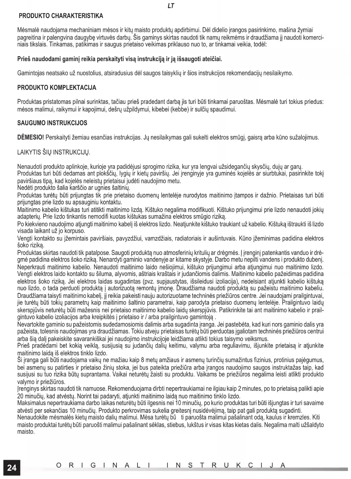 PRODUKTO CHARAKTERISTIKA Mėsmalė naudojama mechaniniam mėsos ir kitų maisto produktų apdirbimui. Dėl didelio įrangos pasirinkimo, mašina žymiai pagreitina ir palengvina daugybę virtuvės darbų. Šis gaminys skirtas naudoti tik namų reikmėms ir draudžiama jį naudoti komerci- niais tikslais. Tinkamas, patikimas ir saugus prietaiso veikimas priklauso nuo to, ar tinkamai veikia, todėl: Prieš naudodami gaminį reikia perskaityti visą instrukciją ir ją išsaugoti ateičiai. Gamintojas neatsako už nuostolius, atsiradusius dėl saugos taisyklių ir šios instrukcijos rekomendacijų nesilaikymo. PRODUKTO KOMPLEKTACIJA Produktas pristatomas pilnai surinktas, tačiau prieš pradedant darbą jis turi būti tinkamai paruoštas. Mėsmalė turi tokius priedus: mėsos malimui, raikymui ir kapojimui, dešrų užpildymui, kibebei (kebbe) ir sulčių spaudimui. SAUGUMO INSTRUKCIJOS DĖMESIO! Perskaityti žemiau esančias instrukcijas. Jų nesilaikymas gali sukelti elektros smūgį, gaisrą arba kūno sužalojimus. LAIKYTIS ŠIŲ INSTRUKCIJŲ. Nenaudoti produkto aplinkoje, kurioje yra padidėjusi sprogimo rizika, kur yra lengvai užsidegančių skysčių, dujų ar garų. Produktas turi būti dedamas ant plokščių, lygių ir kietų paviršių. Jei įrenginyje yra guminės kojelės ar siurbtukai, pasirinkite tokį paviršiaus tipą, kad kojelės neleistų prietaisui judėti naudojimo metu. Nedėti produkto šalia karščio ar ugnies šaltinių. Produktas turėtų būti prijungtas tik prie prietaiso duomenų lentelėje nurodytos maitinimo įtampos ir dažnio. Prietaisas turi būti prijungtas prie lizdo su apsauginiu kontaktu. Maitinimo kabelio kištukas turi atitikti maitinimo lizdą. Kištuko negalima modifi kuoti. Kištuko prijungimui prie lizdo nenaudoti jokių adapterių. Prie lizdo tinkantis nemodifi kuotas kištukas sumažina elektros smūgio riziką. Po kiekvieno naudojimo atjungti maitinimo kabelį iš elektros lizdo. Neatjunkite kištuko traukiant už kabelio. Kištuką ištraukti iš lizdo visada laikant už jo korpuso. Vengti kontakto su įžemintais paviršiais, pavyzdžiui, vamzdžiais, radiatoriais ir aušintuvais. Kūno įžeminimas padidina elektros šoko riziką. Produktas skirtas naudoti tik patalpose. Saugoti produktą nuo atmosferinių kritulių ar drėgmės. Į įrenginį patenkantis vanduo ir drė- gmė padidina elektros šoko riziką. Nenardyti gaminio vandenyje ar kitame skystyje. Darbo metu nepilti vandens i produkto dubenį. Neperkrauti maitinimo kabelio. Nenaudoti maitinimo laido nešiojimui, kištuko prijungimui arba atjungimui nuo maitinimo lizdo. Vengti elektros laido kontakto su šiluma, alyvomis, aštriais kraštais ir judančiomis dalimis. Maitinimo kabelio pažeidimas padidina elektros šoko riziką. Jei elektros laidas sugadintas (pvz. supjaustytas, išsileidusi izoliacija), nedelsiant atjunkti kabelio kištuką nuo lizdo, o tada perduoti produktą į autorizuotą remontų įmonę. Draudžiama naudoti produktą su pažeistu maitinimo kabeliu. Draudžiama taisyti maitinimo kabelį, jį reikia pakeisti nauju autorizuotame techninės priežiūros centre. Jei naudojami prailgintuvai, jie turėtų būti tokių parametrų kaip maitinimo šaltinio parametrai, kaip parodyta prietaiso duomenų lentelėje. Prailgintuvo laidų skerspjūvis neturėtų būti mažesnis nei prietaiso maitinimo kabelio laidų skerspjūvis. Patikrinkite tai ant maitinimo kabelio ir prail- gintuvo kabelio izoliacijos arba kreipkitės į prietaiso ir / arba prailgintuvo gamintoją . Nevartokite gaminio su pažeistomis sudedamosiomis dalimis arba sugadinta įranga. Jei pastebėta, kad kuri nors gaminio dalis yra pažeista, tolesnis naudojimas yra draudžiamas. Tokiu atveju prietaisas turėtų būti perduotas įgaliotam techninės priežiūros centrui arba šią dalį pakeiskite savarankiškai jei naudojimo instrukcijoje leidžiama atlikti tokius taisymo veiksmus. Prieš pradėdami bet kokią veiklą, susijusią su judančių dalių keitimu, valymu arba reguliavimu, išjunkite prietaisą ir atjunkite maitinimo laidą iš elektros tinklo lizdo. Ši įranga gali būti naudojama vaikų ne mažiau kaip 8 metų amžiaus ir asmenų turinčių sumažintus fi zinius, protinius pajėgumus, bei asmenų su patirties ir prietaiso žinių stoka, jei bus pateikta priežiūra arba įrangos naudojimo saugos instruktažas taip, kad susijusi su tuo rizika būtų suprantama. Vaikai neturėtų žaisti su produktu. Vaikams be priežiūros negalima leisti atlikti produkto valymo ir priežiūros. Įrenginys skirtas naudoti tik namuose. Rekomenduojama dirbti nepertraukiamai ne ilgiau kaip 2 minutes, po to prietaisą palikti apie 20 minučių, kad atvėstų. Norint tai padaryti, atjunkti maitinimo laidą nuo maitinimo tinklo lizdo. Maksimalus nepertraukiama darbo laikas neturėtų būti ilgesnis nei 10 minučių, po kurio produktas turi būti išjungtas ir turi savaime atvėsti per sekančias 10 minučių. Produkto perkrovimas sukelia greitesnį nusidėvėjimą, taip pat gali produktą sugadinti. Nenaudokite mėsmalės kietų maisto dalių malimui. Mėsa turėtų bū ti paruošta malimui pašalinant odą, kaulus ir kremzles. Kiti maisto produktai turėtų būti paruošti malimui pašalinant sėklas, stiebus, lukštus ir visas kitas kietas dalis. Negalima malti užšaldyto maisto.25 ORIGINALI INSTRUKCIJA