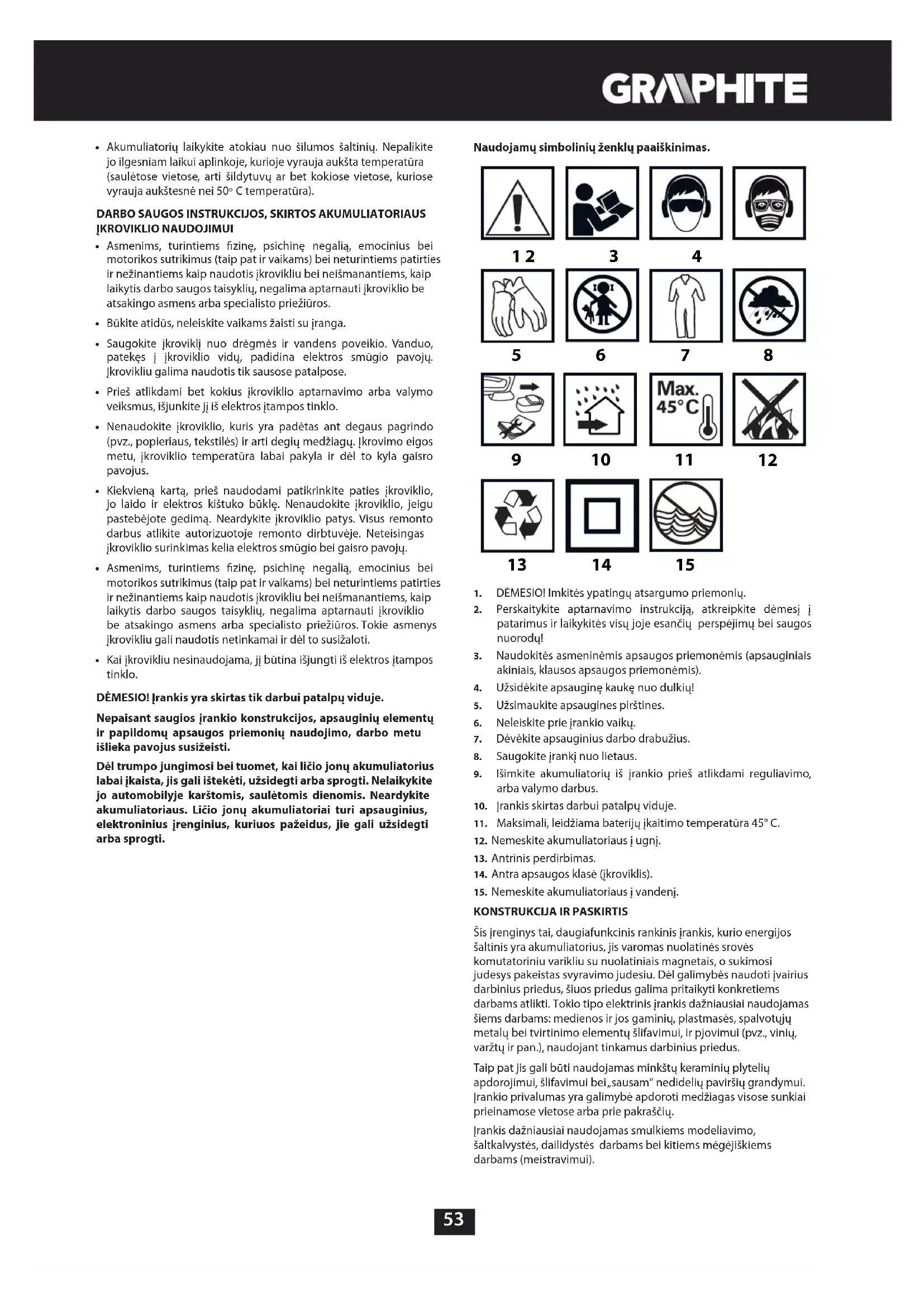 - Kai įkrovikliu nesinaudojama, jį būtina išjungti iš elektros įtampos tinklo. DĖMESIO! Įrankis yra skirtas tik darbui patalpų viduje. Nepaisant saugios įrankio konstrukcijos, apsauginių elementų ir papildomų apsaugos priemonių naudojimo, darbo metu išlieka pavojus susižeisti. Dėl trumpo jungimosi bei tuomet, kai ličio jonų akumuliatorius labai įkaista, jis gali ištekėti, užsidegti arba sprogti. Nelaikykite jo automobilyje karštomis, saulėtomis dienomis. Neardykite akumuliatoriaus. Ličio jonų akumuliatoriai turi apsauginius, elektroninius įrenginius, kuriuos pažeidus, jie gali užsidegti arba sprogti. Naudojamų simbolinių ženklų paaiškinimas.