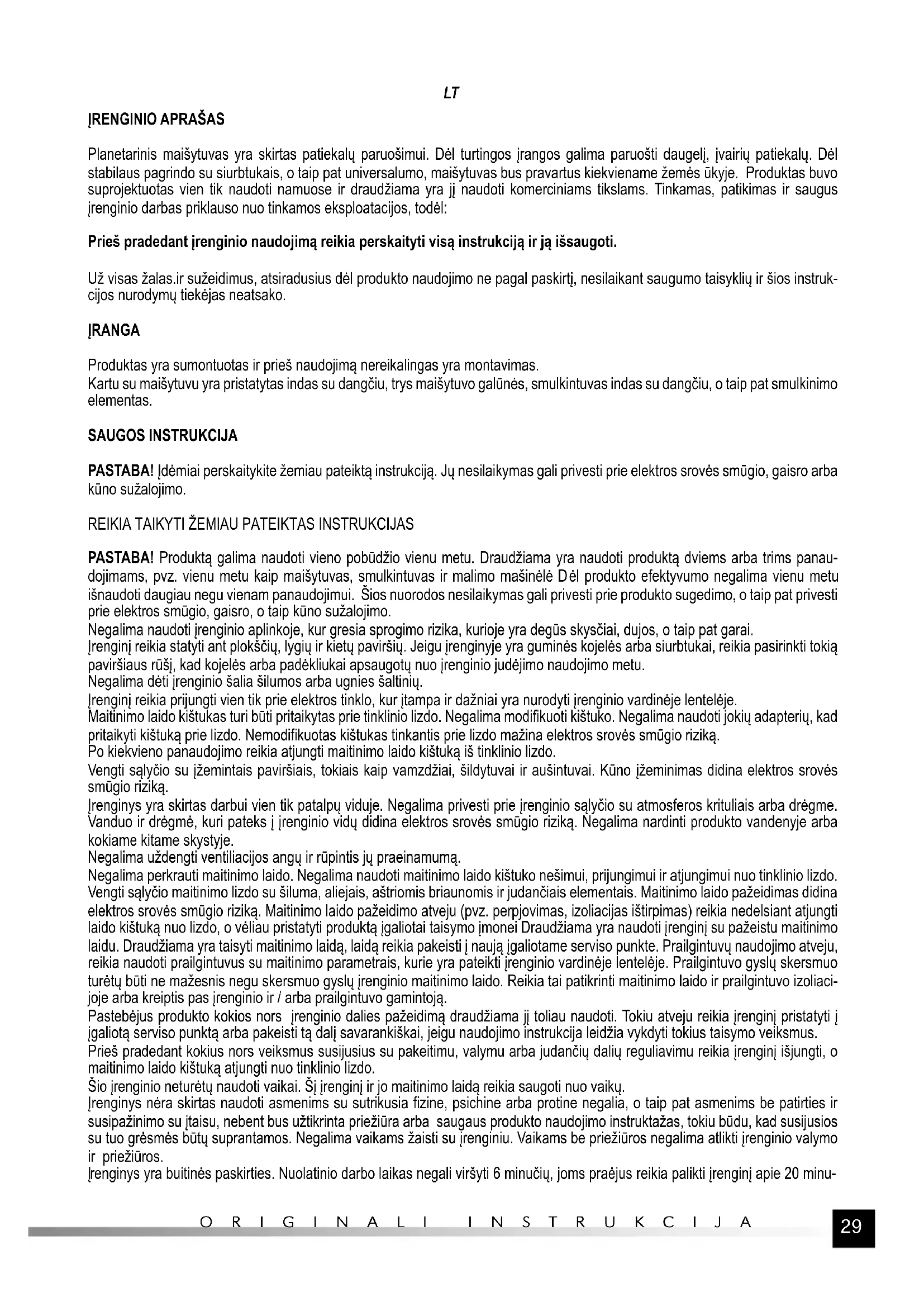 Planetarinis maišytuvas yra skirtas patiekalų paruošimui. Dėl turtingos įrangos galima paruošti daugelį, įvairių patiekalų. Dėl stabilaus pagrindo su siurbtukais, o taip pat universalumo, maišytuvas bus pravartus kiekviename žemės ūkyje. Produktas buvo suprojektuotas vien tik naudoti namuose ir draudžiama yra jį naudoti komerciniams tikslams. Tinkamas, patikimas ir saugus įrenginio darbas priklauso nuo tinkamos eksploatacijos, todėl: Prieš pradedant įrenginio naudojimą reikia perskaityti visą instrukciją ir ją išsaugoti. Už visas žalas.ir sužeidimus, atsiradusius dėl produkto naudojimo ne pagal paskirtį, nesilaikant saugumo taisyklių ir šios instruk- cijos nurodymų tiekėjas neatsako. ĮRANGA Produktas yra sumontuotas ir prieš naudojimą nereikalingas yra montavimas. Kartu su maišytuvu yra pristatytas indas su dangčiu, trys maišytuvo galūnės, smulkintuvas indas su dangčiu, o taip pat smulkinimo elementas. SAUGOS INSTRUKCIJA PASTABA! Įdėmiai perskaitykite žemiau pateiktą instrukciją. Jų nesilaikymas gali privesti prie elektros srovės smūgio, gaisro arba kūno sužalojimo.