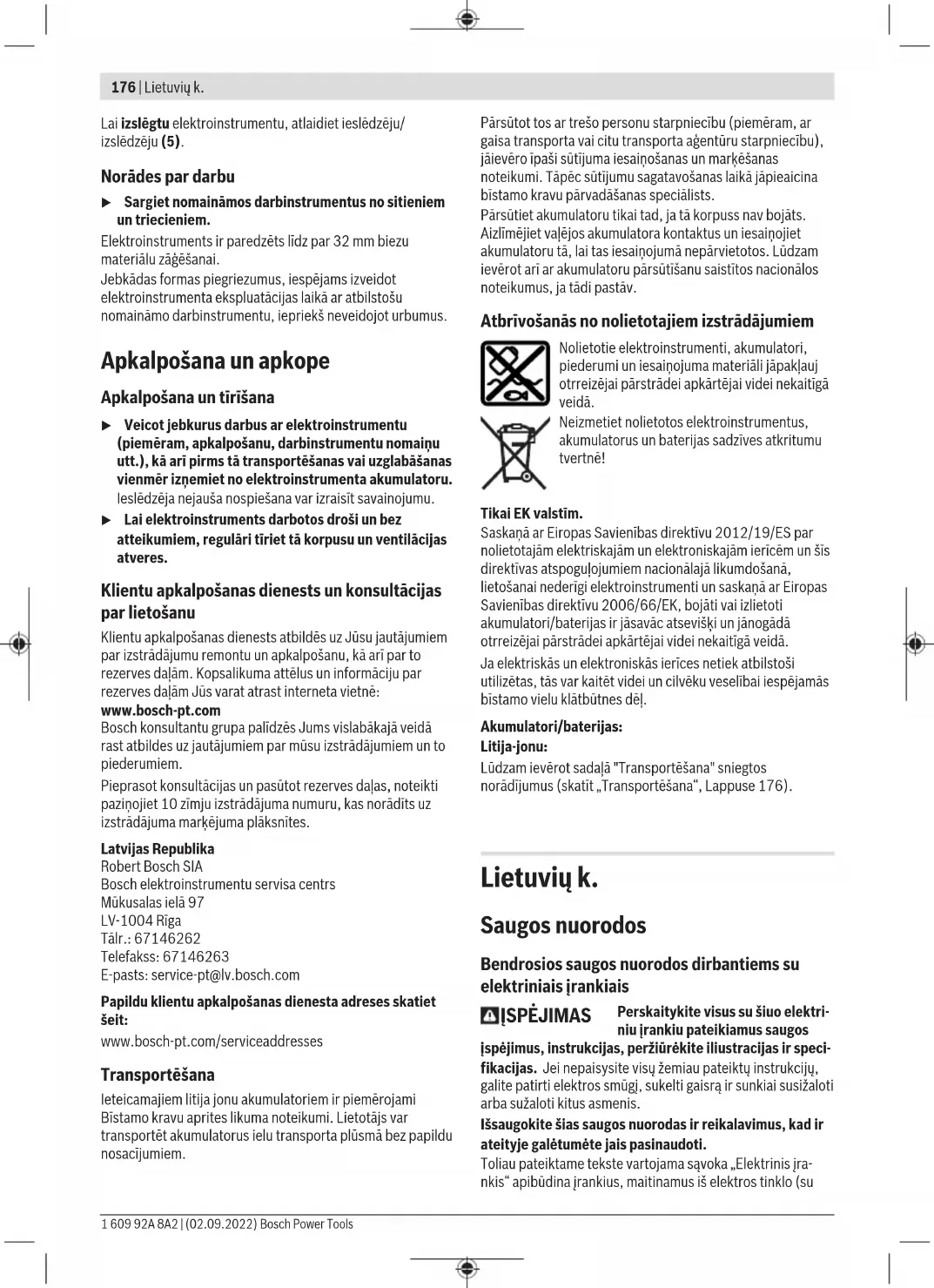 Šioje instrukcijoje pateiktas vibracijos lygis ir triukšmo emisi- ja buvo išmatuoti pagal standartizuotą matavimo metodą, ir juos galima naudoti elektriniams įrankiams palyginti. Jie taip pat skirti vibracijos ir triukšmo emisijai iš anksto įvertinti. Nurodytas vibracijos lygis ir triukšmo emisijos vertė atspindi pagrindinius elektrinio įrankio naudojimo atvejus. Tačiau jei- gu elektrinis įrankis naudojamas kitokiai paskirčiai, su kito- kiais darbo įrankiais arba jeigu jis nepakankamai techniškai prižiūrimas, vibracijos lygis ir triukšmo emisijos vertė gali ki- sti. Tokiu atveju vibracijos ir triukšmo emisija per visą darbo laikotarpį gali žymiai padidėti. Norint tiksliai įvertinti vibracijos ir triukšmo emisiją per tam tikrą darbo laiką, reikia atsižvelgti ir į laiką, per kurį elektrinis įrankis buvo išjungtas arba, nors ir veikė, bet nebuvo naudo- jamas. Tai įvertinus, vibracijos ir triukšmo emisija per visą darbo laiką žymiai sumažės. Dirbančiajam nuo vibracijos poveikio apsaugoti paskirkite papildomas apsaugos priemones, pvz.: elektrinių ir darbo įrankių techninę priežiūrą, rankų šildymą, darbo eigos orga- nizavimą. Akumuliatorius Bosch akumuliatorinius elektrinius įrankius parduoda ir be akumuliatoriaus. Ar į jūsų elektrinio įrankio tiekiamą komp- lektą įeina akumuliatorius, galite pažiūrėti ant pakuotės. Akumuliatoriaus įkrovimas u Naudokite tik techninių duomenų skyriuje nurodytus kroviklius. Tik šie krovikliai yra priderinti prie Jūsų elekt- riniame prietaise naudojamo ličio jonų akumuliatoriaus. Nuoroda: laikantis tarptautinių transportavimo teisės aktų, ličio jonų akumuliatoriai tiekiami dalinai įkrauti. Kad akumu- Bosch Power Tools 1 609 92A 8A2 | (02.09.2022)180 | Lietuvių k. liatorius veiktų visa galia, prieš pirmąjį naudojimą akumulia- torių visiškai įkraukite. Akumuliatoriaus įdėjimas Įkrautą akumuliatorių stumkite į akumuliatoriaus laikiklį, kol pajusite, kad užsifiksavo. Akumuliatoriaus išėmimas Norėdami išimti akumuliatorių, paspauskite akumuliatoriaus atblokavimo klavišus ir išimkite akumuliatorių. Traukdami nenaudokite jėgos. Akumuliatoriuje yra 2fiksavimo pakopos, kurios saugo, kad netikėtai paspaudus akumuliatoriaus atblokavimo klavišą, akumuliatorius neiškristų. Į elektrinį prietaisą įstatytą akumu- liatorių tinkamoje padėtyje palaiko spyruoklė. Akumuliatoriaus įkrovos būklės indikatorius Žali akumuliatoriaus įkrovos būklės indikatoriairodo akumu- liatoriausįkrovos būklę. Dėl saugumo, įkrovos būklę galima pažiūrėti tik tada, kai elektrinis įrankis neveikia. Jei norite, kad būtų parodyta įkrovos būklė, paspauskite įkrovos būklės mygtuką arba . Tai galima ir tada, kai akumuliatorius yra išimtas. Jei paspaudus mygtuką nešviečia nei vienas šviesadiodis in- dikatorius, vadinasi akumuliatorius yra pažeistas ir jį reikia pakeisti. Akumuliatoriaus tipas GBA 18V... Šviesos diodas Talpa Šviečia nuolat 3xžali 60–100% Šviečia nuolat 2xžali 30–60% Šviečia nuolat 1xžalias 5–30% Mirksi 1xžalias 0–5% Akumuliatoriaus tipas ProCORE18V... Šviesos diodas Talpa Šviečia nuolat 5xžali 80–100% Šviečia nuolat 4xžali 60–80% Šviečia nuolat 3xžali 40–60% Šviečia nuolat 2xžali 20–40% Šviečia nuolat 1xžalias 5–20% Mirksi 1xžalias 0–5% Nuorodos, kaip optimaliai elgtis su akumuliatoriumi Saugokite akumuliatorių nuo drėgmės ir vandens. Akumuliatorių sandėliuokite tik nuo −20°C iki 50°C tem- peratūroje. Pvz., nepalikite akumuliatoriaus vasarą automo- bilyje. Akumuliatoriaus ventiliacines angas valykite minkštu, švariu ir sausu teptuku. Pastebimas įkrauto akumuliatoriaus veikimo laiko sutrumpė- jimas rodo, kad akumuliatorius susidėvėjo ir jį reikia pakeisti. Laikykitės pateiktų šalinimo nurodymų. Montavimas u Prieš atliekant bet kokius elektrinio įrankio priežiūros darbus (atliekant techninę priežiūrą ar keičiant įrankį ir t. t.), o taip pat elektrinį įrankį transportuojant ir sandėliuojant, būtina iš jo išimti akumuliatorių. Prie- šingu atveju galite susižeisti, netyčia nuspaudę įjungimo- išjungimo jungiklį. Įrankių keitimas u Įstatant ar keičiant darbo įrankius, rekomenduojama mūvėti apsauginėmis pirštinėmis. Originalius darbo įrankius iš plačiosBosch papildomos įran- gos programos galite įsigyti specializuotoje parduotuvėje. Suspaudžiamosios įvorės keitimas (žr.Apav.) Išsukite tvirtinamąjį varžtą(9) ir nuimkite gylio ribotuvą(2) kartu su adapteriu dulkių nusiurbimo įrangai(3). Priklausomai nuo darbo įrankio, prieš jį įstatant reikia pa- keisti gaubiamąją veržlę(12) su suspaudžiamąja įvore(11). Jei atliekamai užduočiai tinkama suspaudžiamoji įvorė jau įstatyta, vykdykite žemiau esančiame skyriuje nurodytus dar- bo žingsnius. Suspaudžiamoji įvorė(11) gaubiamojoje veržlėje turi būti įstatyta taip, kad liktų nedidelis tarpelis. Gaubiamąją veržlę(12) turi būti lengva sumontuoti. Jei gaubiamoji veržlė arba suspaudžiamoji įvorė pažeista, jas nedelsdami pakeis- kite. Paspauskite suklio fiksuojamąjį klavišą(8) ir laikykite jį pa- spaustą. Jei reikia, variklio suklį pasukite ranka, kol jis užsi- fiksuos. Nusukite gaubiamąją veržlę(12) veržliarakčiu(13) sukdami kryptimi➊. Atleiskite suklio fiksuojamąjį klavišą. Jei reikia, visas montuojamas dalis prieš montavimą nuvaly- kite švelniu teptuku arba prapūskite suslėgtu oru. Ant įrankių įtvaro(14) uždėkite naują gaubiamąją veržlę. Šiek tiek užveržkite gaubiamąją veržlę sukdami kryptimi➋. u Jokiu būdu neužveržkite suspaudžiamosios įvorės su gaubiamąja veržle, kol nepritvirtintas joks darbo įra- nkis. Priešingu atveju gali būti pažeista suspaudžiamoji įvorė. Gylio ribotuvą(2) kartu su adapteriu dulkių nusiurbimo įrangai(3) įstatykite į elektrinį įrankį ir pritvirtinkite jį tvir- tinam