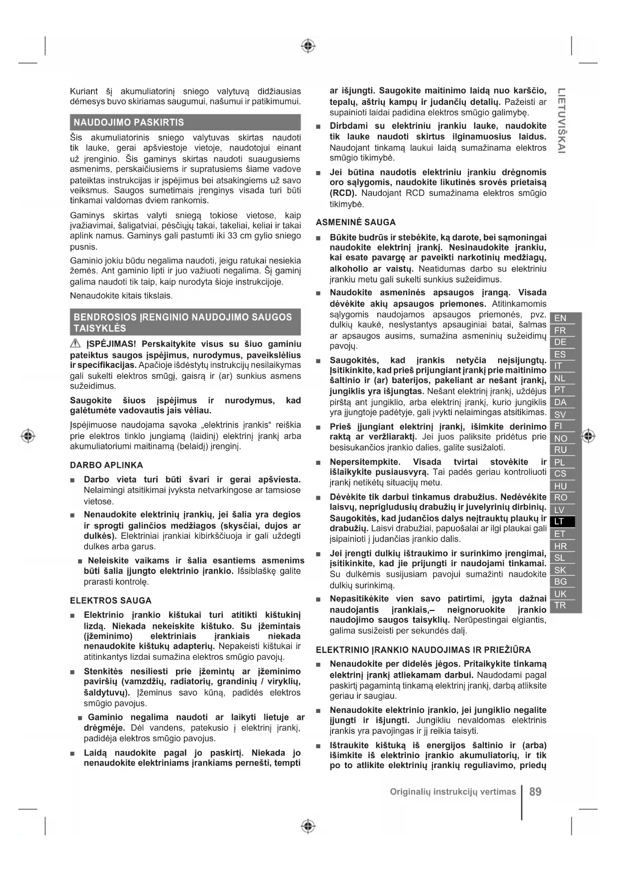 Originalių instrukcijų vertimas■ Prieš kiekvieną naudojimą visada patikrinkite, ar korpusas yra nepažeistas, ar apsauginiai gaubtai ir rankenos yra tinkamai pritvirtinti. EKSPLOATAVIMAS ■ Gaminio negalima naudoti, jeigu yra perkūnijos ar žaibavimo grėsmė. ■ Rankų ar kojų nelaikykite šalia besisukančių detalių ar po jomis. Visada laikykitės saugaus atstumo nuo išmetimo angos. Nedėkite jokių daiktų į angas. ■ Būkite itin atsargūs naudodamiesi įrenginiu ant žvyruotų kelių ar takų, arba juos kirsdami. Būkite budrūs, kad išvengtumėte nematomų pavojų arba naudodamiesi įrenginiu viešuosiuose keliuose. ■ Norėdami išvengti pavojaus susižaloti prisilietus prie judančių dalių, visada išjunkite įrenginį ir išimkite akumuliatorių. Patikrinkite, ar visos judančio dalys visiškai nustojo suktis. ● atsitrenkę į pašalinį objektą, patikrinkite įrenginį, ar jis nesugadintas ● prieš valant ar išimant susidariusį kamštį ● prieš palikdami įrenginį be priežiūros ● prieš įrenginį tikrindami, atlikdami jo techninės priežiūros darbus, jį valydami ar remontuodami ● prietaisui pradėjus neįprastai vibruoti (kuo skubiau patikrinkite) Paprastai vibracija yra įspėjimas. ■ Šlaituose gaminį reikia stumti skersai, jokiu būdu ne aukštyn ir žemyn šlaito. Būkite itin atsargūs ant šlaitų keisdami kryptį. Nebandykite valyti stačių šlaitų. ■ Jokiu būdu neeksploatuokite gaminio be reikiamų apsauginių įtaisų, plokštelių ar kitų saugos įrenginių. ■ Niekada nenukreipkite išmetamojo latako į žmones ar tas vietas, kur gali būti padaryta žala turtui. Visi pašaliniai asmenys, o ypač vaikai ir gyvūnai, turi būti toliau nuo darbo zonos. ■ Norėdami kuo greičiau nuvalyti sniegą, nebandykite eksploatuoti įrenginio perkrauti paleisdami jį veikti per dideliu našumu. ■ Niekada nesinaudokite gaminiu, judėdami dideliu greičiu ant slidžių paviršių. Pažiūrėkite atgal, ir būkite atsargūs naudodamiesi įrenginiu, važiuodami atbuline eiga. ■ Atjunkite rinktuvą / rotorių nuo energijos šaltinio, kai įrenginį transportuojate arba juo nesinaudojate. ■ Keitimui naudokite tik originalias gamintojo atsargines dalis. ■ Niekada nesinaudokite įrenginiu esant prastam matomumui arba apšvietimui. Visada užtikrinkite tvirtą stovėseną ir tvirtai laikykite už rankenų. Visada eikite, niekada nebėkite. ■ Jeigu veikia variklis, gaminį reikia dėti tik ant kietų, švarių paviršių. Oro įleidimo anga gali įtraukti žvyrą, smėlį ir kitas nuolaužas, ir jas išsviesti į operatorių ar pašalinius asmenis; o tai gali sukelti sunkius sužeidimus. ■ Jokiu būdu neeksploatuokite gaminio arti stiklo aptvėrimų, automobilių, langų ar tarpdurių, jeigu nėra tinkamai sureguliuotas sniego išpylimo kampas. ■ Jei gaminys nukrito, patyrė stiprų smūgį arba pradeda neįprastai vibruoti, nedelsdami išjunkite gaminį ir patikrinkite, ar nėra pažeidimų arba nustatykite vibravimo priežastį. Pakenktos dalys turi būti tinkamai sutaisytos arba pakeistos įgaliotame techninio aptarnavimo centre. ■ Naudokite įrenginį tik esant nuo 0 °C iki 40 °C temperatūrai. ■ Įrenginį laikykite ten, kur aplinkos temperatūra yra nuo 0 °C iki 40 °C.