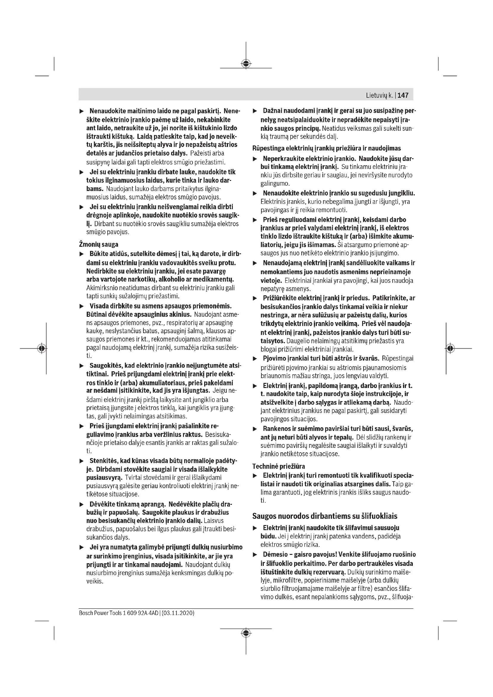 Cieši piespiediet slīploksni slīpēšanas pamatnei (6). Iebīdiet slīploksnes priekšējo daļu zem priekšējās piespiedējlīstes (12). Pie tam sekojiet, lai slīploksne (9) nebūtu pārāk īsa un tiktu pareizi iespīlēta. Pārvietojiet piespiedējsviru (11) atpakaļ sākuma stāvoklī un ieāķējiet to fiksatorā. Neperforētajās slīploksnēs, kas tiek piegādātas rulonos vai liela izmēra lokšņu veidā, vajadzīgos perforācijas atvērumus var izveidot, lietojot caurumotāju (13). Šim nolūkam piespiediet pie caurumotāja elektroinstrumentu ar uz tā nostiprinātu slīploksni (attēls F). Lai noņemtu slīploksni (9), atbrīvojiet abas piespiedējsviras (11) un izvelciet slīploksni no turētājiem. 1 609 92A 4AD | (03.11.2020) Bosch Power ToolsLatviešu | 145 Slīplokšņu izvēle Lietotājam ir iespējams izvēlēties dažādu šķirņu slīploksnes atkarībā no apstrādājamā materiāla un vēlamā virsmas noslīpēšanas ātruma. Graudainība Jebkura veida koksnes apstrādei 40 – 240 Priekšslīpēšanai, piemēram, raupju, neēvelētu siju un dēļu apstrādei rupja 40, 60 Plakanu virsmu slīpēšanai un nelielu nelīdzenumu nogludināšanai vidēja 80, 120 Cietas koksnes galīgajai apdarei un smalkslīpēšanai smalka 180, 240 Krāsas un lakas pārklājumu vai gruntējuma slāņu, piemēram, pildvielu un špaktelējumu apstrādei 40 – 240 Krāsas noslīpēšanai rupja 40, 60 Priekškrāsojuma slīpēšanai vidēja 80, 120 Gruntējuma slāņu galīgajai noslīpēšanai pirms lakošanas smalka 180, 240 Putekļu un skaidu uzsūkšana Dažu materiālu, piemēram, svinu saturošu krāsu, dažu koksnes šķirņu, minerālu un metālu putekļi var būt kaitīgi veselībai. Pieskaršanās šādiem putekļiem vai to ieelpošana var izraisīt alerģiskas reakcijas vai elpošanas ceļu saslimšanu elektroinstrumenta lietotājam vai darba vietai tuvumā esošajām personām. Atsevišķu materiālu putekļi, piemēram, putekļi, kas rodas, zāģējot ozola vai dižskābarža koksni, var izraisīt vēzi, īpaši tad, ja koksne iepriekš ir tikusi ķīmiski apstrādāta (ar hromātu vai koksnes aizsardzības līdzekļiem). Azbestu saturošus materiālus drīkst apstrādāt vienīgi personas ar īpašām profesionālām iemaņām. – Pielietojiet apstrādājamajam materiālam vispiemērotāko putekļu uzsūkšanas metodi. – Darba vietai jābūt labi ventilējamai. – Darba laikā ieteicams izmantot masku elpošanas ceļu aizsardzībai ar filtrēšanas klasi P2. Ievērojiet jūsu valstī spēkā esošos priekšrakstus, kas attiecas uz apstrādājamo materiālu. u Nepieļaujiet putekļu uzkrāšanos darba vietā. Putekļi var viegli aizdegties. Putekļu uzsūkšana, uzkrājot tos konteinerī (attēli G–J) Uzbīdiet putekļu konteineri (2) uz uzsūkšanas īscaurules (14). Putekļu konteinera (2) piepildīšanās pakāpi var viegli kontrolēt caur caurspīdīgās tvertnes sienām. Lai iztukšotu putekļu konteineri (2), pavelciet to virzienā uz aizmuguri, viegli pagrozot. Noskrūvējiet filtrējošo elementu (15) no putekļu konteinera (2). Iztukšojiet putekļu konteineru. Lai atbrīvotu filtrējošo elementu (15) no putekļiem, viegli uzsitiet ar to pa cietu virsmu. Ar mīkstu suku attīriet no putekļiem filtrējošā elementa (15) ieloces. Piezīme. Lai nodrošinātu optimālu putekļu uzsūkšanu, savlaicīgi iztukšojiet putekļu konteineru (2) un regulāri tīriet filtrējošo elementu (15). Apstrādājot vertikālas virsmas, turiet elektroinstrumentu tā, lai putekļu konteineris (2) būtu vērsts lejup. Putekļu uzsūkšana ar ārējā vakuumsūcēja palīdzību (attēls K) Uzbīdiet uzsūkšanas šļūteni (16) (papildpiederums) uz putekļu uzsūkšanas kanāla īscaurules (14). Savienojiet uzsūkšanas šļūteni (16) ar vakuumsūcēju (papildpiederums). Putekļsūcējam jābūt piemērotam, lai sūktu apstrādājamā materiāla putekļus. Veselībai īpaši kaitīgus, kancerogēnus vai saususputekļus savāciet ar speciālu putekļsūcēju. Apstrādājot vertikālas virsmas, turiet elektroinstrumentu tā, lai nosūkšanas šļūtene būtu vērsta lejup. Lietošana Uzsākot lietošanu u Pievadiet elektroinstrumentam pareizu spriegumu! Elektrobarošanas avota spriegumam jāatbilst vērtībai, kas norādīta uz elektroinstrumenta marķējuma plāksnītes. Elektroinstrumenti, kas paredzēti 230V spriegumam, var darboties arī no 220V elektrotīkla. Ieslēgšana un izslēgšana u Pārliecinieties, ka varat darbināt ieslēdzēju, neatlaižot rokturi. Lai ieslēgtu elektroinstrumentu, pārvietojiet ieslēdzēju (1) pa labi stāvoklī „I“. Lai izslēgtu elektroinstrumentu, pārvietojiet ieslēdzēju (1) pa kreisi stāvoklī „O“. Norādījumi darbam u Pirms elektroinstrumenta apkopes vai apkalpošanas izvelciet tā elektrokabeļa kontaktdakšu no barojošā elektrotīkla kontaktligzdas. u Pirms noliekat elektroinstrumentu, nogaidiet, līdz tas ir pilnībā apstājies. Noslīpēšanas jauda ir atkarīga galvenokārt no slīploksnes pareizas izvēles. Vienīgi ar nevainojamas kvalitātes slīploksnēm var nodrošināt augstu slīpēšanas veiktspēju, vienlaikus saudzējot elektroinstrumentu. Lai palielinātu slīplokšņu kalpošanas laiku, saglabājiet vienmērīgu spiedienu uz apstrādājamās virsmas. Bosch Power Tools 1 609 92A 4AD | (03.11.2020)146 | Lietuvių k. Pārlieku liels spiediens uz apstrādājamās virsmas nevis nodrošina augstu slīpēšanas veiktspēju, bet gan izraisa elektroinstrumenta un slīploksnes priekšlaicīgu nolietošanos. Neizmantojiet slīploksni, ar kuru ir slīpēts metāls, lai apstrādātu citus materiālus. Lietojiet oriģinālos Bosch slīpēšanas piederumus. Apkalpošana un apkope Apkalpošana un tīrīšana u Pirms elektroinstrumenta apkopes vai apkalpošanas izvelciet tā elektrokabeļa kontaktdakšu no barojošā elektrotīkla kontaktligzdas. u Lai elektroinstruments darbotos droši un bez atteikumiem, regulāri tīri