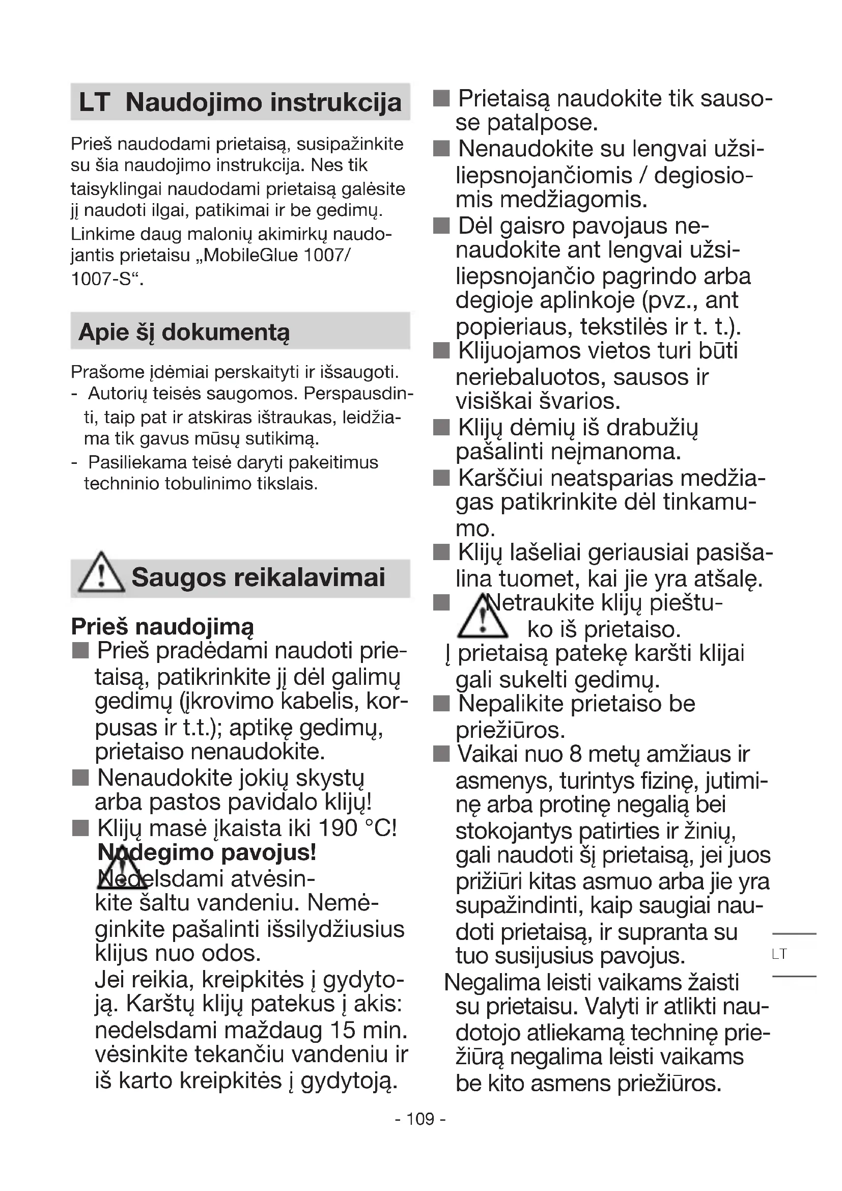 TOOTJA AASTAT GARANTIID TOOTJA AASTAT GARANTIID- 109 - LT Naudojimo instrukcija Prieš naudodami prietaisą, susipažinkite su šia naudojimo instrukcija. Nes tik taisyklingai naudodami prietaisą galėsite jį naudoti ilgai, patikimai ir be gedimų. Linkime daug malonių akimirkų naudo- jantis prietaisu „MobileGlue 1007/ 1007-S“. Apie šį dokumentą Prašome įdėmiai perskaityti ir išsaugoti. - Autorių teisės saugomos. Perspausdin- ti, taip pat ir atskiras ištraukas, leidžia- ma tik gavus mūsų sutikimą. - Pasiliekama teisė daryti pakeitimus techninio tobulinimo tikslais. Prieš naudojimą Prieš pradėdami naudoti prie- taisą, patikrinkite jį dėl galimų gedimų (įkrovimo kabelis, kor- pusas ir t.t.); aptikę gedimų, prietaiso nenaudokite. Nenaudokite jokių skystų arba pastos pavidalo klijų! Klijų masė įkaista iki 190 °C! Nudegimo pavojus! Nedelsdami atvėsin- kite šaltu vandeniu. Nemė- ginkite pašalinti išsilydžiusius klijus nuo odos. Jei reikia, kreipkitės į gydyto- ją. Karštų klijų patekus į akis: nedelsdami maždaug 15 min. vėsinkite tekančiu vandeniu ir iš karto kreipkitės į gydytoją. Saugos reikalavimai Prietaisą naudokite tik sauso- se patalpose. Nenaudokite su lengvai užsi- liepsnojančiomis / degiosio- mis medžiagomis. Dėl gaisro pavojaus ne- naudokite ant lengvai užsi- liepsnojančio pagrindo arba degioje aplinkoje (pvz., ant popieriaus, tekstilės ir t. t.). Klijuojamos vietos turi būti neriebaluotos, sausos ir visiškai švarios. Klijų dėmių iš drabužių pašalinti neįmanoma. Karščiui neatsparias medžia- gas patikrinkite dėl tinkamu- mo. Klijų lašeliai geriausiai pasiša- lina tuomet, kai jie yra atšalę. Netraukite klijų pieštu- ko iš prietaiso. Į prietaisą patekę karšti klijai gali sukelti gedimų. Nepalikite prietaiso be priežiūros. Vaikai nuo 8 metų amžiaus ir asmenys, turintys fizinę, jutimi- nę arba protinę negalią bei stokojantys patirties ir žinių, gali naudoti šį prietaisą, jei juos prižiūri kitas asmuo arba jie yra supažindinti, kaip saugiai nau- doti prietaisą, ir supranta su tuo susijusius pavojus. Negalima leisti vaikams žaisti su prietaisu. Valyti ir atlikti nau- dotojo atliekamą techninę prie- žiūrą negalima leisti vaikams be kito asmens priežiūros. LT- 110 - Nepriekaištingas veikimas garantuojamas tik tuo atveju, jei naudojami originalūs STEINEL klijų pieštukai. USB įkrovimo kabelis Pasirūpinkite, kad įkrovimo kabelis būtų švarus. Užterš- tumas kelias elektros smūgio pavojų. Prietaisą laikykite 0–35 °C temperatūroje. Prietaisą įkraukite tik kartu su juo patiektu USB įkrovi- mo kabeliu(15.3841 tipo). Nekraukite juo kitųprietaisų akumuliatorių. Priešingu atveju kyla gaisro ir sprogimo pavojus. Akumuliatorius Neardykite prietaiso ir aku- muliatoriaus. Trumpojo jun- gimo pavojus. Akumuliatorių išimti draudžiama. Jei iškilo problemų, kreipkitės į par- duotuvę. Ličio jonų akumuliatorių galima įkrauti bet kada, nau- dojimo trukmė nuo to nesu- mažėja. Nutrauktas įkrovimo procesas akumuliatoriui ne- kenkia. Nenaudodami prietaiso ilges- nį laiką, įkraukite akumuliato- rių. Taip prailginsite ličio jonų akumuliatoriaus tarnavimo laiką. Naudojimas pagal paskirtį Šis elektrinis įrankis yra skirtas naudoti buityje meistravimo medžiagoms ir modelių dalims klijuoti, nenaudojant tirpiklių. Dėl akumuliatoriaus netinka- mo naudojimo ir gedimo gali įvykti garų nuotėkis. Jei jau- čiatės prastai, kreipkitės į gy- dytoją ir išeikite į gryną orą. Garai gali dirginti kvėpavimo takus. Naudojimo sritis Akumuliatorinis karštų klijų pieštukas su ličio jonų akumuliatoriumi. Idealus uni- versalus klijavimo prietaisas remontuo- jant, dekoruojant ir meistraujant. Tinka: popieriui, kartonui, kamščiame- džiui, medienai, odai, tekstilei, plastikui, keramikai, putplasčiui, plytelėms ir t. t.- 111 - Prietaiso aprašymas USB įkrovimo kabelis Šviesos diodo rodmuo Įkrovimo kabelio lizdas Maitinimo klavišas Pastūmos mechanizmo paleidiklis Klijų pieštukas Funkcijos ir naudojimas ■ Prieš naudojant pirmą kartą, būtina visiškai įkrauti (2–3 val.), kad akumu- liatorius būtų tinkamas naudoti ilgiau (žr. „Įkrovimas / eksploatavimas“). ■ Klijų pieštuką įkiškite į užpakalinėje dalyje esantį kaitinimo kanalą. Kad prietaisas neįsijungtų netyčia, klavišą reikia spausti maždaug 2 sek. Žalias LED mirksės 15 sek. ■ Pirmą kartą pradėję naudoti ke- lis kartus paspauskite pastūmos mechanizmą, kad kaitinimo kamera prisipildytų klijų. Esant reikalui trum- pai spustelėkite klijų pieštuką. ■ Įjunkite pastūmos mechanizmą ir užtepkite klijų ant vienos pusės. ■ Klijuojamas medžiagas stipriai prispauskite vieną prie kitos ir, jei reikia, pakoreguokite jų padėtį. ■ Jau po labai trumpo laiko (maždaug 2 minučių) suklijuota vieta gali išlaikyti visą apkrovą! ■ Taškinis klijavimas rekomenduojamas klijuojant turinčius didelį paviršių, ilgus dirbinius. ■ Taip pat galima be jokių problemų klijuoti kietąjį putplastį (pvz., stiropo- rą). Tik reikia atsižvelgti į tai, kad karš- tus klijus reikia dengti ant pagrindo, o ne ant stiroporo. ■ Klijuojant tekstilę ar panašias medžia- gas, karštus klijus rekomenduojama tepti vingiuotomis linijomis. Karštus klijus rekomenduojama dengti „vin- giuota linija“. ■ Po naudojimo palaukite, kol prietaisas atauš. Įkrovimas / eksploatavimas „MobileGlue 1007/1007-S“ akumuliato- rius pristatomas įkrautas iš dalies. Prieš pirmą naudojimą akumuliatorių reikia visiškai įkrauti (maždaug 2–3 valandas), kad būtų užtikrinta visa galia. Įkrovimo metu naudoti „MobileGlue 1007/1007-S“ negalima. Nutrūkus įkrovimo procesui, akumulia- torius nesugenda. Jį galima įkrauti bet kada, akumuliatoriaus naudojimo trukmė nuo to nesumažėja. Elektroninės elementų apsaugos („Electronic Cell Protection“, arba EC