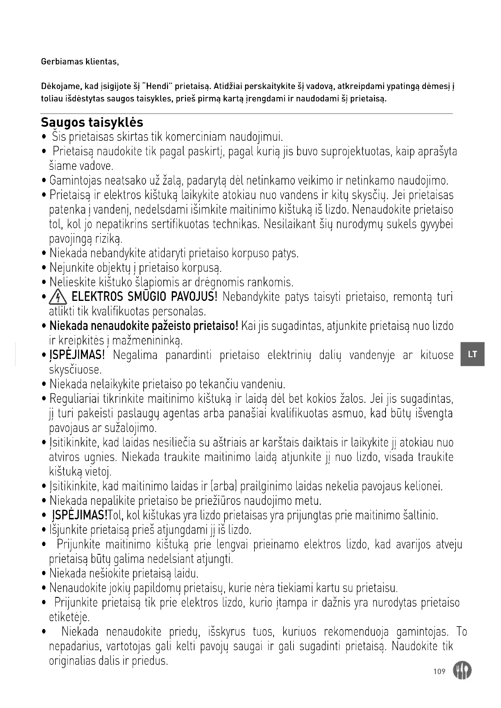 Gerbiamas klientas, Dėkojame, kad įsigijote šį “Hendi” prietaisą. Atidžiai perskaitykite šį vadovą, atkreipdami ypatingą dėmesį į toliau išdėstytas saugos taisykles, prieš pirmą kartą įrengdami ir naudodami šį prietaisą. Saugos taisyklės