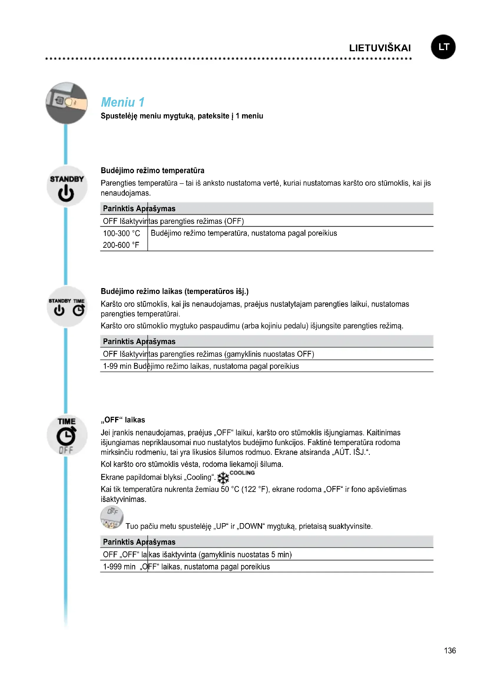 LATVISKI136 Meniu 1 Spustelėję meniu mygtuk, pateksite į 1 meniu Budėjimo režimo temperatūra Parengties temperatūra – tai iš anksto nustatoma vertė, kuriai nustatomas karšto oro stūmoklis, kai jis nenaudojamas. Parinktis Apraymas OFF Išaktyvintas parengties režimas (OFF) 100-300 °C 200-600 °F Budėjimo režimo temperatūra, nustatoma pagal poreikius Budėjimo režimo laikas (temperatūros ij.) Karšto oro stūmoklis, kai jis nenaudojamas, praėjus nustatytajam parengties laikui, nustatomas parengties temperatūrai. Karšto oro stūmoklio mygtuko paspaudimu (arba kojiniu pedalu) išjungsite parengties režimą. Parinktis Apraymas OFF Išaktyvintas parengties režimas (gamyklinis nuostatas OFF) 1-99 min Budėjimo režimo laikas, nustatoma pagal poreikius „OFF“ laikas Jei įrankis nenaudojamas, praėjus „OFF“ laikui, karšto oro stūmoklis išjungiamas. Kaitinimas išjungiamas nepriklausomai nuo nustatytos budėjimo funkcijos. Faktinė temperatūra rodoma mirksinčiu rodmeniu, tai yra likusios šilumos rodmuo. Ekrane atsiranda „AÚT. IŠJ.“. Kol karšto oro stūmoklis vėsta, rodoma liekamoji šiluma. Ekrane papildomai blyksi „Cooling“. Kai tik temperatūra nukrenta žemiau 50 °C (122 °F), ekrane rodoma „OFF“ ir fono apšvietimas išaktyvinimas. Tuo pačiu metu spustelėję „UP“ ir „DOWN“ mygtuką, prietaisą suaktyvinsite. Parinktis Apraymas OFF „OFF“ laikas išaktyvinta (gamyklinis nuostatas 5 min) 1-999 min „OFF“ laikas, nustatoma pagal poreikius