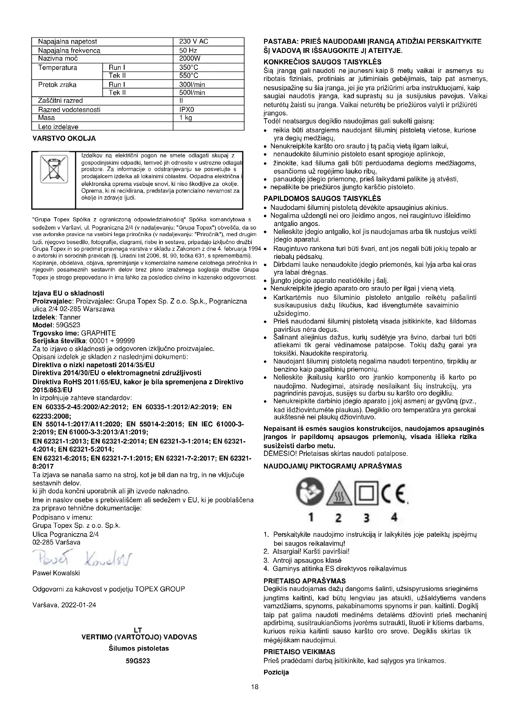 "Grupa Topex Spółka z ograniczoną odpowiedzialnością" "Spółka komandytowa", kurios pagrindinė būstinė yra Varšuvoje, ul. Pograniczna 2/4 (toliau - "Grupa Topex") informuoja, kad visos autorių teisės į šio vadovo (toliau - "Vadovas") turinį, įskaitant, be kita ko. jo tekstą, nuotraukas, diagramas, brėžinius, taip pat jo kompoziciją, priklauso tik "Grupa Topex" ir yra teisinės apsaugos objektas pagal 1994 m. vasario 4 d. Autorių teisių ir gretutinių teisių įstatymą (t. y. 2006 m. Įstatymų leidinys Nr. 90, poz. 631, su pakeitimais). Viso Vadovo, taip pat atskirų jo sudedamųjų dalių kopijavimas, apdorojimas, skelbimas, keitimas komerciniais tikslais be "Grupa Topex" raštu išreikšto sutikimo yra griežtai draudžiamas ir gali užtraukti civilinę ir baudžiamąją atsakomybę. ES atitikties deklaracija Gamintojas: Gamintojas: Grupa Topex Sp. Z o.o. Sp.k., Pograniczna Street 2/4 02-285 Warszawa Produktas: Tanner Modelis: 59G523 Prekybos pavadinimas: GRAPHITE Serijos numeris: 00001 ÷ 99999 Už šią atitikties deklaraciją atsako tik gamintojas. Pirmiau aprašytas gaminys atitinka šiuos dokumentus: Žemos įtampos direktyva 2014/35/ES Elektromagnetinio suderinamumo direktyva 2014/30/ES RoHS direktyva 2011/65/ES su pakeitimais, padarytais Direktyva 2015/863/ES Ir atitinka standartų reikalavimus: EN 60335-2-45:2002/A2:2012; EN 60335-1:2012/A2:2019; EN 62233:2008; EN 55014-1:2017/A11:2020; EN 55014-2:2015; EN IEC 61000-3- 2:2019; EN 61000-3-3:2013/A1:2019; EN 62321-1:2013; EN 62321-2:2014; EN 62321-3-1:2014; EN 62321- 4:2014; EN 62321-5:2014; EN 62321-6:2015; EN 62321-7-1:2015; EN 62321-7-2:2017; EN 62321- 8:2017 Ši deklaracija taikoma tik tokioms mašinoms, kokios jos pateikiamos į rinką, ir neapima sudedamųjų dalių. prideda galutinis naudotojas arba atlieka vėliau. ES gyvenančio arba įsisteigusio asmens, įgalioto rengti techninę bylą, vardas, pavardė ir adresas: Pasirašyta: Grupa Topex Sp. z o.o. Sp.k. Pograniczna gatvė 2/4 02-285 Varšuva Paweł Kowalski TOPEX GROUP bendrovės kokybės pareigūnas Varšuva, 2022-01-2420