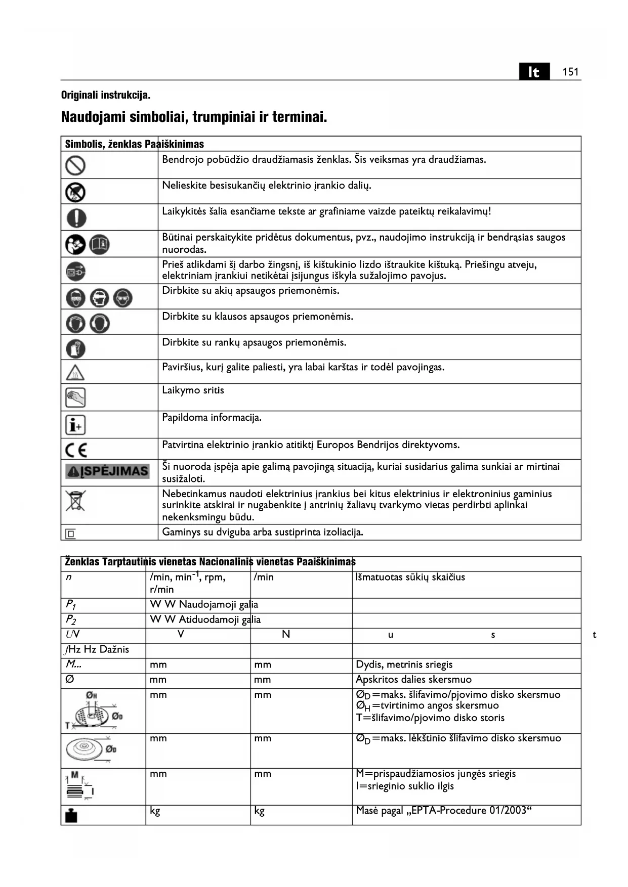 Originali instrukcija. Naudojami simboliai, trumpiniai ir terminai. Simbolis, ženklas Paaiškinimas Bendrojo pobūdžio draudžiamasis ženklas. Šis veiksmas yra draudžiamas. Nelieskite besisukančių elektrinio įrankio dalių. Laikykitės šalia esančiame tekste ar grafiniame vaizde pateiktų reikalavimų! Būtinai perskaitykite pridėtus dokumentus, pvz., naudojimo instrukciją ir bendrąsias saugos nuorodas. Prieš atlikdami šį darbo žingsnį, iš kištukinio lizdo ištraukite kištuką. Priešingu atveju, elektriniam įrankiui netikėtai įsijungus iškyla sužalojimo pavojus. Dirbkite su akių apsaugos priemonėmis. Dirbkite su klausos apsaugos priemonėmis. Dirbkite su rankų apsaugos priemonėmis. Paviršius, kurį galite paliesti, yra labai karštas ir todėl pavojingas. Laikymo sritis Papildoma informacija. Patvirtina elektrinio įrankio atitiktį Europos Bendrijos direktyvoms. Ši nuoroda įspėja apie galimą pavojingą situaciją, kuriai susidarius galima sunkiai ar mirtinai susižaloti. Nebetinkamus naudoti elektrinius įrankius bei kitus elektrinius ir elektroninius gaminius surinkite atskirai ir nugabenkite į antrinių žaliavų tvarkymo vietas perdirbti aplinkai nekenksmingu būdu. Gaminys su dviguba arba sustiprinta izoliacija. Ženklas Tarptautinis vienetas Nacionalinis vienetas Paaiškinimas