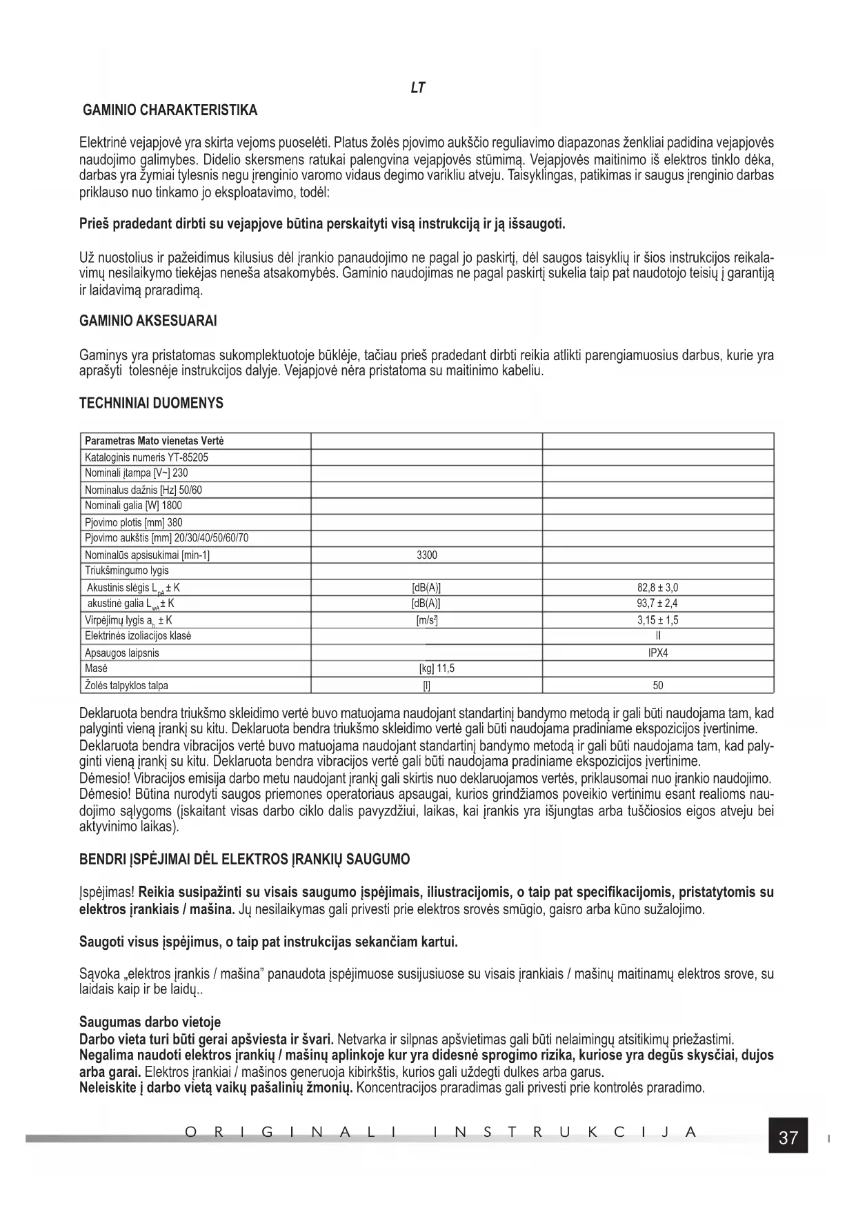 GAMINIO CHARAKTERISTIKA Elektrinė vejapjovė yra skirta vejoms puoselėti. Platus žolės pjovimo aukščio reguliavimo diapazonas ženkliai padidina vejapjovės naudojimo galimybes. Didelio skersmens ratukai palengvina vejapjovės stūmimą. Vejapjovės maitinimo iš elektros tinklo dėka, darbas yra žymiai tylesnis negu įrenginio varomo vidaus degimo varikliu atveju. Taisyklingas, patikimas ir saugus įrenginio darbas priklauso nuo tinkamo jo eksploatavimo, todėl: Prieš pradedant dirbti su vejapjove būtina perskaityti visą instrukciją ir ją išsaugoti. Už nuostolius ir pažeidimus kilusius dėl įrankio panaudojimo ne pagal jo paskirtį, dėl saugos taisyklių ir šios instrukcijos reikala- vimų nesilaikymo tiekėjas neneša atsakomybės. Gaminio naudojimas ne pagal paskirtį sukelia taip pat naudotojo teisių į garantiją ir laidavimą praradimą. GAMINIO AKSESUARAI Gaminys yra pristatomas sukomplektuotoje būklėje, tačiau prieš pradedant dirbti reikia atlikti parengiamuosius darbus, kurie yra aprašyti tolesnėje instrukcijos dalyje. Vejapjovė nėra pristatoma su maitinimo kabeliu. TECHNINIAI DUOMENYS Parametras Mato vienetas Vertė Kataloginis numeris YT-85205 Nominali įtampa [V~] 230 Nominalus dažnis [Hz] 50/60 Nominali galia [W] 1800 Pjovimo plotis [mm] 380 Pjovimo aukštis [mm] 20/30/40/50/60/70 Nominalūs apsisukimai [min-1] 3300 Triukšmingumo lygis Akustinis slėgis L