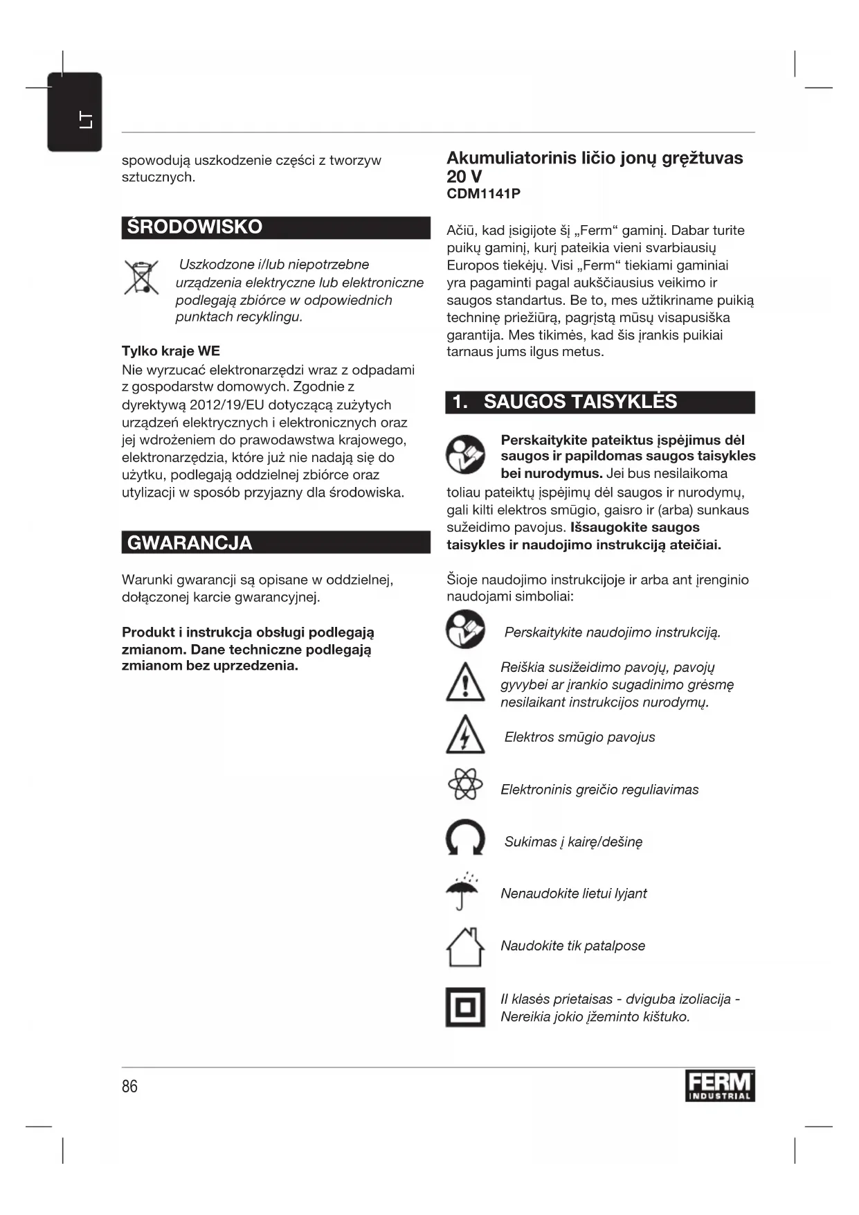 Akumuliatoriaus pažeidimo ir netinkamo naudojimo atveju iš jo gali būti išmetami garai. Išvėdinkite vietą ir, esant nusiskundimų, kreipkitės pagalbos į gydytojus. Garai gali sudirginti kvėpavimo sistemą. d) Naudokite akumuliatorių tik su „Ferm Industrial“ gaminiu. Vien ši atsargumo priemonė apsaugo akumuliatorių nuo pavojingos perkrovos. e) Akumuliatorių gali pažeisti aštrūs daiktai, pavyzdžiui, vinys, arba suktuvai, arba išorinės jėgos. Gali įvykti trumpasis vidinės grandinės jungimas ir akumuliatorius gali sudegti, pradėti rūkti, sprogti arba perkaisti. Kroviklio naudojimo saugos taisyklės Naudojimo paskirtis Šiuo krovikliu kraukite tik CDA1132P ir CDA1133P tipo įkraunamus akumuliatorius. Naudokite tik toliau nurodytus „Ferm Industrial“ FI20V akumuliatorių platformos akumuliatorius. Naudojant su kitais akumuliatoriais, galima sunkiai susižaloti arba sugadinti įrankį. CDA1132P 20 V, 2 Ah, ličio jonų CDA1133P 20 V, 4 Ah, ličio jonų Šiuos akumuliatorius galima įkrauti toliau nurodytu krovikliu. CDA1131P greitasis kroviklis „Ferm Industrial“ FI20V akumuliatorių platformos akumuliatorius galima naudoti su visais „Ferm Industrial“ FI20V akumuliatorių platformos įrankiais. Kiti pavojai Netgi naudojant elektrinį įrankį taip, kaip nurodyta, neįmanoma atmesti visų likusiųjų pavojų veiksnių. Dėl šio elektrinio įrankio konstrukcijos ir dizaino gali kilti tokių pavojų: a) žala sveikatai dėl vibracijos poveikio, jeigu įrankis naudojamas ilgą laiką ir nėra tinkamai eksploatuojamas arba techniškai prižiūrimas;88