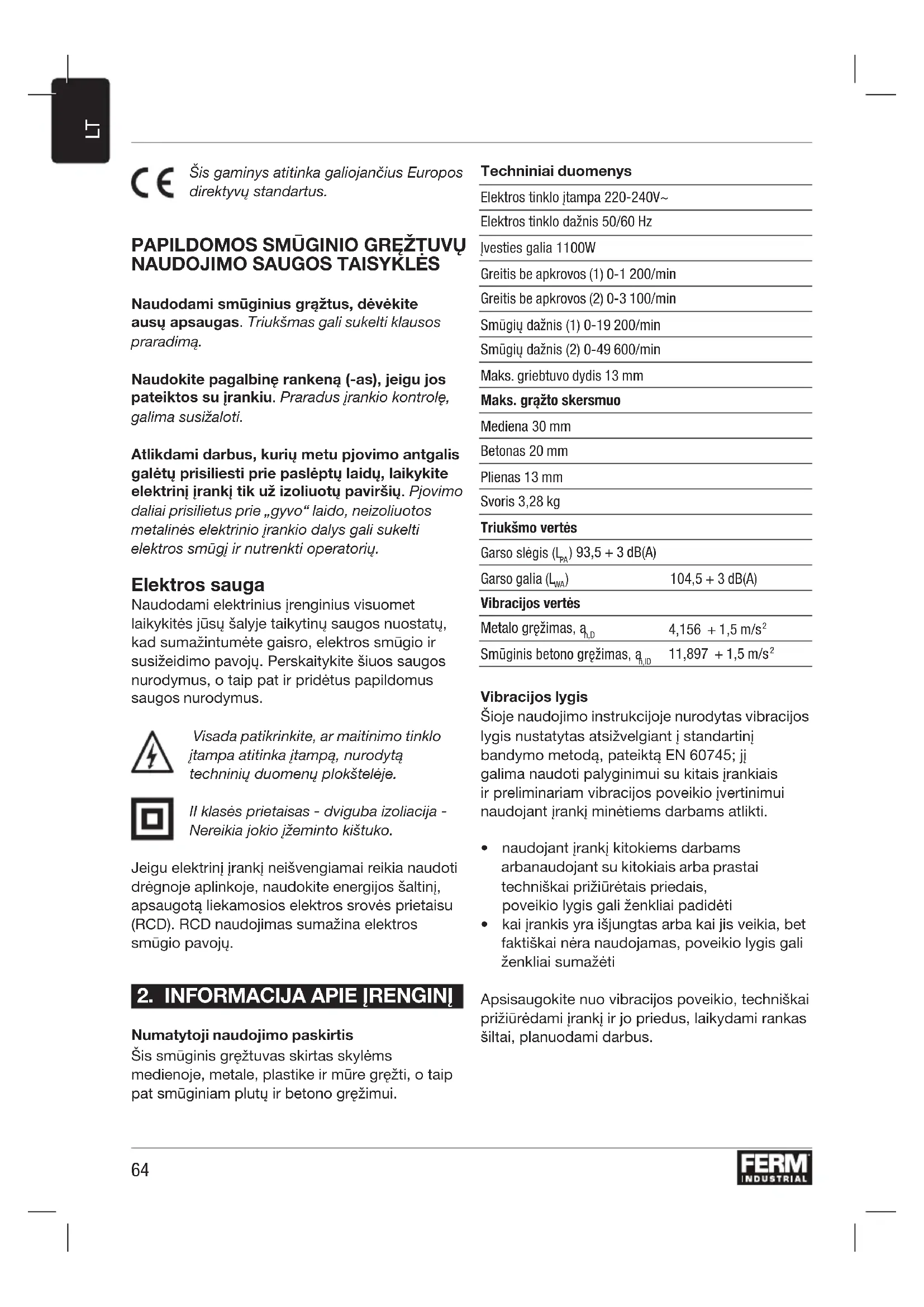 Ačiū, kad įsigijote šį „Ferm“ gaminį. Dabar turite puikų gaminį, kurį pateikia vieni svarbiausių Europos tiekėjų. Visi „Ferm“ tiekiami gaminiai yra pagaminti pagal aukščiausius veikimo ir saugos standartus. Be to, mes užtikriname puikią techninę priežiūrą, pagrįstą mūsų visapusiška garantija. Mes tikimės, kad šis įrankis puikiai tarnaus jums ilgus metus.