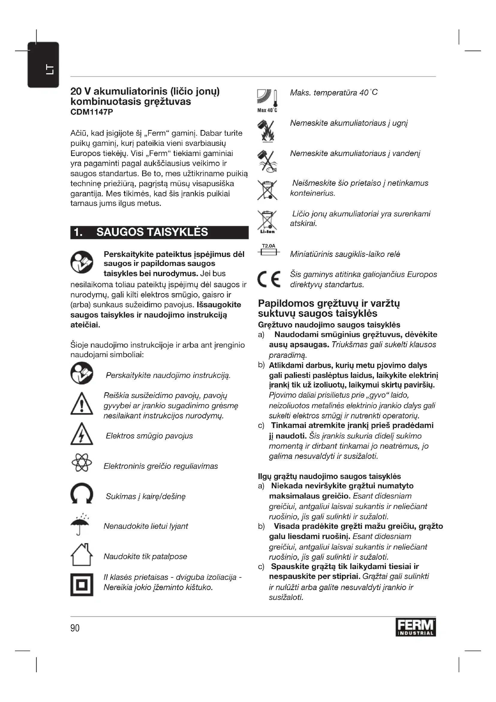 20Vakumuliatorinis(ličiojonų) kombinuotasisgręžtuvas CDM1147P Ačiū, kad įsigijote šį „Ferm“ gaminį. Dabar turite puikų gaminį, kurį pateikia vieni svarbiausių Europos tiekėjų. Visi „Ferm“ tiekiami gaminiai yra pagaminti pagal aukščiausius veikimo ir saugos standartus. Be to, mes užtikriname puikią techninę priežiūrą, pagrįstą mūsų visapusiška garantija. Mes tikimės, kad šis įrankis puikiai tarnaus jums ilgus metus.