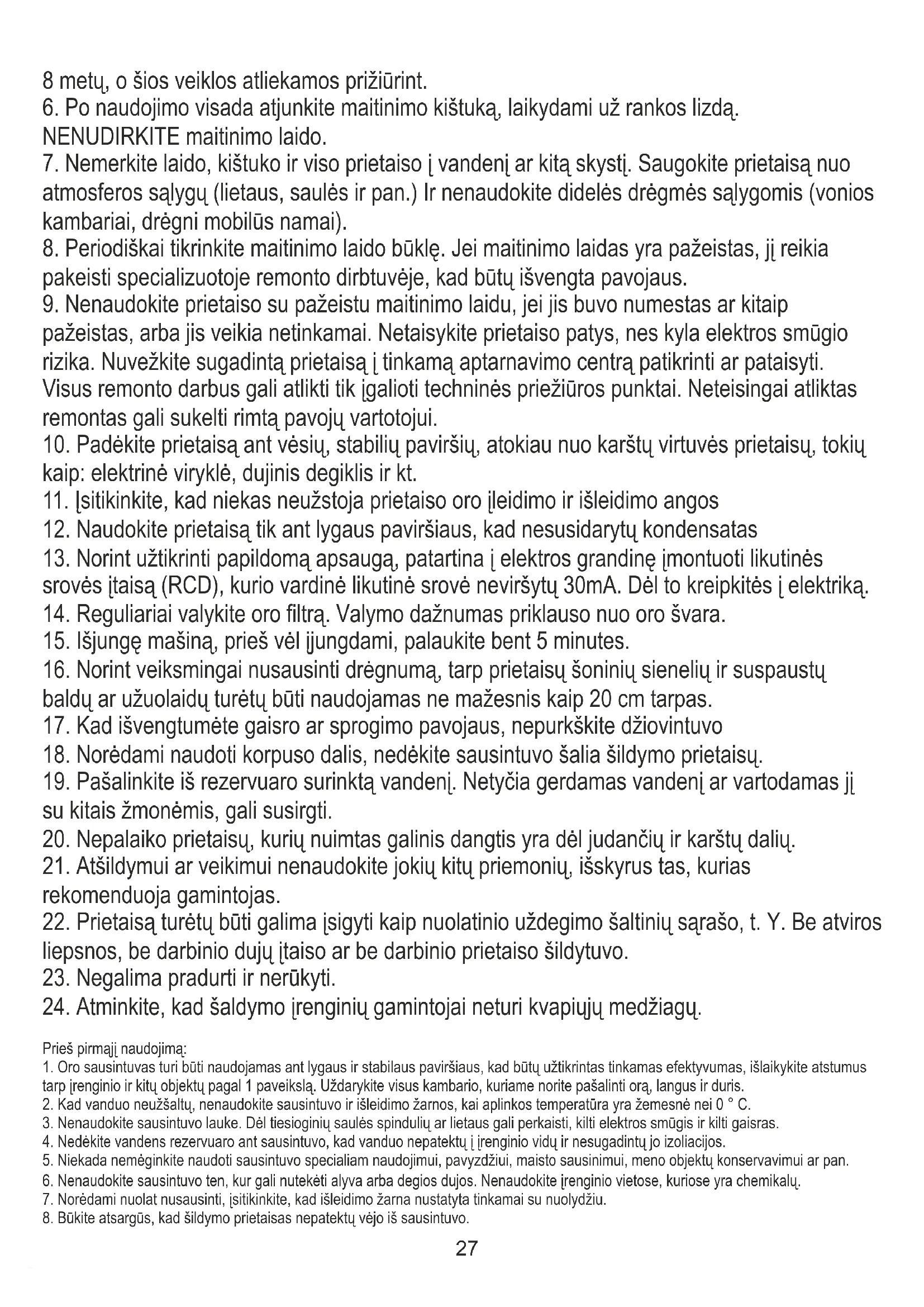 5. Niekada nemėginkite naudoti sausintuvo specialiam naudojimui, pavyzdžiui, maisto sausinimui, meno objektų konservavimui ar pan. 6. Nenaudokite sausintuvo ten, kur gali nutekėti alyva arba degios dujos. Nenaudokite įrenginio vietose, kuriose yra chemikalų.