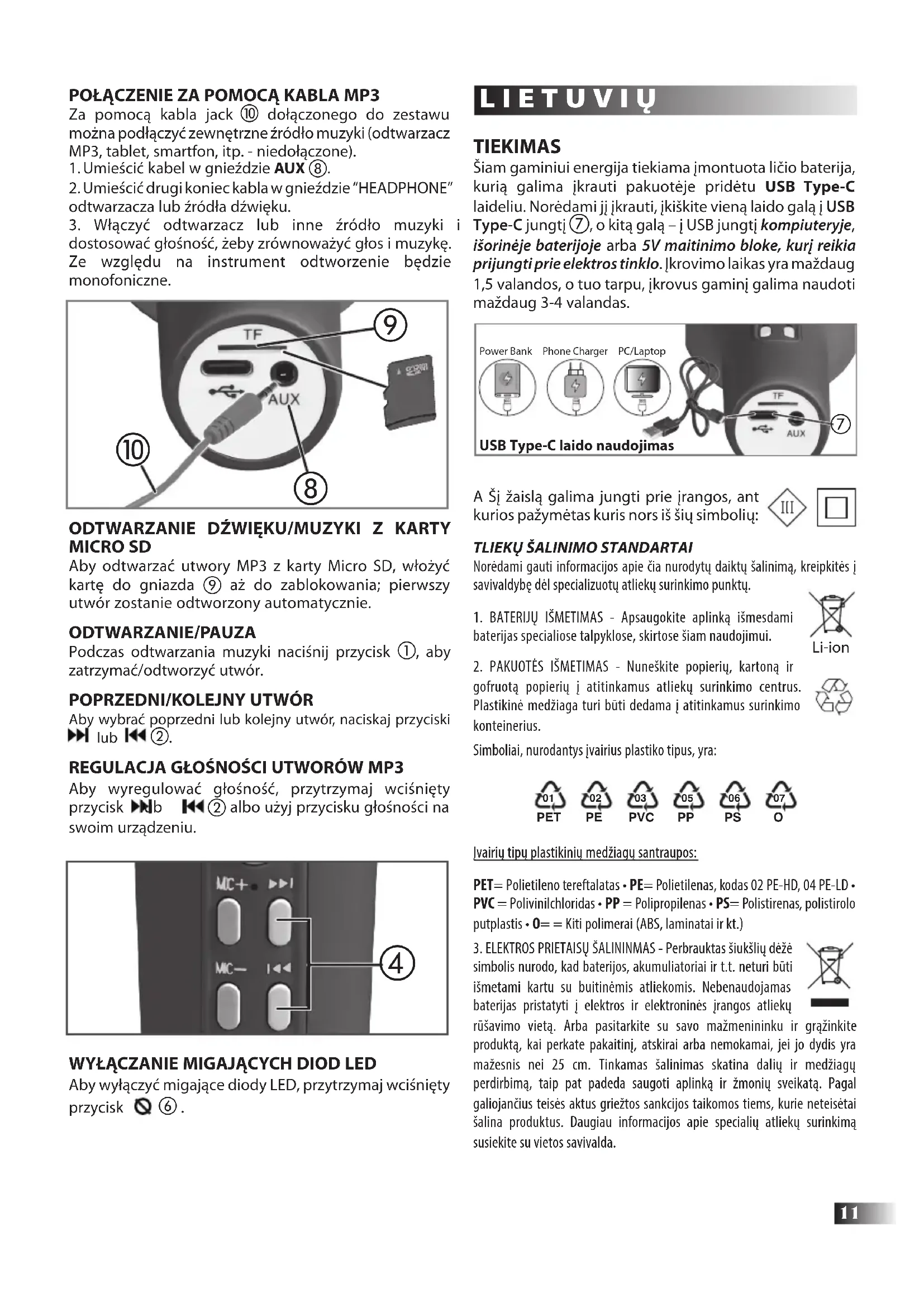 Su prijungtu kištuku galite prijungti išorinį garso šaltinį (MP3 grotuvą, tablet, smartfoną ir kt., nepridėti). 1. Įdėkite laidą į AUX lizdą h.2. Įdėkite kitą kabelio galą į muzikos grotuvo lizdą “HEADPHONE” ar kitoks garso šaltinis.3. Įjunkite grotuvą ar kitus muzikos šaltinius ir sureguliuokite garsą, kad balansuotumėte balsu muzika; reprodukcija bus monofoninė dėl prietaiso. GARSO / MUZIKOS ATKŪRIMAS IŠ „MICRO SD“ KORTELĖS Norėdami atkurti „Micro SD“ kortelėje esančius MP3 kūrinius, įstatykite ją į lizdą i, kol užsiblokuos reikiamoje padėtyje; bus automatiškai paleistas pirmas. GROJIMAS / PAUZĖ Muzikai grojant paspauskite mygtuką , kad pristabdytumėte / leistumėte kūrinį.