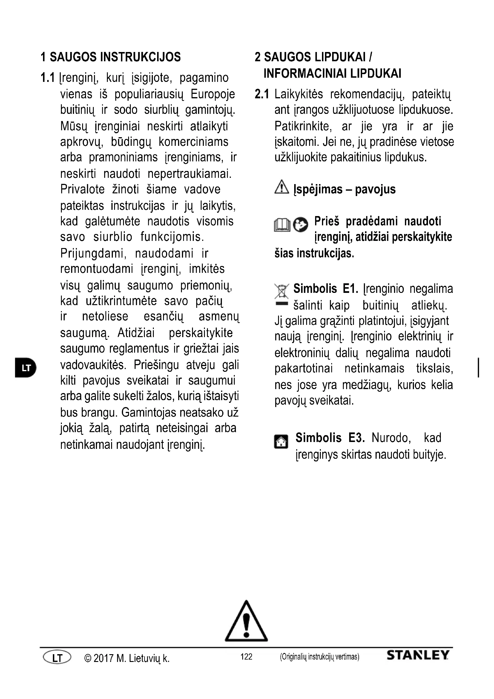 Laikykitės rekomendacijų, pateiktų ant įrangos užklijuotuose lipdukuose. Patikrinkite, ar jie yra ir ar jie įskaitomi. Jei ne, jų pradinėse vietose užklijuokite pakaitinius lipdukus. Įspėjimas – pavojus Prieš pradėdami naudoti įrenginį, atidžiai perskaitykite šias instrukcijas. Simbolis E1. Įrenginio negalima šalinti kaip buitinių atliekų. Jį galima grąžinti platintojui, įsigyjant naują įrenginį. Įrenginio elektrinių ir elektroninių dalių negalima naudoti pakartotinai netinkamais tikslais, nes jose yra medžiagų, kurios kelia pavojų sveikatai. Simbolis E3. Nurodo, kad įrenginys skirtas naudoti buityje.123 (Originalių instrukcijų vertimas) © 2017 M. Lietuvių k. (Originalių instrukcijų vertimas) © 2017 M. Lietuvių k.LT