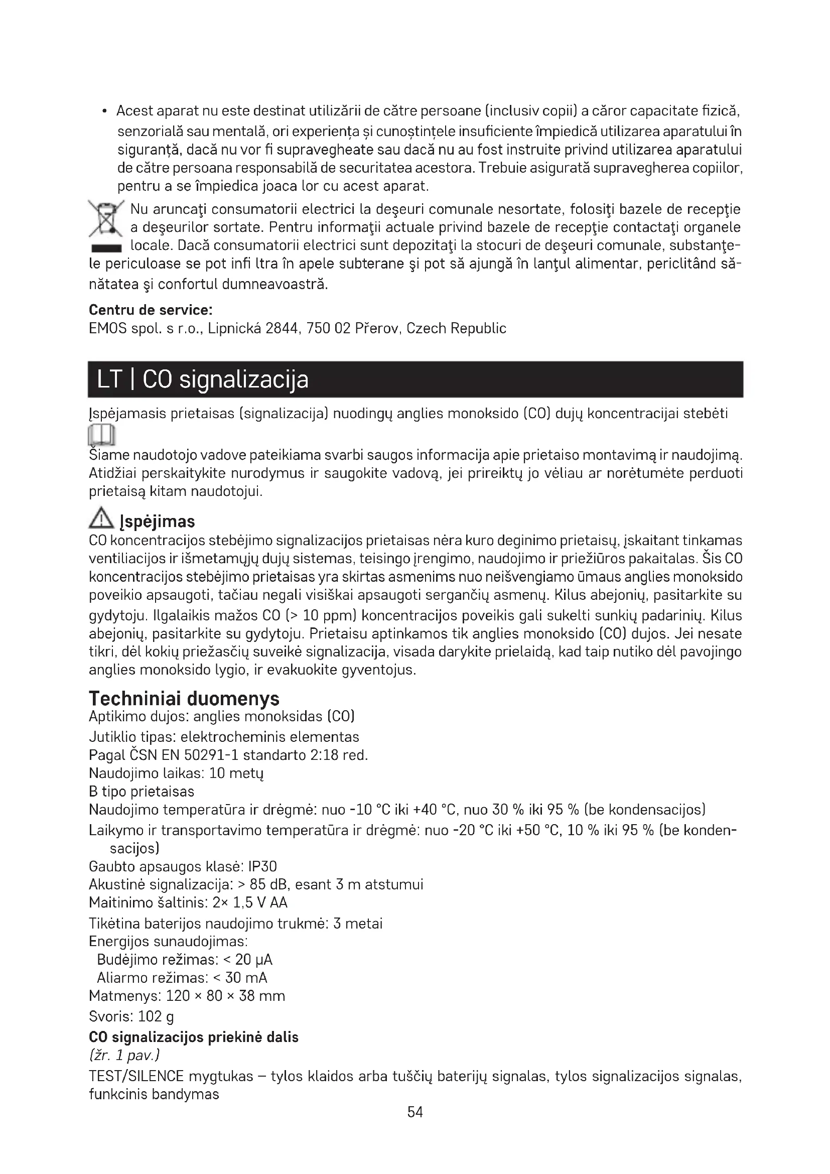 - Acest aparat nu este destinat utilizării de către persoane (inclusiv copii) a căror capacitate zică, senzorială sau mentală, ori experiența și cunoștințele insuciente împiedică utilizarea aparatului în siguranță, dacă nu vor supravegheate sau dacă nu au fost instruite privind utilizarea aparatului de către persoana responsabilă de securitatea acestora. Trebuie asigurată supravegherea copiilor, pentru a se împiedica joaca lor cu acest aparat. Nu aruncaţi consumatorii electrici la deşeuri comunale nesortate, folosiţi bazele de recepţie a deşeurilor sortate. Pentru informaţii actuale privind bazele de recepţie contactaţi organele locale. Dacă consumatorii electrici sunt depozitaţi la stocuri de deşeuri comunale, substanţe- le periculoase se pot in ltra în apele subterane şi pot să ajungă în lanţul alimentar, periclitând să- nătatea şi confortul dumneavoastră. Centru de service: EMOS spol. s r.o., Lipnická 2844, 750 02 Přerov, Czech Republic LT | CO signalizacija Įspėjamasis prietaisas (signalizacija) nuodingų anglies monoksido (CO) dujų koncentracijai stebėti Šiame naudotojo vadove pateikiama svarbi saugos informacija apie prietaiso montavimą ir naudojimą. Atidžiai perskaitykite nurodymus ir saugokite vadovą, jei prireiktų jo vėliau ar norėtumėte perduoti prietaisą kitam naudotojui. Įspėjimas CO koncentracijos stebėjimo signalizacijos prietaisas nėra kuro deginimo prietaisų, įskaitant tinkamas ventiliacijos ir išmetamųjų dujų sistemas, teisingo įrengimo, naudojimo ir priežiūros pakaitalas. Šis CO koncentracijos stebėjimo prietaisas yra skirtas asmenims nuo neišvengiamo ūmaus anglies monoksido poveikio apsaugoti, tačiau negali visiškai apsaugoti sergančių asmenų. Kilus abejonių, pasitarkite su gydytoju. Ilgalaikis mažos CO (> 10 ppm) koncentracijos poveikis gali sukelti sunkių padarinių. Kilus abejonių, pasitarkite su gydytoju. Prietaisu aptinkamos tik anglies monoksido (CO) dujos. Jei nesate tikri, dėl kokių priežasčių suveikė signalizacija, visada darykite prielaidą, kad taip nutiko dėl pavojingo anglies monoksido lygio, ir evakuokite gyventojus. Techniniai duomenys Aptikimo dujos: anglies monoksidas (CO) Jutiklio tipas: elektrocheminis elementas Pagal ČSN EN 50291-1 standarto 2:18 red. Naudojimo laikas: 10 metų B tipo prietaisas Naudojimo temperatūra ir drėgmė: nuo -10 °C iki +40 °C, nuo 30 % iki 95 % (be kondensacijos) Laikymo ir transportavimo temperatūra ir drėgmė: nuo -20 °C iki +50 °C, 10 % iki 95 % (be konden- sacijos) Gaubto apsaugos klasė: IP30 Akustinė signalizacija: > 85 dB, esant 3 m atstumui Maitinimo šaltinis: 2× 1,5 V AA Tikėtina baterijos naudojimo trukmė: 3 metai Energijos sunaudojimas: Budėjimo režimas: < 20 µA Aliarmo režimas: < 30 mA Matmenys: 120 × 80 × 38 mm Svoris: 102 g CO signalizacijos priekinė dalis (žr. 1 pav.) TEST/SILENCE mygtukas – tylos klaidos arba tuščių baterijų signalas, tylos signalizacijos signalas, funkcinis bandymas55 ŽALIA = MAITINIMAS – maitinimo indikacija GELTONA = TRIKTIS – klaidos arba išsikrovusios baterijos indikacija RAUDONA = SIGNALIZACIJA – signalizacijos indikacija Kas yra anglies monoksidas (CO) Anglies monoksidas (CO) yra bekvapės, nematomos, labai nuodingos dujos. Jos susidaro deginant kurą, pvz., malkas, anglis, akmens anglis, mazutą, paraną, benziną, gamtines dujas, propaną, butaną ir kt., arba nuo cigarečių dūmų. Pavojinga CO koncentracija gali susidaryti, kai kuro deginimo prietaisai yra sugedę arba netinkamai prižiūrimi, kai kaminas yra užsikimšęs arba patalpos yra blogai vėdinamos. Apsinuodijimo CO dujomis sunkumo laipsnis priklauso nuo dujų koncentracijos (nurodytas dalelių skaičius vienam milijonui, ppm) ir poveikio trukmės. Koncentracija Simptomai 100 ppm Simptomų nėra – nėra pavojaus 200 ppm Nedidelis galvos skausmas 400 ppm Stiprus galvos skausmas po 1–2 valandų 800 ppm Stiprus galvos skausmas po 45 min., pykinimas, silpnumas ir sąmonės netekimas po 2 valandų 1 000 ppm Pavojinga koncentracija – sąmonės netekimas po 1 valandos 1 600 ppm Pykinimas, stiprus galvos skausmas ir svaigulys po 20 minučių 3 200 ppm Pykinimas, stiprus galvos skausmas ir svaigulys po 5–10 minučių, sąmonės netekimas po 30 minučių 6 400 ppm Pykinimas, stiprus galvos skausmas ir svaigulys po 1–2 minučių, sąmonės netekimas po 10–15 minučių 12 800 ppm Momentinis sąmonės netekimas, mirties rizika po 1–2 minučių Visi gyventojai turi būti informuoti apie apsinuodijimo CO dujomis simptomus! CO koncentracijos stebėjimo prietaisas, aptikęs tam tikrą CO dujų koncentraciją per tam tikrą lai- kotarpį, įspėja: CO koncentracija, ppm Signalizacija įsijungia ≥ 30 120 min. ≥ 50 60–90 min. ≥ 100 10–40 min. ≥ 300 per 3 min. Montavimas Montuoti gali kvalikuotas asmuo. Idealiu atveju įspėjimo prietaisas turėtų būti įrengtas visose patal- pose, kur yra kuro deginimo prietaisų. Primygtinai rekomenduojama įrengti įspėjamuosius prietaisus miegamuosiuose ir patalpose, kuriose praleidžiate daug laiko. Jei įspėjamasis prietaisas yra įrengtas toje pačioje patalpoje kaip ir kuro deginimo prietaisas: