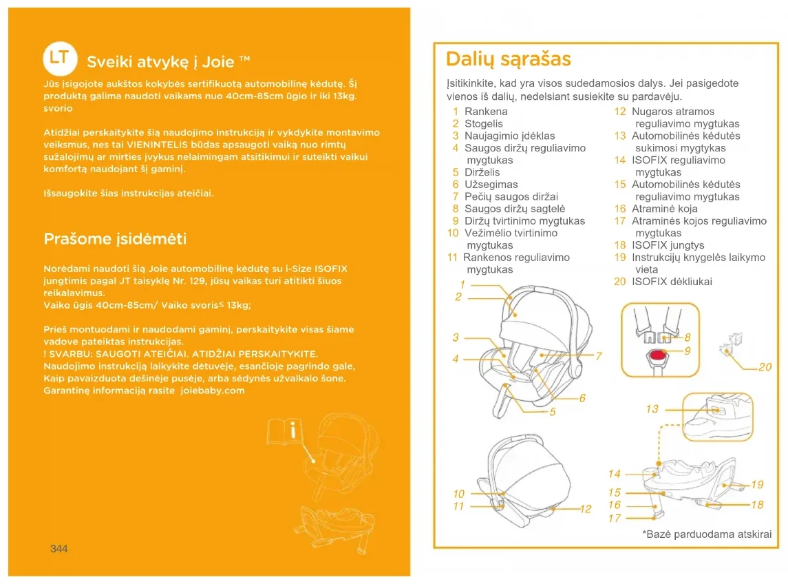Sveiki atvykę į Joie ™ Jūs įsigojote aukštos kokybės sertifikuotą automobilinę kėdutę. Šį produktą galima naudoti vaikams nuo 40cm-85cm ūgio ir iki 13kg. svorioAtidžiai perskaitykite šią naudojimo instrukciją ir vykdykite montavimo veiksmus﹐ nes tai VIENINTELIS būdas apsaugoti vaiką nuo rimtų sužalojimų ar mirties įvykus nelaimingam atsitikimui ir suteikti vaikui komfortą naudojant šį gaminį.Išsaugokite šias instrukcijas ateičiai. Prašome įsidėmėti Norėdami naudoti šią Joie automobilinę kėdutę su i-Size ISOFIX jungtimis pagal JT taisyklę Nr. 129﹐ jūsų vaikas turi atitikti šiuos reikalavimus.Vaiko ūgis 40cm-85cm/ Vaiko svoris 13kg;Prieš montuodami ir naudodami gaminį﹐ perskaitykite visas šiame vadove pateiktas instrukcijas.! SVARBU: SAUGOTI ATEIČIAI. ATIDŽIAI PERSKAITYKITE.Naudojimo instrukciją laikykite dėtuvėje﹐ esančioje pagrindo gale﹐ Kaip pavaizduota dešinėje pusėje﹐ arba sėdynės užvalkalo šone.Garantinę informaciją rasite joiebaby.com Įsitikinkite, kad yra visos sudedamosios dalys. Jei pasigedote vienos iš dalių, nedelsiant susiekite su pardavėju. 1 Rankena 2 Stogelis 3 Naujagimio įdėklas 4 Saugos diržų reguliavimo mygtukas 5 Dirželis 6 Užsegimas 7 Pečių saugos diržai 8 Saugos diržų sagtelė 9 Diržų tvirtinimo mygtukas 10 Vežimėlio tvirtinimo mygtukas 11 Rankenos reguliavimo mygtukas Dalių sąrašas 12 Nugaros atramos reguliavimo mygtukas 13 Automobilinės kėdutės sukimosi mygtykas 14 ISOFIX reguliavimo mygtukas 15 Automobilinės kėdutės reguliavimo mygtukas 16 Atraminė koja 17 Atraminės kojos reguliavimo mygtukas 18 ISOFIX jungtys 19 Instrukcijų knygelės laikymo vieta 20 ISOFIX dėkliukai *Bazė parduodama atskirai345 346 ĮSPĖJIMAS ! Norėdami naudoti šią automobilinę kėdutę su ISOFIX jungtimis pagal ECE R129/03 reglamentą jūsų vaikas turi atitikti šiuos reikalavimus. Vaiko ūgis 40cm-85cm/ Vaiko svoris ≤13kg (apie 1,5 metų ar jaunesni). ! Bet kuri atraminė koja turi liestis su transporto priemonės grindimis ir bet kurie vaiką sulaikantys diržai turi būti pritaikyti prie vaiko kūno, jie negali būti susisukę. ! Šią automobilinę kėdutę arba bazę reikia pakeisti, kai jie avarijos metu patiria stiprų sukrėtimą. Nelaimingo atsitikimo metu, gali atsirasti nematomų pažedimų ! Nedarykite jokių automobilinės kėdutės konstrukcijos pakeitimų ! NIEKADA nepalikite savo vaiko be priežiūros su šioje automobilinėje kėdutėje . ! Bet koks bagažas ar kiti daiktai, galintys sukelti sužalojimus įvykio metu turi būti tinkamai apsaugoti ir pritvirtinti. ! Automobilinė kėdutė negali būti naudojama be minkštų dalių ! Minkštos dalys neturėtų būti keičiamos jokiomis kitomis, išskyrus tas, kurias rekomenduoja gamintojas, nes minkštos dalys sudaro neatskiriamą apsaugos dalį. ! NENAUDOKITE šios automobilinės kėdutės nesilaikydami šiame vadove pateiktų nurodymų, kitaip galite kelti rimtą pavojų savo vaikui dėl sužalojimo ar mirties. ! NENAUDOKITE šios automobilinės kėdutės, jei ji pažeista arba trūksta sudedamųjų dalių. ! NERENKITE savo vaiko dideliais/negabaritiniais drabužiais, nes tai gali neleisti tinkamai ir saugiai pritvirtinti jūsų vaiką pečių ir juosmens diržais. ! NEPALIKITE šios automobilinės kėdutės ar kitų daiktų neprisisegtų diržais arba nepritvirtintų jūsų transporto priemonėje, nes nepritvirtinta automobilinė kėdutė gali iškristi ir sunkiai sužaloti keleivius posūkio, staigus sustojimo ar susidūrimo metu. ! Nestatykite šios automobilinės kėdutės į sėdimąsias vietas, kuriose sumontuota aktyvi priekinė oro pagalvė. Gali kilti mirties arba rimto susižalojimo rizika. ! Daugiau informacijos rasite transporto priemonės savininko vadove. ! NENAUDOKITE nieko, išskyrus rekomenduojamas vidines pagalvėles ! Įsitikinkite, kad automobilinė kėdutė sumontuota taip kad jokia jos dalis netrukdytų kilnojamoms sėdynėms ar jų veikimui ties transporto priemonės durimis. ! Nuimkite automobilinę kėdutę nuo transporto priemonės sėdynės, kai ji yra nenaudojama reguliariai. ! Dėl techninės priežiūros, remonto klausimų kreipkitės į platintoją347 348 ! Prieš nešiodami automobilinę kėdutę rankomis, įsitikinkite, kad vaikas yra pritvirtintas vaiko saugos diržais ir kad rankena būtų tinkamai užfiksuota vertikalioje padėtyje. ! Kad išvengtumėte rimtų sužalojimų ar mirties, NIEKADA nedėkite automobilinės kėdutės ant pakeliamos sėdynės. ! Dažnai tikrinkite, ar ISOFIX kreiptuvuose nėra nešvarumų, ir, jei reikia, nuvalykite. ! Naudojimo patikimumą gali nulemti nešvarumų, dulkių, maisto dalelių patekimas ir tt.349 350 ATSARGUMAS Avarinės situacijos ar nelaimingų atsitikimų atveju svarbiausia, kad jūsų vaikui būtų nedelsiant suteikta pirmoji pagalba ir medicininė pagalba Prekės Informacija " i-Size" (Integrali Universali ISOFIX Sustiprintos Vaiko Apsaugos Sistema) yra Sustiprintų Vaiko Saugos Sistemų kategorija apimanti visas i-Size numatytas apsaugos automobilyje formas.