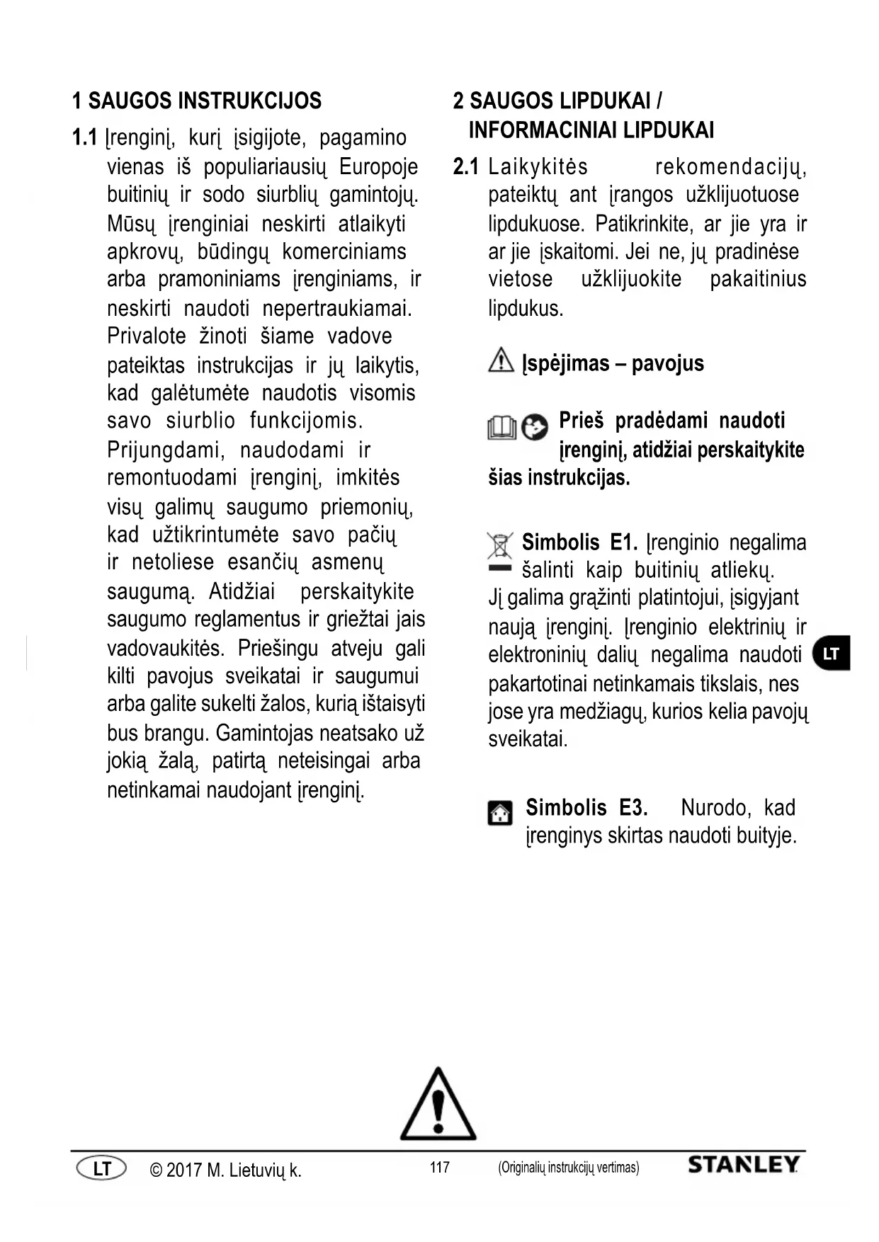 Laikykitės rekomendacijų, pateiktų ant įrangos užklijuotuose lipdukuose. Patikrinkite, ar jie yra ir ar jie įskaitomi. Jei ne, jų pradinėse vietose užklijuokite pakaitinius lipdukus. Įspėjimas – pavojus Prieš pradėdami naudoti įrenginį, atidžiai perskaitykite šias instrukcijas. Simbolis E1. Įrenginio negalima šalinti kaip buitinių atliekų. Jį galima grąžinti platintojui, įsigyjant naują įrenginį. Įrenginio elektrinių ir elektroninių dalių negalima naudoti pakartotinai netinkamais tikslais, nes jose yra medžiagų, kurios kelia pavojų sveikatai. Simbolis E3. Nurodo, kad įrenginys skirtas naudoti buityje.118 (Originalių instrukcijų vertimas) © 2017 M. Lietuvių k. (Originalių instrukcijų vertimas) © 2017 M. Lietuvių k.
