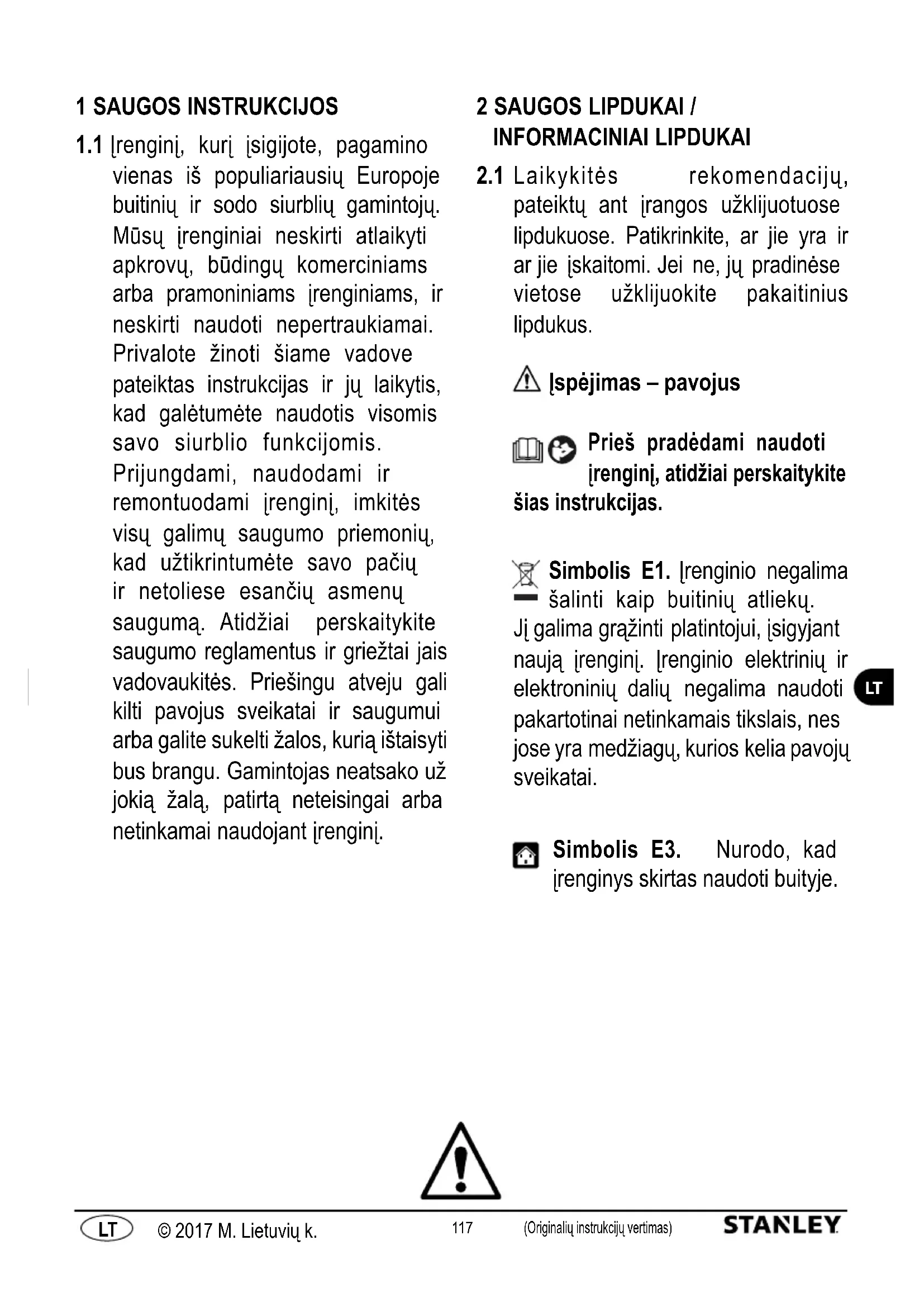 Laikykitės rekomendacijų, pateiktų ant įrangos užklijuotuose lipdukuose. Patikrinkite, ar jie yra ir ar jie įskaitomi. Jei ne, jų pradinėse vietose užklijuokite pakaitinius lipdukus. Įspėjimas – pavojus Prieš pradėdami naudoti įrenginį, atidžiai perskaitykite šias instrukcijas. Simbolis E1. Įrenginio negalima šalinti kaip buitinių atliekų. Jį galima grąžinti platintojui, įsigyjant naują įrenginį. Įrenginio elektrinių ir elektroninių dalių negalima naudoti pakartotinai netinkamais tikslais, nes jose yra medžiagų, kurios kelia pavojų sveikatai. Simbolis E3. Nurodo, kad įrenginys skirtas naudoti buityje.118 (Originalių instrukcijų vertimas) © 2017 M. Lietuvių k. (Originalių instrukcijų vertimas) © 2017 M. Lietuvių k.