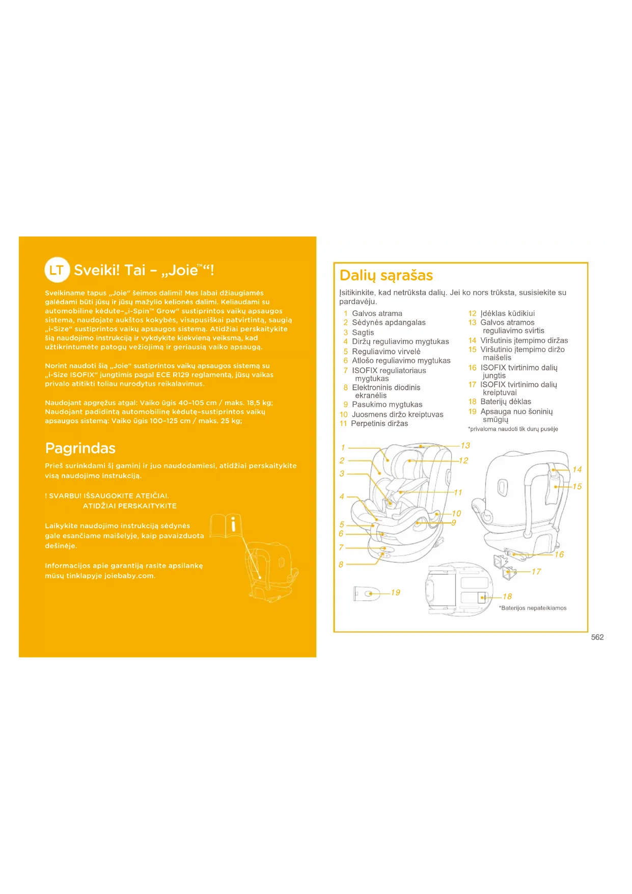 Sveikiname tapus „Joie“ šeimos dalimi! Mes labai džiaugiamės galėdami būti jūsų ir jūsų mažylio kelionės dalimi. Keliaudami su automobiline kėdute–„i-Spin™ Grow“ sustiprintos vaikų apsaugos sistema, naudojate aukštos kokybės, visapusiškai patvirtintą, saugią „i-Size“ sustiprintos vaikų apsaugos sistemą. Atidžiai perskaitykite šią naudojimo instrukciją ir vykdykite kiekvieną veiksmą, kad užtikrintumėte patogų vežiojimą ir geriausią vaiko apsaugą.Norint naudoti šią „Joie“ sustiprintos vaikų apsaugos sistemą su „i-Size ISOFIX“ jungtimis pagal ECE R129 reglamentą, jūsų vaikas privalo atitikti toliau nurodytus reikalavimus.Naudojant apgręžus atgal: Vaiko ūgis 40–105 cm / maks. 18,5 kg;Naudojant padidintą automobilinę kėdutę–sustiprintos vaikų apsaugos sistemą: Vaiko ūgis 100–125 cm / maks. 25 kg; Pagrindas Prieš surinkdami šį gaminį ir juo naudodamiesi, atidžiai perskaitykite visą naudojimo instrukciją.! SVARBU! IŠSAUGOKITE ATEIČIAI.ATIDŽIAI PERSKAITYKITELaikykite naudojimo instrukciją sėdynės gale esančiame maišelyje, kaip pavaizduota dešinėje.Informacijos apie garantiją rasite apsilankę mūsų tinklapyje joiebaby.com. Dalių sąrašas 1 Galvos atrama 2 Sėdynės apdangalas 3 Sagtis 4 Diržų reguliavimo mygtukas 5 Reguliavimo virvelė 6 Atlošo reguliavimo mygtukas 7 ISOFIX reguliatoriaus mygtukas 8 Elektroninis diodinis ekranėlis 9 Pasukimo mygtukas10 Juosmens diržo kreiptuvas11 Perpetinis diržas12 Įdėklas kūdikiui13 Galvos atramos reguliavimo svirtis14 Viršutinis įtempimo diržas15 Viršutinio įtempimo diržo maišelis16 ISOFIX tvirtinimo dalių jungtis17 ISOFIX tvirtinimo dalių kreiptuvai18 Baterijų dėklas19 Apsauga nuo šoninių smūgiųĮsitikinkite, kad netrūksta dalių. Jei ko nors trūksta, susisiekite su pardavėju.