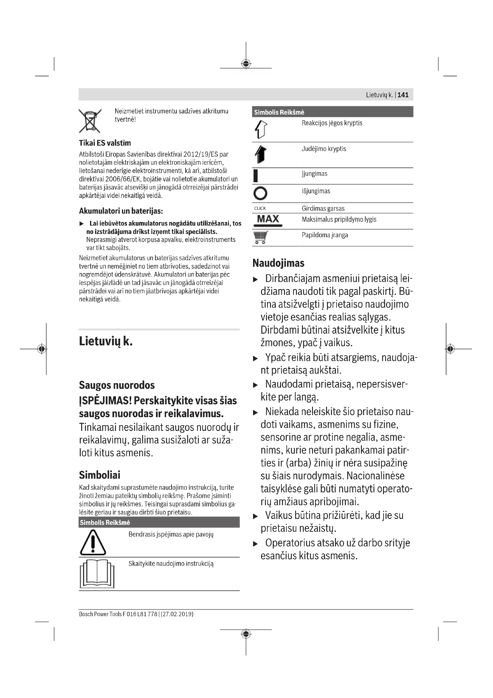 Bosch Power Tools F 016 L81 778 | (27.02.2019)144 | Lietuvių k. Kroviklis Apsaugos klasė / II