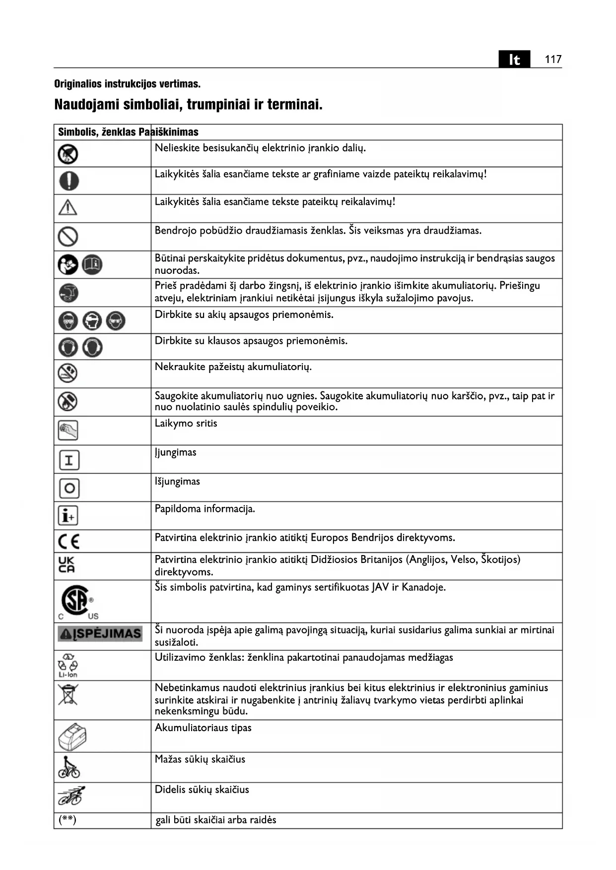 Originalios instrukcijos vertimas. Naudojami simboliai, trumpiniai ir terminai. Simbolis, ženklas Paaiškinimas Nelieskite besisukančių elektrinio įrankio dalių. Laikykitės šalia esančiame tekste ar grafiniame vaizde pateiktų reikalavimų! Laikykitės šalia esančiame tekste pateiktų reikalavimų! Bendrojo pobūdžio draudžiamasis ženklas. Šis veiksmas yra draudžiamas. Būtinai perskaitykite pridėtus dokumentus, pvz., naudojimo instrukciją ir bendrąsias saugos nuorodas. Prieš pradėdami šį darbo žingsnį, iš elektrinio įrankio išimkite akumuliatorių. Priešingu atveju, elektriniam įrankiui netikėtai įsijungus iškyla sužalojimo pavojus. Dirbkite su akių apsaugos priemonėmis. Dirbkite su klausos apsaugos priemonėmis. Nekraukite pažeistų akumuliatorių. Saugokite akumuliatorių nuo ugnies. Saugokite akumuliatorių nuo karščio, pvz., taip pat ir nuo nuolatinio saulės spindulių poveikio. Laikymo sritis Įjungimas Išjungimas Papildoma informacija. Patvirtina elektrinio įrankio atitiktį Europos Bendrijos direktyvoms. Patvirtina elektrinio įrankio atitiktį Didžiosios Britanijos (Anglijos, Velso, Škotijos) direktyvoms. Šis simbolis patvirtina, kad gaminys sertifikuotas JAV ir Kanadoje. Ši nuoroda įspėja apie galimą pavojingą situaciją, kuriai susidarius galima sunkiai ar mirtinai susižaloti. Utilizavimo ženklas: ženklina pakartotinai panaudojamas medžiagas Nebetinkamus naudoti elektrinius įrankius bei kitus elektrinius ir elektroninius gaminius surinkite atskirai ir nugabenkite į antrinių žaliavų tvarkymo vietas perdirbti aplinkai nekenksmingu būdu. Akumuliatoriaus tipas Mažas sūkių skaičius Didelis sūkių skaičius (**) gali būti skaičiai arba raidės118