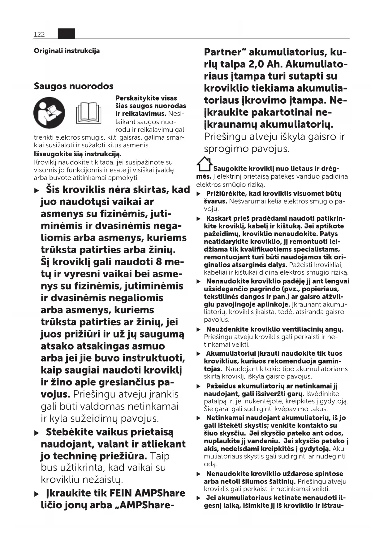 – 4,0Ah min 16/25 – 5,0Ah min 20/35 Akumuliatoriaus celių skaičius 5–15 Svoris pagal „EPTA-Procedure01:2014“ kg 0,95 Apsaugos klasė / II A) priklausomai nuo temperatūros ir akumuliatoriaus tipo B) Akumuliatoriaus įkrova 50% (po įkrovimo su „Power Boost“). Akumuliatorių galima išimti ir iškarto naudoti. C) Akumuliatoriaus įkrova apie 80% (po įkrovimo su „Power Boost“). Akumuliatorių galima išimti ir iškarto naudoti. D) Akumuliatoriaus įkrova apie 80% (po įkrovimo standartiniu įkrovimo režimu). Akumuliatorių galima išimti ir iškarto naudoti. E) Akumuliatoriaus įkrova 97% – 100% (po įkrovimo standartiniu įkrovimo režimu). NaudojimasLietuvių k. MontavimasLietuvių k. u Prieš atlikdami bet kokius kroviklio priežiūros darbus, iš elektros tinklo lizdo ištraukite kištuką. Montavimas ant sienosLietuvių k. Kroviklį galite naudoti pastatytą (padėtą ant stalo/ „desktop use“) arba pakabintą ant sienos. Norėdami pritvirtinti ant sienos: brėžinyje nuro- dytu atstumu išgręžkite dvi kiaurymes. lt 123 34101366060 • 1.6.22Tvirtinkite tik varžtais apvalia galvute, kurių skers- muo nuo 5mm iki 6,5mm. Paruošimas naudotiLietuvių k. u Atkreipkite dėmesį į tinklo įtampą! Elektros srovės šaltinio įtampa turi atitikti nurodytąją kroviklio firminėje lentelėje. 230V pažymėtus krovikliu galima jungti ir į 220V įtampos elekt- ros tinklą. Įkrovimo procesasLietuvių k. Akumuliatorius pradedamas krauti, kai kroviklio kištukas įkišamas į kištukinį lizdą ir akumuliatorius įstatomas į kroviklio lizdą (1). Išmanioji įkrovimo technologija automatiškai at- pažįsta akumuliatoriaus įkrovos būklę ir, pri- klausomai nuo akumuliatoriaus temperatūros ir įtampos, įkrauna optimalia įkrovimo srove. Tai padeda tausoti akumuliatorių, be to, palikus akumuliatorių kroviklyje, jis visada būna visiškai įkrautas. Indikatorių reikšmėsLietuvių k. Žalias akumuliatoriaus įkrovos būklės indikatorius (3)Lietuvių k. 5 žali LED indikatoriai rodo akumulia- toriaus įkrovos būklę įkrovimo metu ir po jo. Nuolat šviečiantis LED rodo, kad akumuliatoriaus talpa apie 20 %. LED būsena Akumuliato- riaus talpa apie 5 LED indikatoriai įsižiebia vienas paskui kitą. < 20% Nuolat šviečia žemiausias LED indikatorius. 20% Nuolat šviečia 2 žemiausi LED indikatoriai. 40% LED būsena Akumuliato- riaus talpa apie Nuolat šviečia 3 žemiausi LED indikatoriai. 60% Nuolat šviečia 4 žemiausi LED indikatoriai. 80% Nuolat šviečia 5 LED indikato- riai. > 95% Nuoroda: įkrovimo procesas gali vykti tik tada, kai akumuliatoriaus temperatūra yra leidžiamo- sios įkrovimo temperatūros intervale, žr. skyrių „Techniniai duomenys“. Raudonas temperatūros kontrolės/klaidos indikatorius (5)Lietuvių k. Šviečia nuolatLietuvių k. Nuolat šviečiantis raudonas indikato- rius rodo, kad akumuliatoriaus tem- peratūra yra už leidžiamosios įkrovi- mo temperatūros diapazono ribų, žr. skyr. „Techniniai duomenys“ Kai pasiekiamas lei- džiamosios temperatūros diapazonas, prasideda įkrovimo procesas. Mirksintis indikatoriusLietuvių k. Mirksintis indikatorius rodo, kad yra pažeistas akumuliatorius arba krovik- lis. Mygtukas „Power Boost“(4)Lietuvių k. Paspaudus mygtuką „Power Boost“(4) suaktyvi- namas greitojo įkrovimo režimas. Tai galima at- likti prieš įstatant akumuliatorių arba esant įstaty- tam akumuliatoriui. Mygtukas „Power Boost“(4) greitojo įkrovimo metu šviečia raudonai. Dar kar- tą paspaudę mygtuką „Power Boost“, vėl sugrįšite į standartinio įkrovimo režimą. Pasibaigus greitajam įkrovimui (pasiekus apie 50% akumuliatoriaus talpos), mygtukas „Power Boost“(4) užgęsta. Jei akumuliatorius lieka kroviklyje, jis toliau įkraunamas. Garsinis signalasLietuvių k. Kai įkrovimo ciklas baigiasi, pasigirsta trumpas garsinis signalas. Gedimas – Priežastis ir pašalinimasLietuvių k. Priežastis Šalinimas Mirksi raudonas temperatūros kontrolės/ klaidos indikatorius (5) Nevyksta įkrovimo procesas Akumuliatorius neįdė- tas (netinkamai įdėtas) Akumuliatorių tinkamai įstatykite į kroviklį Nešvarūs akumuliato- riaus kontaktai Nuvalykite akumuliato- riaus kontaktus (pvz., daug kartų įstatykite ir 124 lt 34101366060 • 1.6.22Priežastis Šalinimas išimkite akumuliatorių), jei reikia, akumuliatorių pakeiskite Pažeistas akumuliato- rius Akumuliatorių pakeis- kite Pažeistas kroviklis Jei reikia, dėl kroviklio patikrinimo kreipkitės į FEIN-elektrinių įrankių remonto dirbtuves Nešviečia žalias akumuliatoriaus įkrovos būklės indikatorius(3) Neįkištas (netinkamai įkištas) kroviklio kištu- kas Kištuką tinkamai įkiškite į kištukinį lizdą Pažeistas kištukinis liz- das, maitinimo laidas arba kroviklis Patikrinkite maitinimo įtampą, jei reikia, dėl kroviklio patikrinimo kreipkitės įFEIN elektri- nių įrankių remonto dirbtuves Darbo patarimaiLietuvių k. Pastebimas įkrauto akumuliatoriaus veikimo laiko sutrumpėjimas rodo, kad akumuliatorius susidė- vėjo ir jį reikia pakeisti. Nuolat veikdamas arba be pertraukos vieną po kito kraudamas kelis akumuliatorius, kroviklis gali įkaisti. Tai yra normalu ir nereiškia kroviklio tech- ninio gedimo. Akumuliatoriaus aušinimas („Active Air Cooling“)Lietuvių k. Kroviklyje integruota ventiliatoriaus valdymo sis- tema kontroliuoja įstatyto akumuliatoriaus tem- peratūrą. Kai tik akumuliatoriaus temperatūra vir- šija 0°C , akumuliatorių pradeda vėdinti ventilia- torius. Įjungtas ventiliatorius sukelia vėdinimo triukšmą. Jei ventiliatorius neveikia, vadinasi jis yra pažeis- tas arba akumuliatoriaus temperatūra yra <0°C. Dėl to gali pailgėti įkrovimo laikas. Įkrovimo procesasLietuvių k. Režimas „Power Boost“Lietuvių k. Pasirinkus „Power Boost“, akumuliatoriai greitojo įkrovimo režimu įkraunami maždaug iki 50% akumuliatoriaus talpos. Todėl akumuliatorius, priešingai 