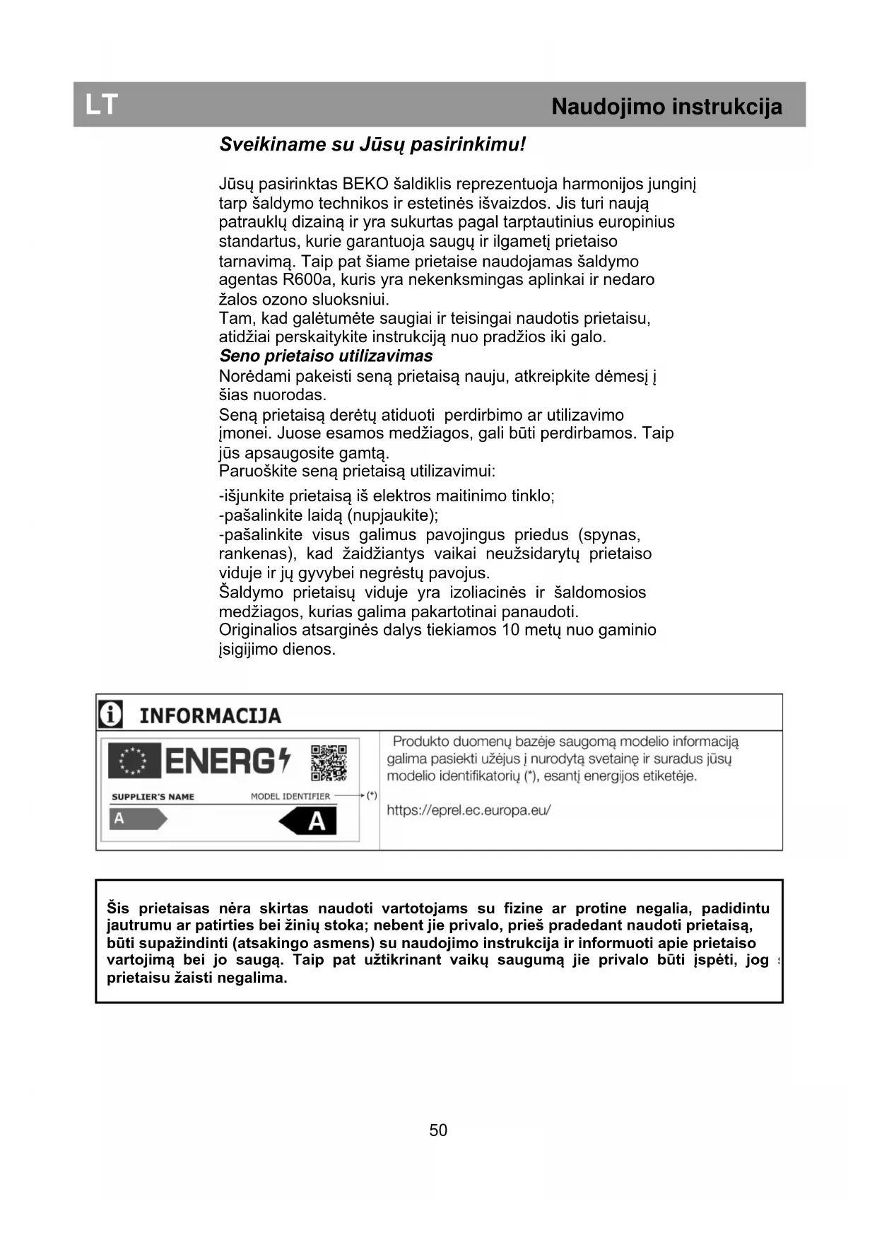 - Koszt połączenia jak za połączenie lokalne (z telefonu stacjonarnego) lub według stawek operatora sieci komórkowej. Podpis i pieczęć instalatora (z numerem uprawnienia) w przypadku montażu urządzeń gazowych lub płyt i piekarników elektrycznych Aby otrzymać więcej informacji dotyczących serwisu BEKO np. gdzie kupić części zamienne lub akcesoria należy odwiedzić stronę internetową www.beko.pl i wybrać zakładkę serwis. 49Sveikiname su Jūsų pasirinkimu! Jūsų pasirinktas BEKO šaldiklis reprezentuoja harmonijos junginį tarp šaldymo technikos ir estetinės išvaizdos. Jis turi naują patrauklų dizainą ir yra sukurtas pagal tarptautinius europinius standartus, kurie garantuoja saugų ir ilgametį prietaiso tarnavimą. Taip pat šiame prietaise naudojamas šaldymo agentas R600a, kuris yra nekenksmingas aplinkai ir nedaro žalos ozono sluoksniui. Tam, kad galėtumėte saugiai ir teisingai naudotis prietaisu, atidžiai perskaitykite instrukciją nuo pradžios iki galo. Seno prietaiso utilizavimas Norėdami pakeisti seną prietaisą nauju, atkreipkite dėmesį į šias nuorodas. Seną prietaisą derėtų atiduoti perdirbimo ar utilizavimo įmonei. Juose esamos medžiagos, gali būti perdirbamos. Taip jūs apsaugosite gamtą. Paruoškite seną prietaisą utilizavimui: -išjunkite prietaisą iš elektros maitinimo tinklo; -pašalinkite laidą (nupjaukite); -pašalinkite visus galimus pavojingus priedus (spynas, rankenas), kad žaidžiantys vaikai neužsidarytų prietaiso viduje ir jų gyvybei negrėstų pavojus. Šaldymo prietaisų viduje yra izoliacinės ir šaldomosios medžiagos, kurias galima pakartotinai panaudoti. Originalios atsarginės dalys tiekiamos 10 metų nuo gaminio įsigijimo dienos.