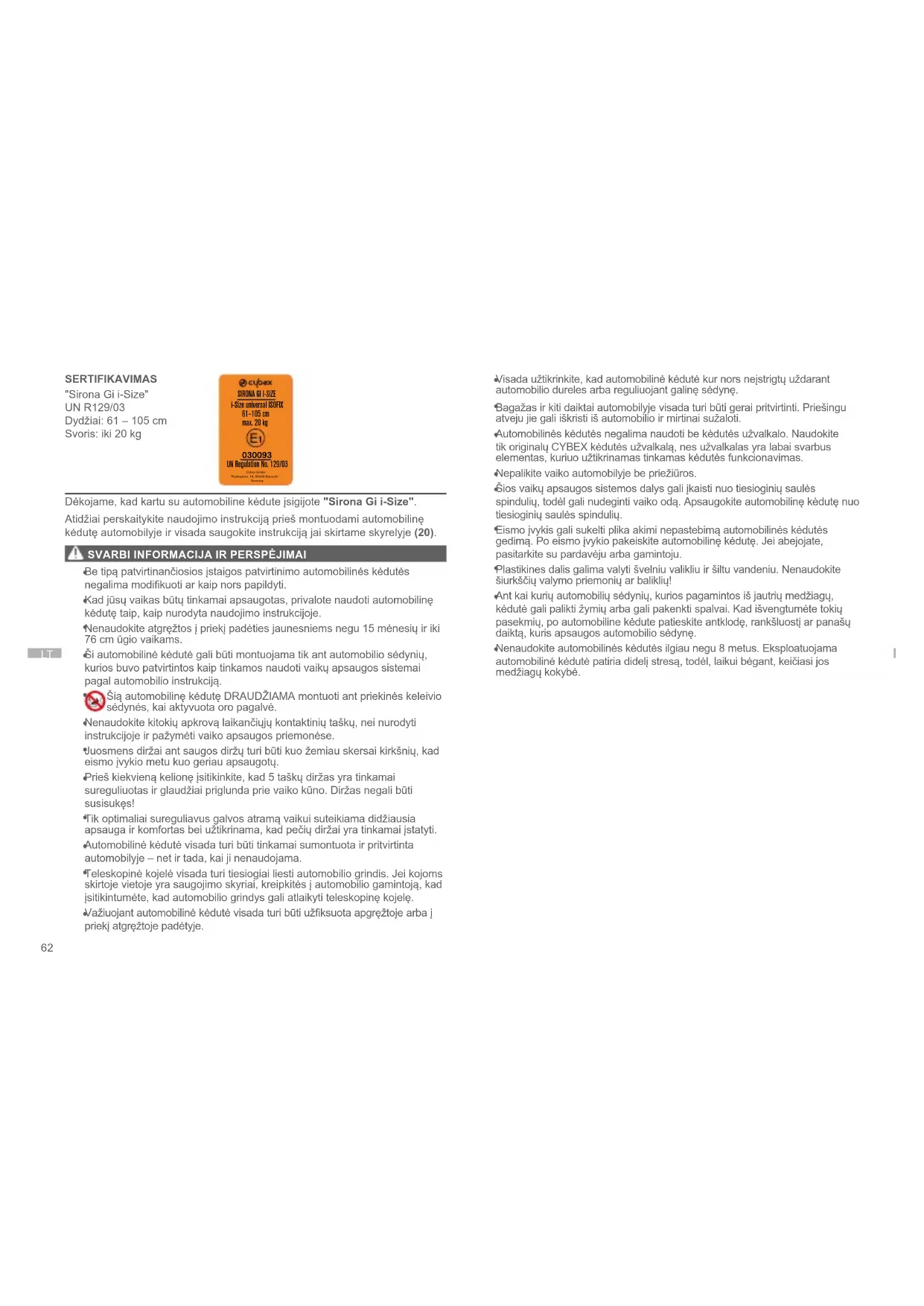 UN Regulation No. 129/03 Cybex GmbH Riedingerstr. 18, 95448 Bayreuth Germany Dėkojame, kad kartu su automobiline kėdute įsigijote "Sirona Gi i-Size". Atidžiai perskaitykite naudojimo instrukciją prieš montuodami automobilinę kėdutę automobilyje ir visada saugokite instrukciją jai skirtame skyrelyje (20).