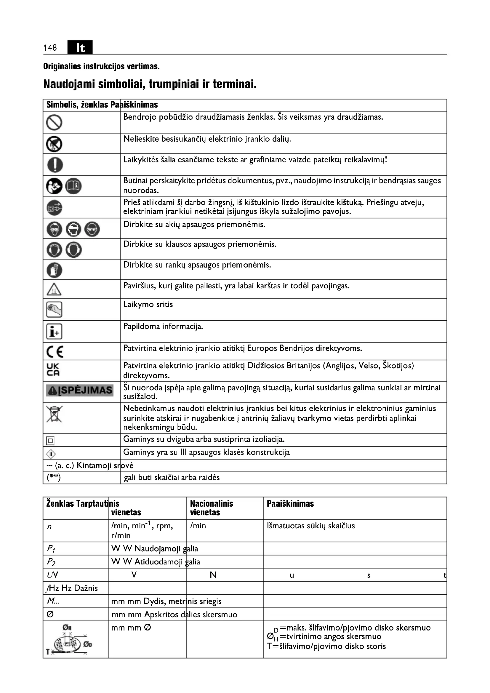 Originalios instrukcijos vertimas. Naudojami simboliai, trumpiniai ir terminai. Simbolis, ženklas Paaiškinimas Bendrojo pobūdžio draudžiamasis ženklas. Šis veiksmas yra draudžiamas. Nelieskite besisukančių elektrinio įrankio dalių. Laikykitės šalia esančiame tekste ar grafiniame vaizde pateiktų reikalavimų! Būtinai perskaitykite pridėtus dokumentus, pvz., naudojimo instrukciją ir bendrąsias saugos nuorodas. Prieš atlikdami šį darbo žingsnį, iš kištukinio lizdo ištraukite kištuką. Priešingu atveju, elektriniam įrankiui netikėtai įsijungus iškyla sužalojimo pavojus. Dirbkite su akių apsaugos priemonėmis. Dirbkite su klausos apsaugos priemonėmis. Dirbkite su rankų apsaugos priemonėmis. Paviršius, kurį galite paliesti, yra labai karštas ir todėl pavojingas. Laikymo sritis Papildoma informacija. Patvirtina elektrinio įrankio atitiktį Europos Bendrijos direktyvoms. Patvirtina elektrinio įrankio atitiktį Didžiosios Britanijos (Anglijos, Velso, Škotijos) direktyvoms. Ši nuoroda įspėja apie galimą pavojingą situaciją, kuriai susidarius galima sunkiai ar mirtinai susižaloti. Nebetinkamus naudoti elektrinius įrankius bei kitus elektrinius ir elektroninius gaminius surinkite atskirai ir nugabenkite į antrinių žaliavų tvarkymo vietas perdirbti aplinkai nekenksmingu būdu. Gaminys su dviguba arba sustiprinta izoliacija. Gaminys yra su III apsaugos klasės konstrukcija ~ (a. c.) Kintamoji srovė (**) gali būti skaičiai arba raidės Ženklas Tarptautinis vienetas Nacionalinis vienetas Paaiškinimas