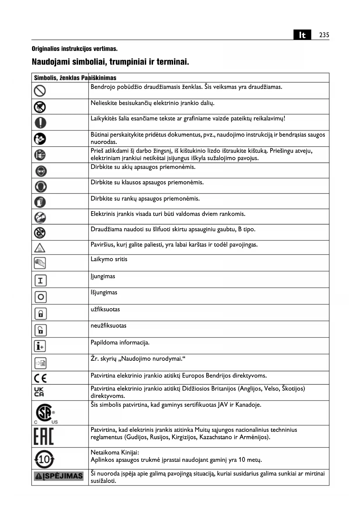 Originalios instrukcijos vertimas. Naudojami simboliai, trumpiniai ir terminai. Simbolis, ženklas Paaiškinimas Bendrojo pobūdžio draudžiamasis ženklas. Šis veiksmas yra draudžiamas. Nelieskite besisukančių elektrinio įrankio dalių. Laikykitės šalia esančiame tekste ar grafiniame vaizde pateiktų reikalavimų! Būtinai perskaitykite pridėtus dokumentus, pvz., naudojimo instrukciją ir bendrąsias saugos nuorodas. Prieš atlikdami šį darbo žingsnį, iš kištukinio lizdo ištraukite kištuką. Priešingu atveju, elektriniam įrankiui netikėtai įsijungus iškyla sužalojimo pavojus. Dirbkite su akių apsaugos priemonėmis. Dirbkite su klausos apsaugos priemonėmis. Dirbkite su rankų apsaugos priemonėmis. Elektrinis įrankis visada turi būti valdomas dviem rankomis. Draudžiama naudoti su šlifuoti skirtu apsauginiu gaubtu, B tipo. Paviršius, kurį galite paliesti, yra labai karštas ir todėl pavojingas. Laikymo sritis Įjungimas Išjungimas užfiksuotas neužfiksuotas Papildoma informacija. Žr. skyrių „Naudojimo nurodymai.“ Patvirtina elektrinio įrankio atitiktį Europos Bendrijos direktyvoms. Patvirtina elektrinio įrankio atitiktį Didžiosios Britanijos (Anglijos, Velso, Škotijos) direktyvoms. Šis simbolis patvirtina, kad gaminys sertifikuotas JAV ir Kanadoje. Patvirtina, kad elektrinis įrankis atitinka Muitų sąjungos nacionalinius techninius reglamentus (Gudijos, Rusijos, Kirgizijos, Kazachstano ir Armėnijos). Netaikoma Kinijai: Aplinkos apsaugos trukmė įprastai naudojant gaminį yra 10 met