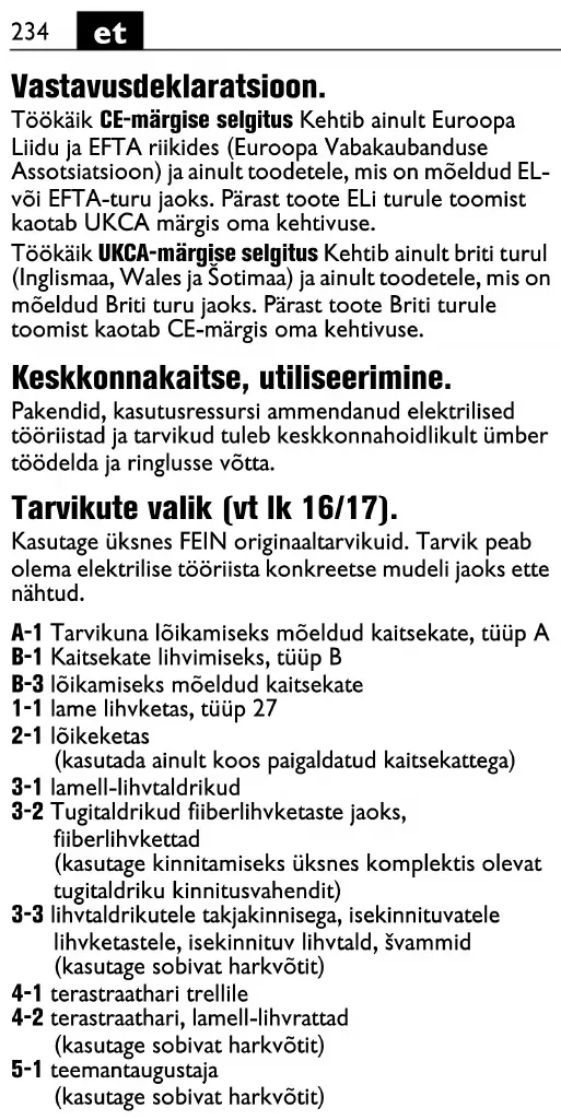 Nebandykite pagauti krentančio elektrinio įrankio. Nenaudokite apsaugo nuo kritimo arti judančių dalių. Jos gali įtraukti apsaugą nuo kritimo ir sukelti didelį pavojų. Prieš naudodami apsaugą nuo kritimo patikrinkite, ar tinkamai užfiksuotos nuimamos elektrinio įrankio dalys. Įsitikinkite, kad apsaugo nuo kritimo naudojimas nepakenks elektrinio įrankio ir jo apsauginių įtaisų naudojimui. Apsaugą nuo nukritimo prie numatyto elektrinio įrankio tvirtinimo taško prijunkite tik taip, kaip parodyta čia (žr. psl. 6). Techninė priežiūra ir remonto dirbtuvės. Atkreipkite dėmesį, kad elektrinius įrankius leidžiama remontuoti, prižiūrėti ir tikrinti tik kvalifikuotiems elektrikams, nes netinkama priežiūra ir remontas gali sukelti didelį pavojų naudotojui. Esant ekstremalioms eksploatavimo sąlygoms, apdorojant metalus elektrinio įrankio viduje gali susikaupti laidžių dulkių. Gali būti pažeista elektrinio įrankio apsauginė izoliacija. Elektrinio įrankio vidų per ventiliacines angas dažnai prapūskite sausu suslėgtu oru be alyvos. Apdorojant medžiagas, kurių sudėtyje yra gipso, elektrinio įrankio viduje ir ant jungiamojo elemento gali susikaupti dulkių, ir jos gali dėl santykio su oro drėgme sukietėti. Dėl to gali sutrikti jungiamasis mechanizmas. Elektrinio įrankio vidų per ventiliacines angas ir jungiamąjį elementą dažnai prapūskite sausu suslėgtu oru, kuriame nėra alyvos. Gaminius kurie lietėsi su asbestu, draudžiama perduoti remontui. Asbestu užterštus gaminius šalinkite pagal jūsų šalyje asbesto turinčių atliekų tvarkymą reglamentuojančius tesės aktus. Jei reikia remontuoti FEIN elektrinius į rankius ir papildomą įrangą, prašome kreiptis į FEIN klientų aptarnavimo skyrių. Adresą rasite internete www.fein.com. Atnaujinkite pasenusius ir nusitrynusius lipdukus ir įspėjamąsias nuorodas. Šio elektrinio įrankio atsarginių dalių naujausią sąrašą rasite internete www.fein.com. Naudokite tik originalias atsargines dalis. Šias dalis, jei reikia, galite pakeisti patys: Darbo įrankius, papildomą rankeną, prispaudžiamąsias junges, apsauginį gaubtą, rankų apsaugą Įstatyminė garantija ir savanoriška gamintojo garantija. Gaminiui įstatyminė garantija suteikiama pagal šalyje, kurioje buvo pateiktas rinkai, galiojančius įstatyminius aktus. Be to, FEIN suteikia garantiją pagal FEIN gamintojo garantinį raštą. Jūsų elektrinio įrankio tiekiamame komplekte gali būti tik dalis šioje naudojimo instrukcijoje aprašytos ar pavaizduotos papildomos įrangos. Atitikties deklaracija. CE deklaracija galioja tik Europos Sąjungos ir ELPA (Europos laisvosios prekybos asociacijos) šalyse ir tik ES arba ELPA rinkai skirtiems gaminiams. Pateikus gaminį į ES rinką, UKCA ženklas netenka galios. UKCA deklaracija galioja tik Jungtinės Karalystės (Anglijos, Velso ir Škotijos) rinkai ir tik Jungtinės Karalystės rinkai skirtiems produktams. Pateikus gaminį į JK rinką, CE ženklas netenka galios. Aplinkosauga, šalinimas. Pakuotės, nebetinkami naudoti elektriniai įrankiai ir papildoma įranga turi būti perdirbami aplinkai nekenksmingu būdu. Papildomos įrangos pasirinkimas (žr. 16/17 psl.). Naudokite tik originalią FEIN papildomą įrangą. Papildoma įranga turi būti skirta naudojamo elektrinio įrankio tipui. A-1 Apsauginis gaubtas, skirtas pjauti, A tipo B-1 Apsauginis gaubtas, skirtas šlifuoti, B tipo B-3 Apsauginis dangtis, skirtas pjauti 1-1 Rupiojo šlifavimo diskas, 27 tipo 2-1 Pjovimo diskas (naudoti tik su primontuotu apsauginiu dangčiu) 3-1 Vėduoklinis šlifavimo diskas 3-2 Guminis diskas fibriniams šlifavimo popieriaus lapeliams, fibriniai šlifavimo popieriaus lapeliai (tvirtinti tik su kartu pateikta guminio disko tvirtinimo priemone) 3-3 Šlifavimo diskas su kibiąja jungtimi, kibieji šlifavimo popieriaus lapeliai, kibusis karšinio diskas šlifavimui, kempinėlės (naudokite tinkamą veržliaraktį) 4-1 Vielinis kūginis šepetys 4-2 Cilindrinis šepetys, plokšteliniai cilindriniai šlifavimo antgaliai (naudokite tinkamą veržliaraktį) 5-1 Deimantinė skylių freza (naudokite tinkamą veržliaraktį)243