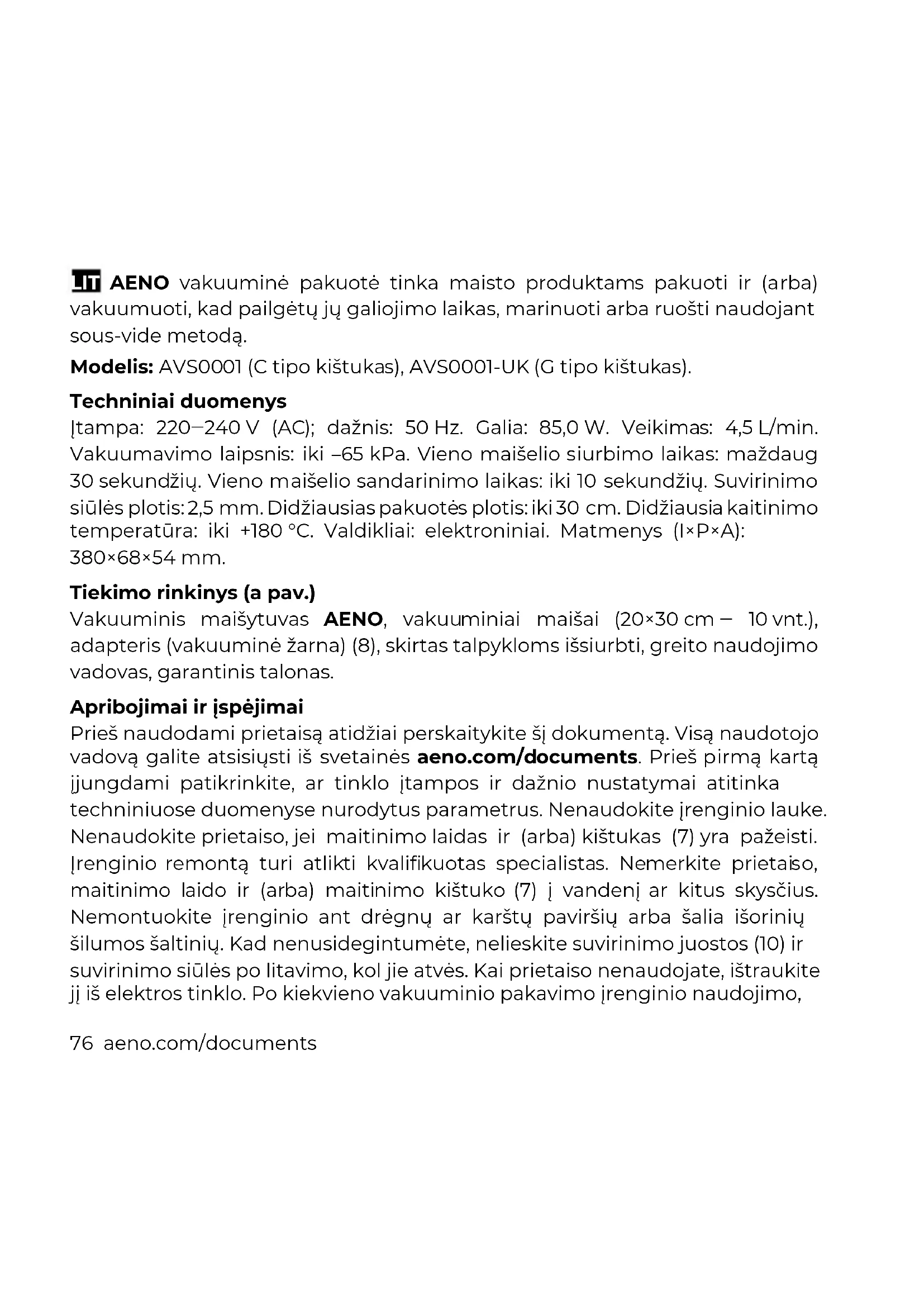 ASBISc patur tiesības modificēt ierīci un veikt izmaiņas un labojumusšajā dokumentā bez iepriekšēja brīdinājuma lietotājiem. Garantijas termiņš un kalpošanas laiks ir 2 gadi no produkta iegādes datuma. Ražotāja dati: ASBISc Enterprises PLC, Iapetou, 1, Agios Athanasios, 4101, Limassol, Cyprus (Kipra). Ražots Ķīnā. Jaunākā informācija un detalizēti ierīču apraksti, kā arī pievienošanas instrukcijas, sertifikāti, kvalitātes prasību un garantijas informācija ir pieejama lejupielādei vietnē aeno.com/documents. Visas minētās preču zīmes un zīmolu nosaukumi ir to attiecīgo īpašnieku īpašums.76 aeno.com/documents LIT AENO vakuuminė pakuotė tinka maisto produktams pakuoti ir (arba) vakuumuoti, kad pailgėtų jų galiojimo laikas, marinuoti arba ruošti naudojant sous-vide metodą. Modelis: AVS0001 (C tipo kištukas), AVS0001-UK (G tipo kištukas). Techniniai duomenys Įtampa: 220‒240 V (AC); dažnis: 50 Hz. Galia: 85,0 W. Veikimas: 4,5 L/min. Vakuumavimo laipsnis: iki –65 kPa. Vieno maišelio siurbimo laikas: maždaug 30 sekundžių. Vieno maišelio sandarinimo laikas: iki 10 sekundžių. Suvirinimo siūlės plotis: 2,5 mm. Didžiausias pakuotės plotis: iki 30 cm. Didžiausia kaitinimo temperatūra: iki +180 °C. Valdikliai: elektroniniai. Matmenys (I×P×A): 380×68×54 mm. Tiekimo rinkinys (a pav.) Vakuuminis maišytuvas AENO, vakuuminiai maišai (20×30 cm ‒ 10 vnt.), adapteris (vakuuminė žarna) (8), skirtas talpykloms išsiurbti, greito naudojimo vadovas, garantinis talonas. Apribojimai ir įspėjimai Prieš naudodami prietaisą atidžiai perskaitykite šį dokumentą. Visą naudotojo vadovą galite atsisiųsti iš svetainės aeno.com/documents. Prieš pirmą kartą įjungdami patikrinkite, ar tinklo įtampos ir dažnio nustatymai atitinka techniniuose duomenyse nurodytus parametrus. Nenaudokite įrenginio lauke. Nenaudokite prietaiso, jei maitinimo laidas ir (arba) kištukas (7) yra pažeisti. Įrenginio remontą turi atlikti kvalifikuotas specialistas. Nemerkite prietaiso, maitinimo laido ir (arba) maitinimo kištuko (7) į vandenį ar kitus skysčius. Nemontuokite įrenginio ant drėgnų ar karštų paviršių arba šalia išorinių šilumos šaltinių. Kad nenusidegintumėte, nelieskite suvirinimo juostos (10) ir suvirinimo siūlės po litavimo, kol jie atvės. Kai prietaiso nenaudojate, ištraukite jį iš elektros tinklo. Po kiekvieno vakuuminio pakavimo įrenginio naudojimo,aeno.com/documents 77 ypač jei ant suvirinimo juostos (10) liko plastiko likučių ar skysčio arba jei į vakuuminį rezervuarą (11) pateko trupinių ar maisto dalelių, būtina išvalyti. Atjunkite prietaisą iš elektros lizdo ištraukdami kištuką (7) ir leiskite jam atvėsti. Nuvalykite jo paviršių minkštu skudurėliu, pamirkytu šiltame vandenyje arba švelniame muilo tirpale. Tada nuvalykite minkšta švariu vandeniu sudrėkinta šluoste ir nusausinkite. Nenaudokite aštrių ploviklių, abrazyvinių pastų, blizgiklių arba ploviklių, kurių sudėtyje yra rūgščių ar tirpiklių. Vakuumine pakuote vakuumuokite ir (arba) sandarinkite tik sausus produktus. Prietaisas nėra skirtas drėgnam ar skystam maistui apdoroti. Naudokite tik specialius vakuuminėms pakuotėms skirtus maišelius ir talpyklas. Kartu su vakuuminiu pakuotoju tiekiamas adapteris (vakuuminė žarna) (8) naudojamas tik orui iš specialių vakuuminių talpyklų išsiurbti. Prieš dėdami į mikrobangų krosnelę maišelyje ar inde supakuotą maistą, padarykite maišelyje skylutę arba atidarykite indo išleidimo vožtuvą (13), kad išeitų garai. Naudokite tik gamintojo rekomenduojamus priedus, eksploatacines medžiagas ir (arba) atsargines dalis. Išsamią informaciją rasite išsamiame vadove, kurį galite atsisiųsti iš aeno.com/documents. Nepalikite įjungto prietaiso be priežiūros. Po naudojimo leiskite prietaisui atvėsti. Prietaisą gali naudoti tik riboto judrumo asmenys, tiesiogiai prižiūrimi ir kontroliuojami. Kai prietaisas nenaudojamas, kad sandariklis (9) nesideformuotų ir nesutriktų prietaiso veikimas, patartina į vakuuminę pakuotę įdėti popierinį įdėklą ir laisvai uždaryti dangtį neužrakinant dangčio užraktų (12). Neleiskite vaikams naudotis ir (arba) žaisti su prietaisu. Įrenginio valdymas Prieš pirmą kartą įjungdami vakuuminį pakavimo įrenginį įsitikinkite, kad iš jo pašalinta visa pakavimo medžiaga. Sandarinimo maišeliai