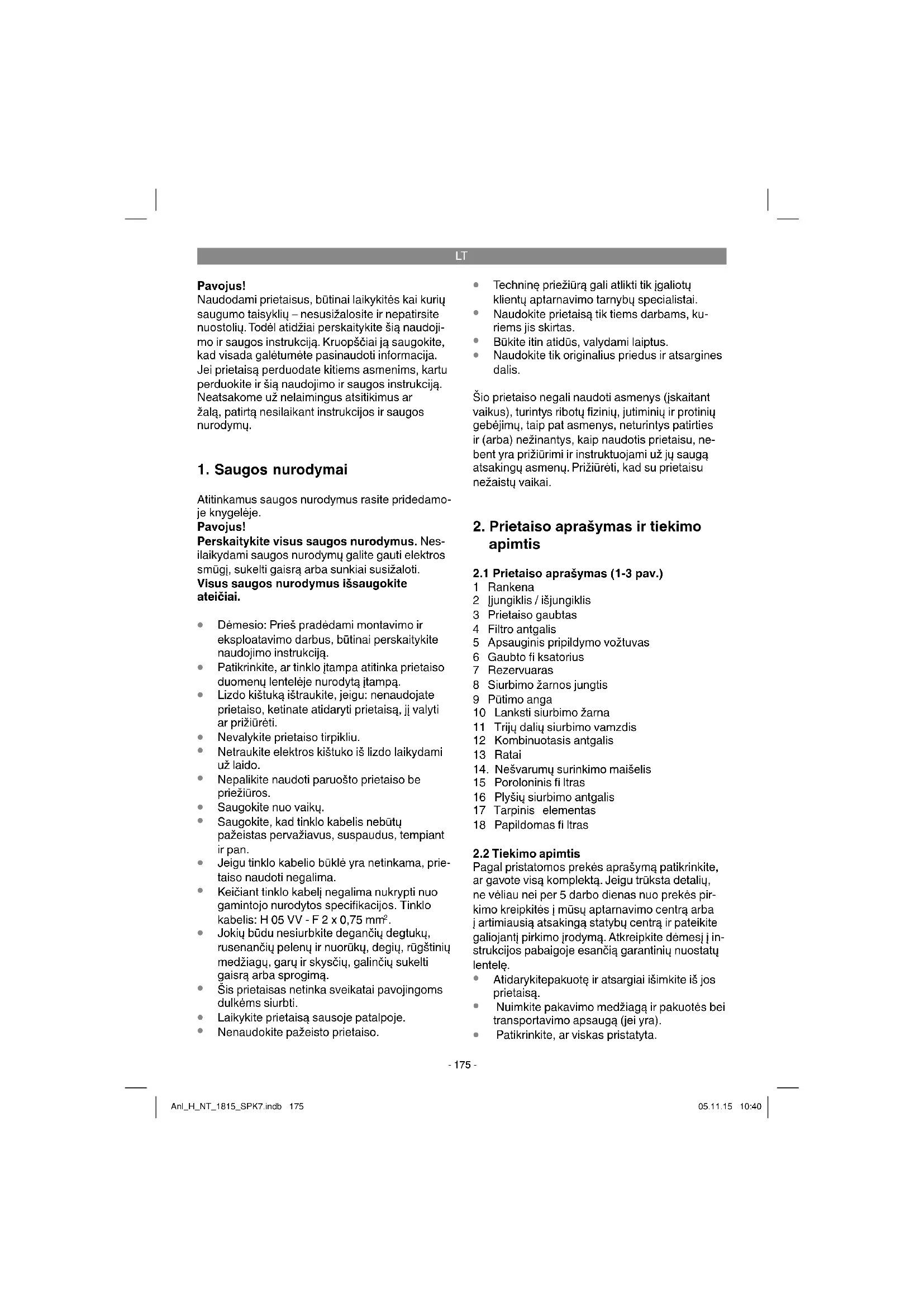 Tik ES šalims Elektros prietaisų neišmeskite kartu su buitinėmis atliekomis! Remiantis ES elektros ir elektronikos atliekų direktyva 2012/19/EB ir jos perkėlimu į nacionalinę teisinę bazę, panaudotus elektros prietaisus reikia surinkti ir perdirbti nekenkiant aplinkai. Perdirbimas - grąžinimo alternatyva: Elektros prietaiso savininkas įpareigotas negrąžinti pasirinktą prietaisą, bet tinkamai jį utilizuoti. Tuo tikslu elektros ir elektronikos atliekos gali būti perduotos atliekų tvarkymu užsiimančioms įmonėms, kurios jas utilizuoja remdamiesi nacionaliniu atliekų perdirbimo pramonės ir atliekų tvarkymo įstatymu. Šis reikalavimas netaikomas elektros prietaisuose panaudotiems priedams ir pagalbinėms priemonėms, kurių sudėtyje nėra elektros dalių. Perspausdinimas ar bet koks visų gaminio dokumentų visas ar dalinis dauginimas leidžiamas tik gavus aiškų iSC GmbH leidimą. Teisę atlikti techninius pakeitimus pasiliekame sau Anl_H_NT_1815_SPK7.indb 179Anl_H_NT_1815_SPK7.indb 179 05.11.15 10:4005.11.15 10:40LT