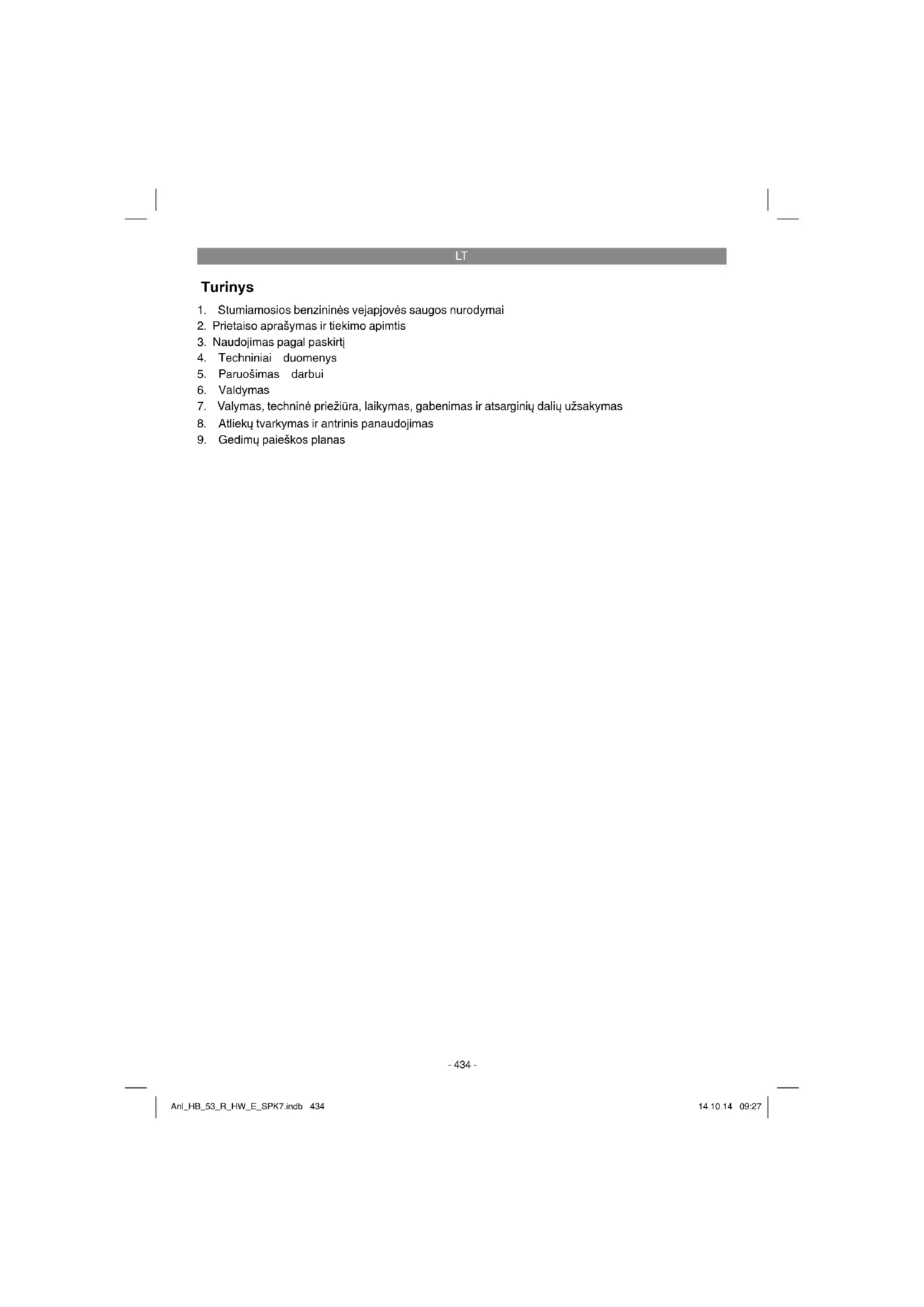 bei variklio įdėkite kelis sluoksnius gofruoto kartono, kad nesusibraižytų. 7.5. Eksploatacinės ir nusidėvinčios medžiagos, atsarginės detalės Garantija nesuteikiama atsarginėms detalėms, eksploatacinėms ir besidėvinčioms medžiagoms, pvz., variklio tepalui, trapeciniam diržui, degimo žvakėms, oro fi ltro įdėklams, benzino fi ltrams, ba- terijoms arba peiliui. Anl_HB_53_R_HW_E_SPK7.indb 445Anl_HB_53_R_HW_E_SPK7.indb 445 14.10.14 09:2714.10.14 09:27LT