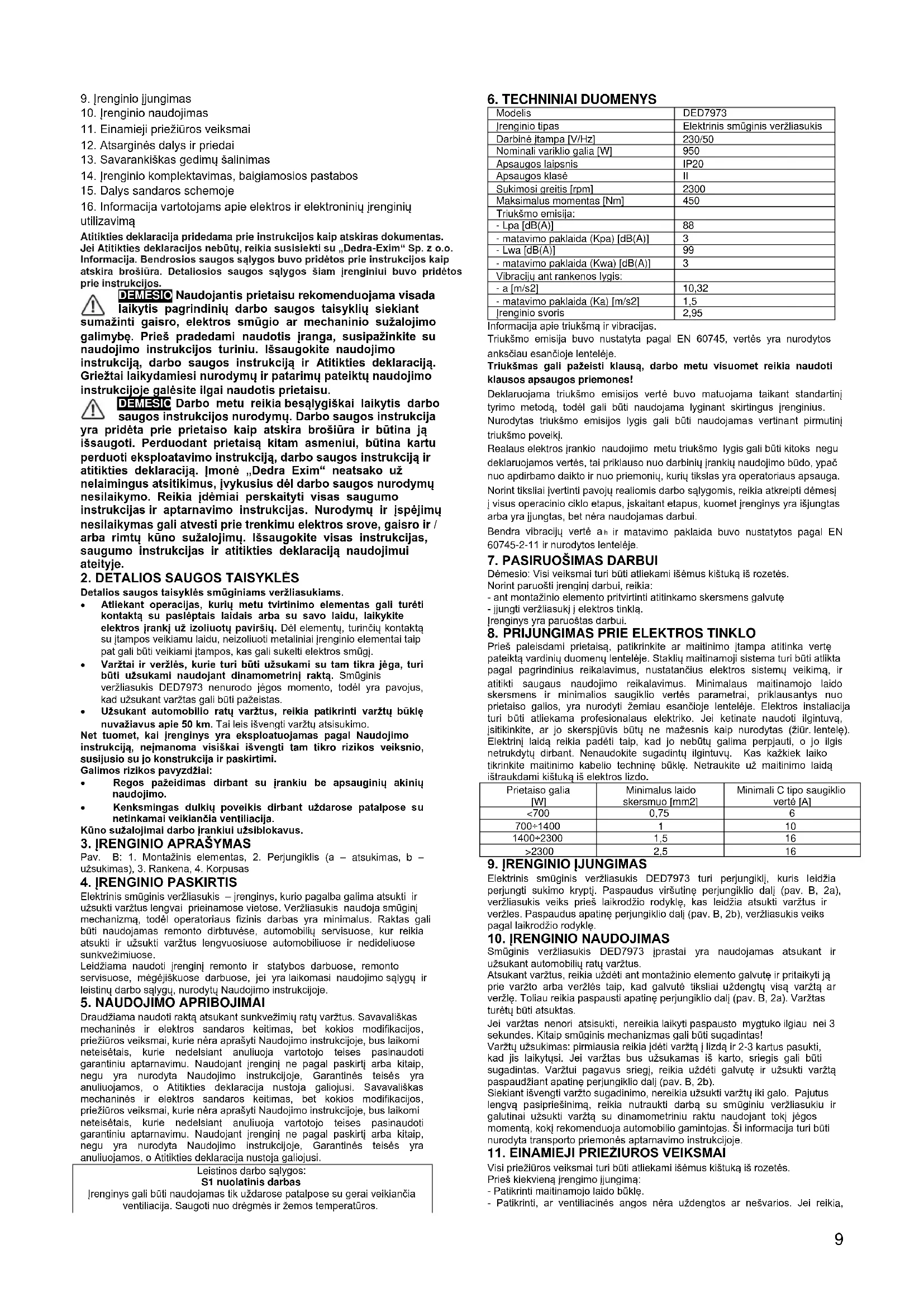 utilizavimą Atitikties deklaracija pridedama prie instrukcijos kaip atskiras dokumentas. Jei Atitikties deklaracijos nebūtų, reikia susisiekti su „Dedra-Exim“ Sp. z o.o. Informacija. Bendrosios saugos sąlygos buvo pridėtos prie instrukcijos kaip atskira brošiūra. Detaliosios saugos sąlygos šiam įrenginiui buvo pridėtos prie instrukcijos. DEMESIO Naudojantis prietaisu rekomenduojama visada laikytis pagrindinių darbo saugos taisyklių siekiant sumažinti gaisro, elektros smūgio ar mechaninio sužalojimo galimybę. Prieš pradedami naudotis įranga, susipažinkite su naudojimo instrukcijos turiniu. Išsaugokite naudojimo instrukciją, darbo saugos instrukciją ir Atitikties deklaraciją. Griežtai laikydamiesi nurodymų ir patarimų pateiktų naudojimo instrukcijoje galėsite ilgai naudotis prietaisu. DEMESIO Darbo metu reikia besąlygiškai laikytis darbo saugos instrukcijos nurodymų. Darbo saugos instrukcija yra pridėta prie prietaiso kaip atskira brošiūra ir būtina ją išsaugoti. Perduodant prietaisą kitam asmeniui, būtina kartu perduoti eksploatavimo instrukciją, darbo saugos instrukciją ir atitikties deklaraciją. Įmonė „Dedra Exim“ neatsako už nelaimingus atsitikimus, įvykusius dėl darbo saugos nurodymų nesilaikymo. Reikia įdėmiai perskaityti visas saugumo instrukcijas ir aptarnavimo instrukcijas. Nurodymų ir įspėjimų nesilaikymas gali atvesti prie trenkimu elektros srove, gaisro ir / arba rimtų kūno sužalojimų. Išsaugokite visas instrukcijas, saugumo instrukcijas ir atitikties deklaraciją naudojimui ateityje.