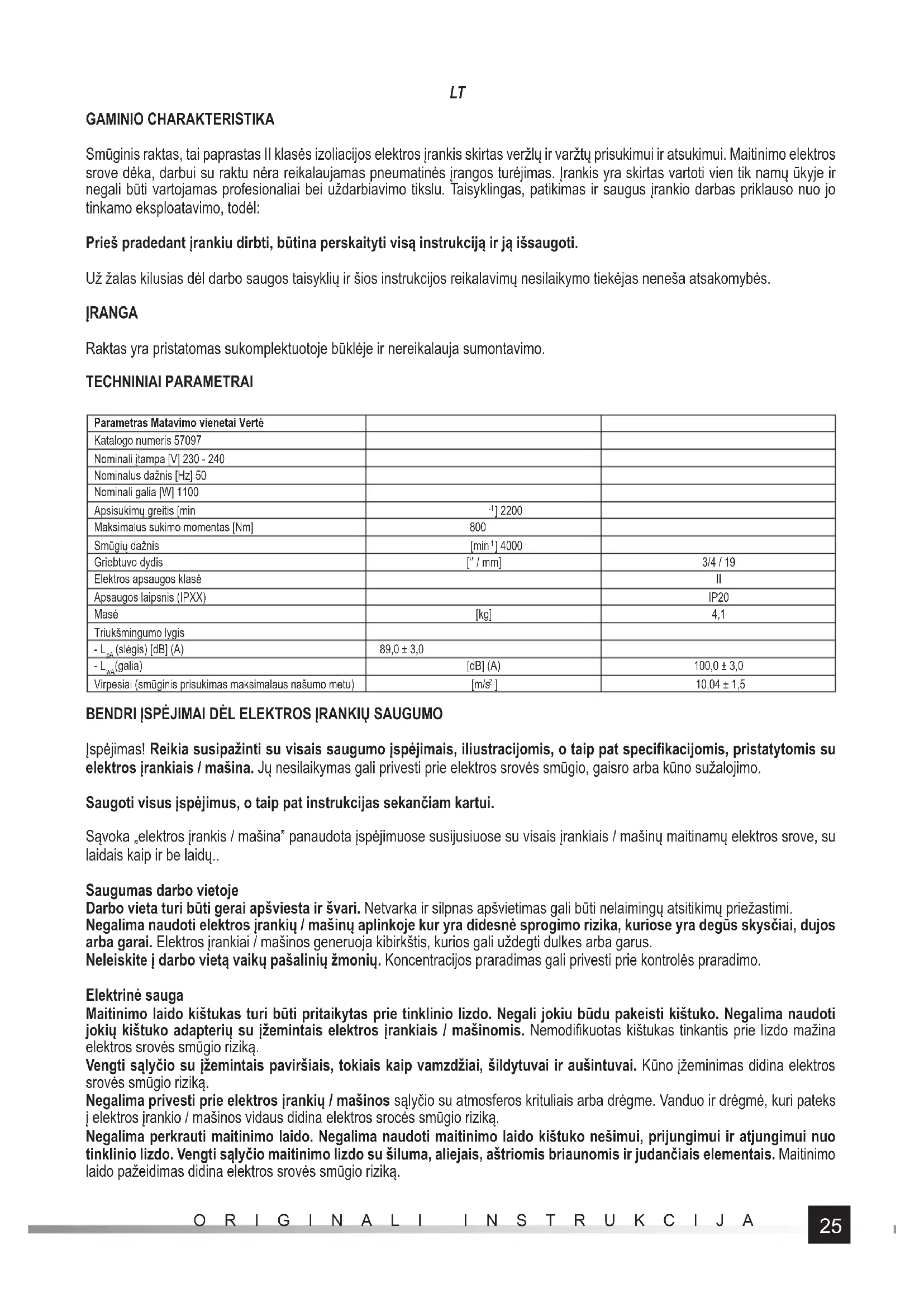 GAMINIO CHARAKTERISTIKA Smūginis raktas, tai paprastas II klasės izoliacijos elektros įrankis skirtas veržlų ir varžtų prisukimui ir atsukimui. Maitinimo elektros srove dėka, darbui su raktu nėra reikalaujamas pneumatinės įrangos turėjimas. Įrankis yra skirtas vartoti vien tik namų ūkyje ir negali būti vartojamas profesionaliai bei uždarbiavimo tikslu. Taisyklingas, patikimas ir saugus įrankio darbas priklauso nuo jo tinkamo eksploatavimo, todėl: Prieš pradedant įrankiu dirbti, būtina perskaityti visą instrukciją ir ją išsaugoti. Už žalas kilusias dėl darbo saugos taisyklių ir šios instrukcijos reikalavimų nesilaikymo tiekėjas neneša atsakomybės. ĮRANGA Raktas yra pristatomas sukomplektuotoje būklėje ir nereikalauja sumontavimo. TECHNINIAI PARAMETRAI Parametras Matavimo vienetai Vertė Katalogo numeris 57097 Nominali įtampa [V] 230 - 240 Nominalus dažnis [Hz] 50 Nominali galia [W] 1100 Apsisukimų greitis [min