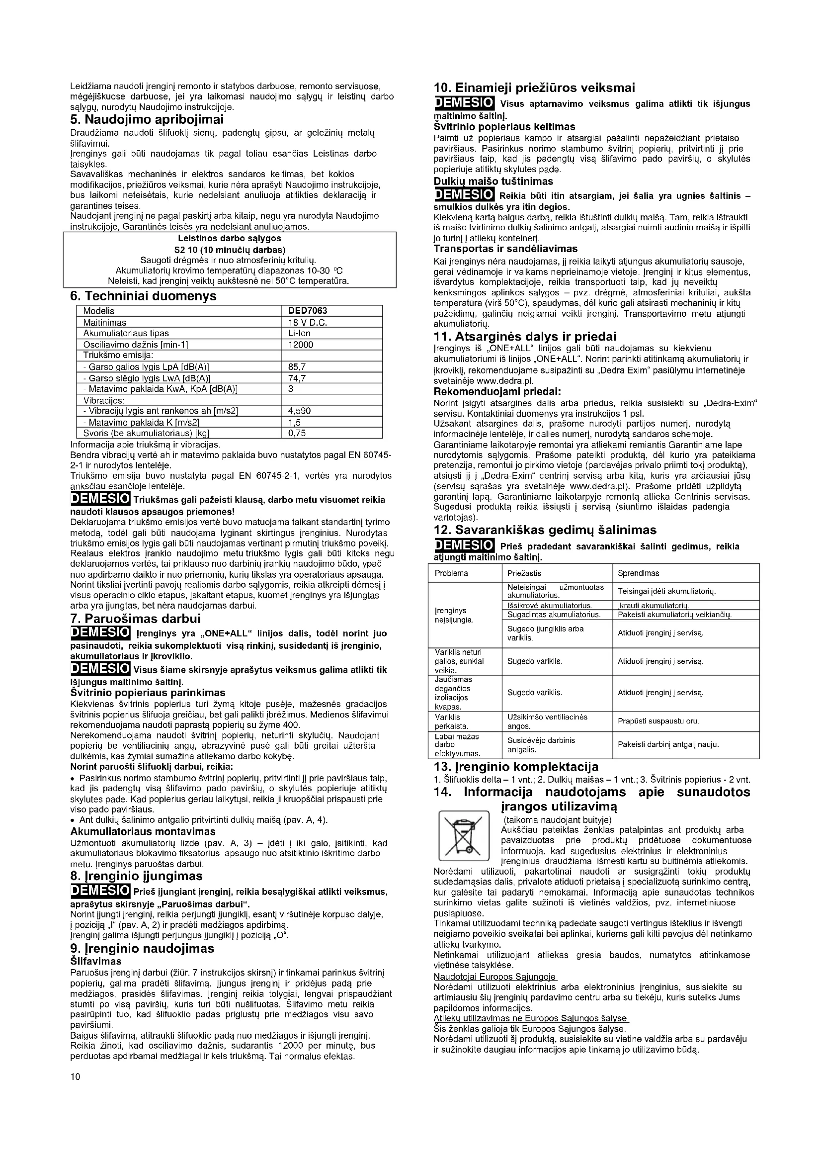 DEMESIO Visus aptarnavimo veiksmus galima atlikti tik išjungus maitinimo šaltinį. Švitrinio popieriaus keitimas Paimti už popieriaus kampo ir atsargiai pašalinti nepažeidžiant prietaiso paviršiaus. Pasirinkus norimo stambumo švitrinį popierių, pritvirtinti jį prie paviršiaus taip, kad jis padengtų visą šlifavimo pado paviršių, o skylutės popieriuje atitiktų skylutes pade. Dulkių maišo tuštinimas DEMESIO Reikia būti itin atsargiam, jei šalia yra ugnies šaltinis – smulkios dulkės yra itin degios. Kiekvieną kartą baigus darbą, reikia ištuštinti dulkių maišą. Tam, reikia ištraukti iš maišo tvirtinimo dulkių šalinimo antgalį, atsargiai nuimti audinio maišą ir išpilti jo turinį į atliekų konteinerį. Transportas ir sandėliavimas Kai įrenginys nėra naudojamas, jį reikia laikyti atjungus akumuliatorių sausoje, gerai vėdinamoje ir vaikams neprieinamoje vietoje. Įrenginį ir kitus elementus, išvardytus komplektacijoje, reikia transportuoti taip, kad jų neveiktų kenksmingos aplinkos sąlygos – pvz. drėgmė, atmosferiniai krituliai, aukšta temperatūra (virš 50°C), spaudymas, dėl kurio gali atsirasti mechaninių ir kitų pažeidimų, galinčių neigiamai veikti įrenginį. Transportavimo metu atjungti akumuliatorių.