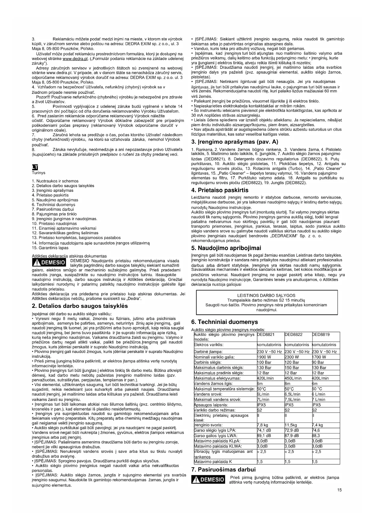 servise arba raštu adresu: „DEDRA EXIM“ Sp. z o. o., ul. 3 Maja 8, 05-800 Pruškuvas. Vartotojas gali pateikti pretenziją, pasinaudodamas blanku, kuris yra internetinėje svetainėje: www.dedra.pl (Pretenzijos garantiniame laikotarpyje pateikimo forma).