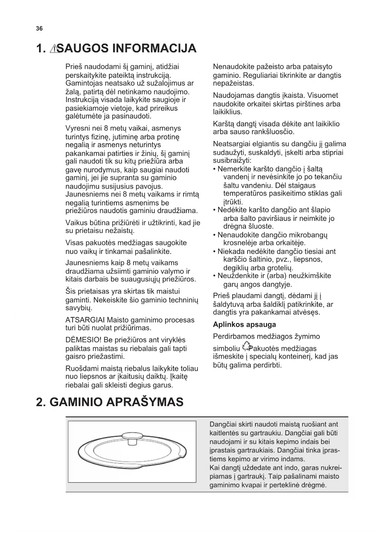 Prieš naudodami šį gaminį, atidžiai perskaitykite pateiktą instrukciją. Gamintojas neatsako už sužalojimus ar žalą, patirtą dėl netinkamo naudojimo. Instrukciją visada laikykite saugioje ir pasiekiamoje vietoje, kad prireikus galėtumėte ja pasinaudoti. Vyresni nei 8 metų vaikai, asmenys turintys fizinę, jutiminę arba protinę negalią ir asmenys neturintys pakankamai patirties ir žinių, šį gaminį gali naudoti tik su kitų priežiūra arba gavę nurodymus, kaip saugiai naudoti gaminį, jei jie supranta su gaminio naudojimu susijusius pavojus. Jaunesniems nei 8 metų vaikams ir rimtą negalią turintiems asmenims be priežiūros naudotis gaminiu draudžiama. Vaikus būtina prižiūrėti ir užtikrinti, kad jie su prietaisu nežaistų. Visas pakuotės medžiagas saugokite nuo vaikų ir tinkamai pašalinkite. Jaunesniems kaip 8 metų vaikams draudžiama užsiimti gaminio valymo ir kitais darbais be suaugusiųjų priežiūros. Šis prietaisas yra skirtas tik maistui gaminti. Nekeiskite šio gaminio techninių savybių. ATSARGIAI Maisto gaminimo procesas turi būti nuolat prižiūrimas. DĖMESIO! Be priežiūros ant viryklės paliktas maistas su riebalais gali tapti gaisro priežastimi. Ruošdami maistą riebalus laikykite toliau nuo liepsnos ar įkaitusių daiktų. Įkaitę riebalai gali skleisti degius garus. Nenaudokite pažeisto arba pataisyto gaminio. Reguliariai tikrinkite ar dangtis nepažeistas. Naudojamas dangtis įkaista. Visuomet naudokite orkaitei skirtas pirštines arba laikiklius. Karštą dangtį visada dėkite ant laikiklio arba sauso rankšluosčio. Neatsargiai elgiantis su dangčiu jį galima sudaužyti, suskaldyti, įskelti arba stipriai susibraižyti: