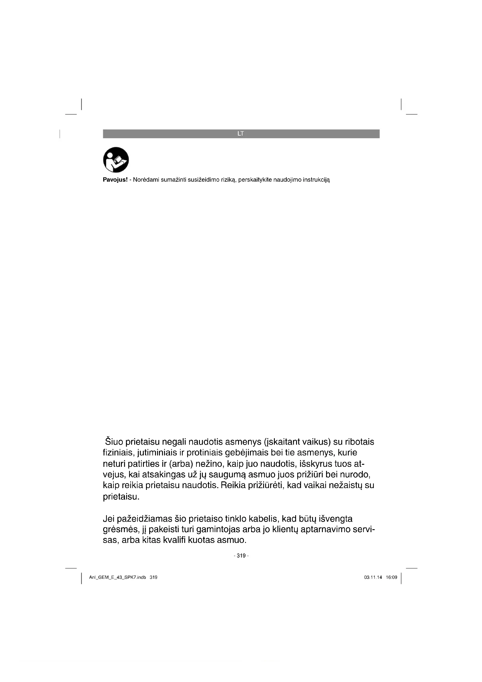 Pavojus! - Norėdami sumažinti susižeidimo riziką, perskaitykite naudojimo instrukciją Šiuo prietaisu negali naudotis asmenys (įskaitant vaikus) su ribotais fi ziniais, jutiminiais ir protiniais gebėjimais bei tie asmenys, kurie neturi patirties ir (arba) nežino, kaip juo naudotis, išskyrus tuos at- vejus, kai atsakingas už jų saugumą asmuo juos prižiūri bei nurodo, kaip reikia prietaisu naudotis. Reikia prižiūrėti, kad vaikai nežaistų su prietaisu. Jei pažeidžiamas šio prietaiso tinklo kabelis, kad būtų išvengta grėsmės, jį pakeisti turi gamintojas arba jo klientų aptarnavimo servi- sas, arba kitas kvalifi kuotas asmuo. Anl_GEM_E_43_SPK7.indb 319Anl_GEM_E_43_SPK7.indb 319 03.11.14 16:0903.11.14 16:09LT