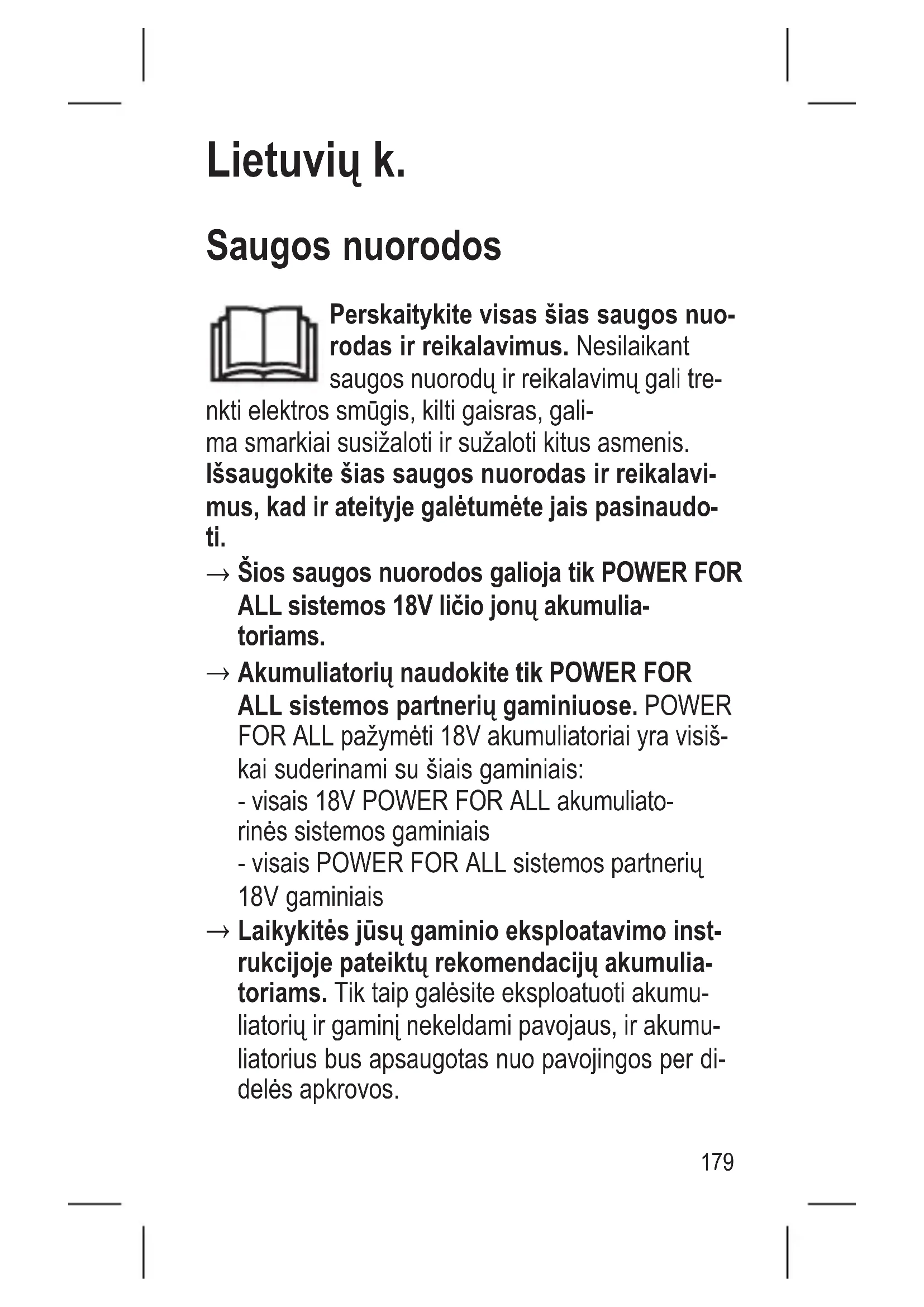 Laikykitėsjūsųgaminioeksploatavimoinst- rukcijojepateiktųrekomendacijųakumulia- toriams. Tiktaipgalėsiteeksploatuotiakumu- liatoriųirgaminįnekeldamipavojaus,irakumu- liatorius bus apsaugotas nuo pavojingos per di- delėsapkrovos. 179→ Akumuliatoriuiįkrautinaudokitetikgamin- tojo arba POWER FOR ALL sistemos partne- riųrekomenduojamuskroviklius. Naudojant kitokiotipoakumuliatoriamsskirtąįkroviklį,iš- kyla gaisro pavojus.