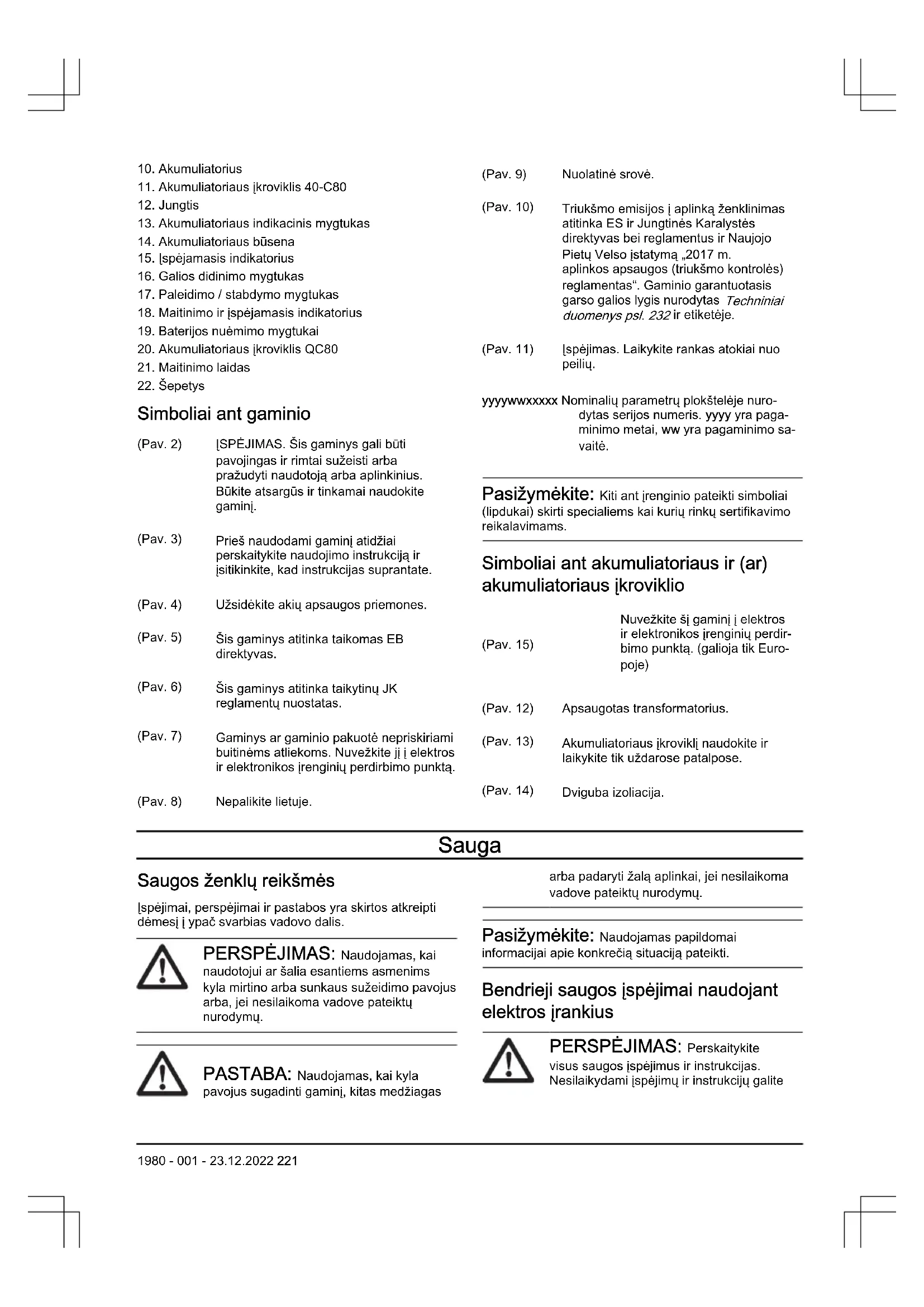 Simboliai ant gaminio (Pav. 2) ĮSPĖJIMAS. Šis gaminys gali būti pavojingas ir rimtai sužeisti arba pražudyti naudotoją arba aplinkinius. Būkite atsargūs ir tinkamai naudokite gaminį. (Pav. 3) Prieš naudodami gaminį atidžiai perskaitykite naudojimo instrukciją ir įsitikinkite, kad instrukcijas suprantate. (Pav. 4) Užsidėkite akių apsaugos priemones. (Pav. 5) Šis gaminys atitinka taikomas EB direktyvas. (Pav. 6) Šis gaminys atitinka taikytinų JK reglamentų nuostatas. (Pav. 7) Gaminys ar gaminio pakuotė nepriskiriami buitinėms atliekoms. Nuvežkite jį į elektros ir elektronikos įrenginių perdirbimo punktą. (Pav. 8) Nepalikite lietuje. (Pav. 9) Nuolatinė srovė. (Pav. 10) Triukšmo emisijos į aplinką ženklinimas atitinka ES ir Jungtinės Karalystės direktyvas bei reglamentus ir Naujojo Pietų Velso įstatymą „2017m. aplinkos apsaugos (triukšmo kontrolės) reglamentas“. Gaminio garantuotasis garso galios lygis nurodytas Techniniai duomenys psl. 232 ir etiketėje. (Pav. 11) Įspėjimas. Laikykite rankas atokiai nuo peilių. yyyywwxxxxx Nominalių parametrų plokštelėje nuro- dytas serijos numeris. yyyy yra paga- minimo metai, ww yra pagaminimo sa- vaitė. Pasižymėkite: Kiti ant įrenginio pateikti simboliai (lipdukai) skirti specialiems kai kurių rinkų sertifikavimo reikalavimams. Simboliai ant akumuliatoriaus ir (ar) akumuliatoriaus įkroviklio (Pav. 15) Nuvežkite šį gaminį į elektros ir elektronikos įrenginių perdir- bimo punktą. (galioja tik Euro- poje) (Pav. 12) Apsaugotas transformatorius. (Pav. 13) Akumuliatoriaus įkroviklį naudokite ir laikykite tik uždarose patalpose. (Pav. 14) Dviguba izoliacija. Sauga Saugos ženklų reikšmės Įspėjimai, perspėjimai ir pastabos yra skirtos atkreipti dėmesį į ypač svarbias vadovo dalis. PERSPĖJIMAS: Naudojamas, kai naudotojui ar šalia esantiems asmenims kyla mirtino arba sunkaus sužeidimo pavojus arba, jei nesilaikoma vadove pateiktų nurodymų. PASTABA: Naudojamas, kai kyla pavojus sugadinti gaminį, kitas medžiagas arba padaryti žalą aplinkai, jei nesilaikoma vadove pateiktų nurodymų. Pasižymėkite: Naudojamas papildomai informacijai apie konkrečią situaciją pateikti. Bendrieji saugos įspėjimai naudojant elektros įrankius PERSPĖJIMAS: Perskaitykite visus saugos įspėjimus ir instrukcijas. Nesilaikydami įspėjimų ir instrukcijų galite 1980 - 001 - 23.12.2022 221sukelti gaisrą, patirti elektros smūgį ir (arba) rimtai susižeisti. Pasižymėkite: Saugokite visus įspėjimus ir instrukcijas, nes jų gali prireikti vėliau. Terminas „elektros įrankis“ įspėjimuose reiškia iš elektros tinklo maitinamą (laidinį) elektros įrankį arba akumuliatoriumi maitinamą (belaidį) elektros įrankį. Sauga darbo vietoje