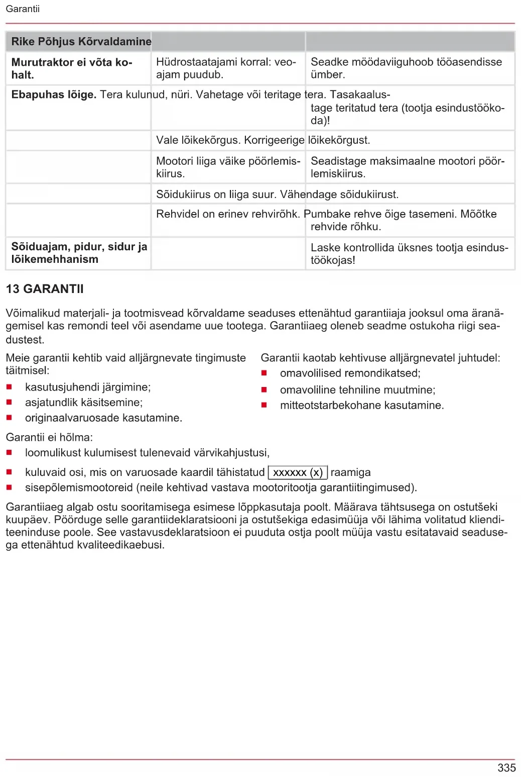 Pagalba atsiradus sutrikimų Sutrikimas Priežastis Šalinimas Variklis neužsiveda. Degalų trūkumas. Pripildykite baką, patikrinkite bako oro išleidimo angą ir degalų filtrą. Blogi, nešvarūs degalai, seni degalai bake. Visada naudokite šviežius degalus iš švarių rezervuarų. Išvalykite karbiurato- rių (klientų aptarnavimo tarnybos dirbtu- vės). Nešvarus oro filtras. Išvalykite oro filtrą (žr. variklio gamintojo pateiktą naudojimo instrukciją). Nėra uždegimo kibirkščių. Išvalykite, jei reikia, įstatykite naują už- degimo žvakę, patikrinkite uždegimo žvakę ir uždegimo sistemą (klientų ap- tarnavimo tarnybos dirbtuvės). Dėl kelių mėginimų užvesti per daug degalų variklio de- gimo kameroje. Išsukite ir nusausinkite uždegimo žvakę. Neveikia paleidiklis. Išeikvota arba silpna starterio akumuliatorių baterija. Įkraukite starterio akumuliatorių bateriją. Neveikia apsauginis jungiklis prie vairuotojo sėdynės. Tinkamai atsisėskite ant vairuotojo sė- dynės; jungiklis sugedęs. Neveikia apsauginis jungiklis prie stabdžio pedalo. Iki galo nuspauskite stabdžio pedalą. Pjovimo mechanizmas įjung- tas. Išjunkite pjovimo mechanizmą. Starterio akumuliatorių bate- rijos (+) kabelio saugiklis. Patikrinkite arba prireikus pakeiskite saugiklį. Mažėja variklio galia. Per aukšta arba per drėgna žolė. Pakoreguokite pjovimo aukštį; šiek tiek pavažiuokite atgal ir taip padarykite vie- tos pjovimo mechanizmui. Nešvarus oro filtras. Išvalykite oro filtrą (žr. variklio gamintojo pateiktą naudojimo instrukciją). Netinkama karbiuratoriaus padėtis. Paveskite patikrinti nustatymą (klientų aptarnavimo tarnybos dirbtuvės). Stipriai susidėvėjęs peilis. Pakeiskite peilį (klientų aptarnavimo tar- nybos dirbtuvės). Per didelis važiavimo greitis. Sumažinkite važiavimo greitį. Stipriai vibruoja vejos pjovimo traktorius. Pažeistas pjovimo mechaniz- mas. Patikrinkite pjovimo mechanizmą (klien- tų aptarnavimo tarnybos dirbtuvės). Vejos pjovimo traktorius nepradeda važiuoti. Esant hidrostatinei pavarai: nėra važiavimo pavaros. Perjunkite apvedimo svirtį į darbinę pa- dėtį. Netolygiai pjaunama. Susidėvėję, nešvarūs peiliai. Pakeiskite arba pagaląskite peilius. Pa- galąstus peilius subalansuokite (klientų aptarnavimo tarnybos dirbtuvės)! Netinkamas pjovimo aukštis. Pakoreguokite pjovimo aukštį.353 Garantija Sutrikimas Priežastis Šalinimas Per mažas variklio sūkių skaičius. Nustatykite maksimalų variklio sūkių skaičių. Per didelis važiavimo greitis. Sumažinkite važiavimo greitį. Skirtingas padangų slėgis ra- tuose. Pripūskite iki tinkamo oro slėgio. Pažiū- rėkite padangoje, ar tinkamas jos slėgis. Važiavimo pavara, stab- dys, sankaba ir pjovimo mechanizmas. Paveskite patikrinti tik klientų aptarnavi- mo tarnybos dirbtuvėms! 13 GARANTIJA Galimus įrenginio medžiagų ar gamybos defektus įstatymų numatytu pretenzijų dėl trūkumų reiškimo senaties termino laikotarpiu mes šaliname savo nuožiūra remonto arba keitimo būdu. Senaties termi- nas nustatomas kiekvienu konkrečiu atveju pagal šalies, kurioje įrenginys buvo įsigytas, teisės aktus. Mūsų garantinis įsipareigojimas galioja tik šiais atvejais: