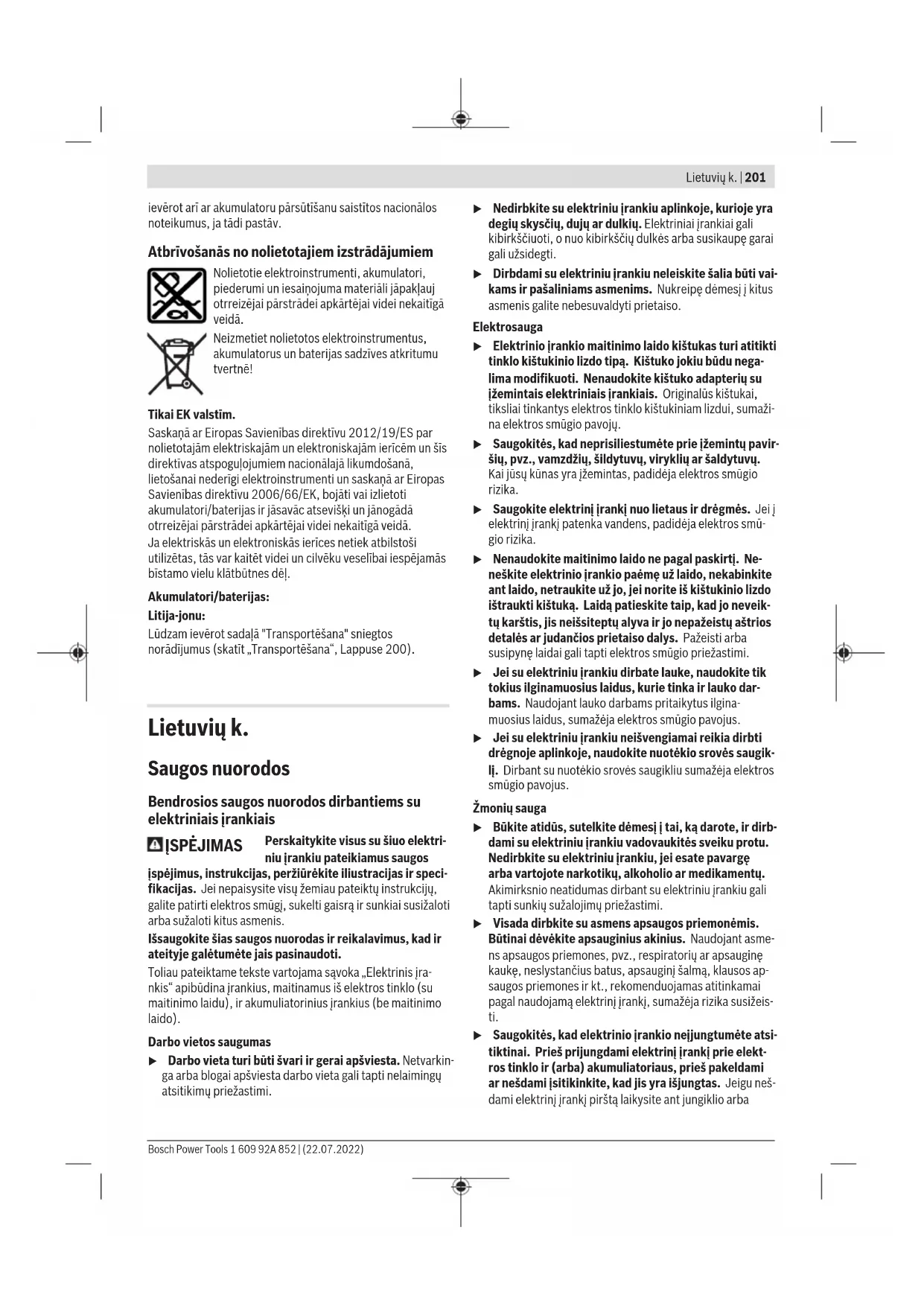 Šioje instrukcijoje pateiktas vibracijos lygis ir triukšmo emisi- ja buvo išmatuoti pagal standartizuotą matavimo metodą, ir juos galima naudoti elektriniams įrankiams palyginti. Jie taip pat skirti vibracijos ir triukšmo emisijai iš anksto įvertinti. Nurodytas vibracijos lygis ir triukšmo emisijos vertė atspindi pagrindinius elektrinio įrankio naudojimo atvejus. Tačiau jei- gu elektrinis įrankis naudojamas kitokiai paskirčiai, su kito- kiais darbo įrankiais arba jeigu jis nepakankamai techniškai prižiūrimas, vibracijos lygis ir triukšmo emisijos vertė gali ki- sti. Tokiu atveju vibracijos ir triukšmo emisija per visą darbo laikotarpį gali žymiai padidėti. Norint tiksliai įvertinti vibracijos ir triukšmo emisiją per tam tikrą darbo laiką, reikia atsižvelgti ir į laiką, per kurį elektrinis įrankis buvo išjungtas arba, nors ir veikė, bet nebuvo naudo- jamas. Tai įvertinus, vibracijos ir triukšmo emisija per visą darbo laiką žymiai sumažės. Dirbančiajam nuo vibracijos poveikio apsaugoti paskirkite papildomas apsaugos priemones, pvz.: elektrinių ir darbo įrankių techninę priežiūrą, rankų šildymą, darbo eigos orga- nizavimą. Akumuliatorius Akumuliatoriaus įkrovimas u Naudokite tik techninių duomenų skyriuje nurodytus kroviklius. Tik šie krovikliai yra priderinti prie Jūsų elekt- riniame prietaise naudojamo ličio jonų akumuliatoriaus. Nuoroda: laikantis tarptautinių transportavimo teisės aktų, ličio jonų akumuliatoriai tiekiami dalinai įkrauti. Kad akumu- liatorius veiktų visa galia, prieš pirmąjį naudojimą akumulia- torių visiškai įkraukite. Akumuliatoriaus įdėjimas Įkrautą akumuliatorių stumkite į akumuliatoriaus laikiklį, kol pajusite, kad užsifiksavo. Akumuliatoriaus išėmimas Norėdami išimti akumuliatorių, paspauskite akumuliatoriaus atblokavimo klavišus ir išimkite akumuliatorių. Traukdami nenaudokite jėgos. Akumuliatoriaus įkrovos būklės indikatorius Akumuliatoriaus įkrovos būklės indikatorius, kai yra pusiau arba visiškai paspaustas įjungimo-išjungimo jungiklis, kelias sekundes rodo akumuliatoriaus įkrovos būklę. LED Talpa Šviečia nuolat 3מali 75–100% Šviečia nuolat 2מali 40–75% Šviečia nuolat 1מalias 15–40% Lėtai mirksi 1מalias 0–15% 3 LED įkrovos būklės indikatoriai mirksi greitai, jei suveikė apsauga nuo perkrovos. Jei greitai mirksi tik vidurinis LED, vadinasi akumuliatoriaus arba elektrinio įrankio temperatūra yra už darbinės temperatūros diapazono ribų. Palaukite, kol akumuliatorius ir elektrinis įrankis atvės. Nuorodos, kaip optimaliai elgtis su akumuliatoriumi Saugokite akumuliatorių nuo drėgmės ir vandens. 1 609 92A 852 | (22.07.2022) Bosch Power ToolsLietuvių k. | 205 Akumuliatorių sandėliuokite tik nuo −20°C iki 50°C tem- peratūroje. Pvz., nepalikite akumuliatoriaus vasarą automo- bilyje. Akumuliatoriaus ventiliacines angas valykite minkštu, švariu ir sausu teptuku. Pastebimas įkrauto akumuliatoriaus veikimo laiko sutrumpė- jimas rodo, kad akumuliatorius susidėvėjo ir jį reikia pakeisti. Laikykitės pateiktų šalinimo nurodymų. Montavimas u Prieš atliekant bet kokius elektrinio įrankio priežiūros darbus (atliekant techninę priežiūrą ar keičiant įrankį ir t. t.), o taip pat elektrinį įrankį transportuojant ir sandėliuojant, būtina iš jo išimti akumuliatorių. Prie- šingu atveju galite susižeisti, netyčia nuspaudę įjungimo- išjungimo jungiklį. Pagalbinė rankena u Papildoma rankena visada tvirtai užveržta. Priešingu atveju dirbdami galite nebesuvaldyti elektrinio įrankio. Papildomos rankenos pasukimas (žr.Apav.) Papildomą rankeną (15) galite pasukti taip, kad darbo padė- tis būtų kuo saugesnė ir mažiausia varginanti. – Atsukite papildomos rankenos(15) sparnuotąjį varžtą(14) ir palenkite papildomą rankeną(15) į norimą padėtį. Tvirtai užveržkite papildomos rankenos(15) spar- nuotąjį varžtą(14). Atkreipkite dėmesį, kad papildomos rankenos užveržia- masis žiedas būtų specialiame, korpuse esančiame grio- velyje. Griebtuvo ir įrankio parinkimas Norint gręžti su smūgiu ir kirsti, reikia SDSplus įrankių, ku- riuos būtų galima įstatyti į SDSplus griebtuvą. Norint gręžti be smūgio medienoje, metale, keramikoje ir plastike bei norint sukti varžtus, reikia naudoti ne SDSplus sistemos įrankius (pvz., grąžtus su cilindriniu kotu). Šiems įrankiams reikia vainikinio griebtuvo. Nuoroda: vainikinį griebtuvą naudokite tik pasirinkus veiki- mo režimą Gręžti be smūgio. Griebtuvo keitimas Vainikinio griebtuvo įdėjimas ir išėmimas Norėdami dirbti su įrankiais be SDS-plus (pvz., grąžtu su ci- lindriniu kotu), turite uždėti specialų griebtuvą (vainikinį arba greitojo užveržimo griebtuvą papildoma įranga). Vainikinio griebtuvo įdėjimas (žr.Bpav.) – Nuvalykite kotelio(18) įstatomąjį galą ir truputį patep- kite. – Vainikinį griebtuvą(17) su koteliu(18) sukite į įrankių įtvarą, kol jis savaime užsifiksuos. – Patikrinkite, ar užsifiksavo, t. y. vainikinį griebtuvą(17) patraukite. Įrankių keitimas Apsauginis nuo dulkių gaubtelis (3) neleidžia gręžimo metu kylančioms dulkėms patekti į įrankių įtvarą. Įdėdami įrankius saugokite, kad nepažeistumėte apsauginio nuo dulkių gaub- telio (3). u Pažeistą apsauginį nuo dulkių gaubtelį būtina nedel- siant pakeisti. Tai atlikti rekomenduojame remonto tarnyboje. Įrankio keitimas (SDS-plus) SDS-plus darbo įrankio įstatymas (žr. C1 pav.) Su SDS-plus griebtuvu nenaudodami papildomų įrankių gali- te lengvai ir patogiai pakeisti darbo įrankį. – Darbo įrankį nuvalykite ir jo įstatomąjį galą šiek tiek pate- pkite. – Darbo įrankį sukdami stumkite į įrankių įtvarą, kol jis sa- vaime užsirakins. – Patraukę įrankį atgal, patikrinkite, ar jis tinkamai užsifik- savo. SDS-plus darbo įrankis turi turėti laisvumo. Todėl sukda- masis tušči